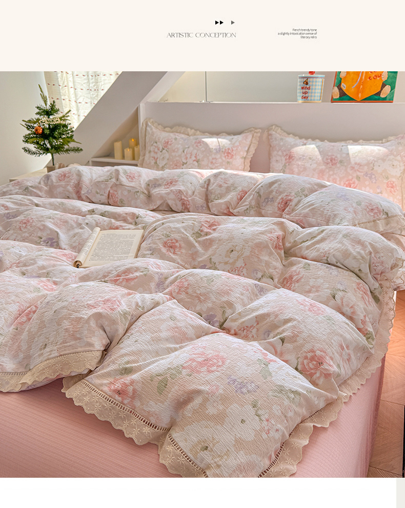 当前位置: 91家纺网 > 商品网购 > 床品套件 > 四件套 > 双层纱四件套 > 温眠家纺 2025直播新款云感双层纱镂空花边四件套 絮语