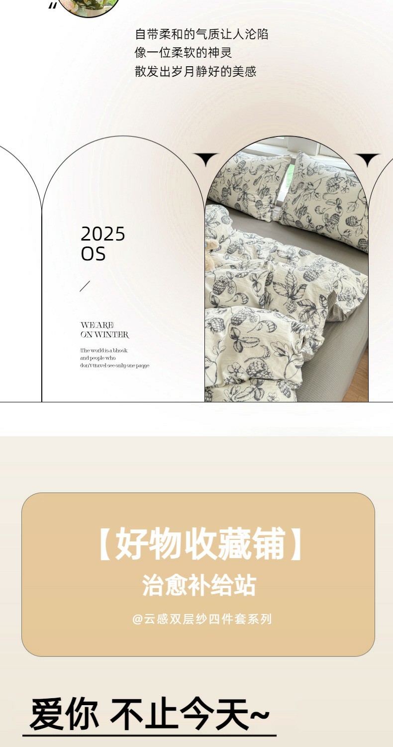 (总)温眠家纺 2026新款敲可爱的奶呼呼云感双层纱简约四件套系列-超级治愈~,裙子小兔,暗夜玫瑰,大脸二胡猫-粉,大脸二胡猫-咖,大脸二胡猫-蓝,蛋糕派,动物游园,蝴蝶剪影,见花则喜,焦糖樱桃,镜子里的兔,蓝莓奶糖,铃兰结,六子棋-绿,木马,奶昔甜糕,苹果小怪,葡萄多多,俏皮狗,切块草莓猫,清风与雾-蓝,苏瑾,童年木马,像素小猫,烟紫,一口青苹果,樱桃奶球,竹歆花语