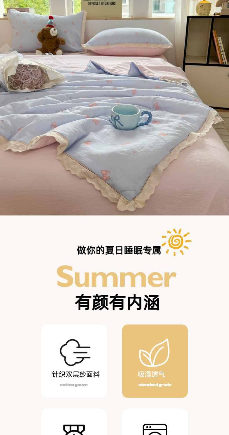 温眠家纺 2025新款云感双层纱镂空花边夏被四件套 清新蝴蝶结