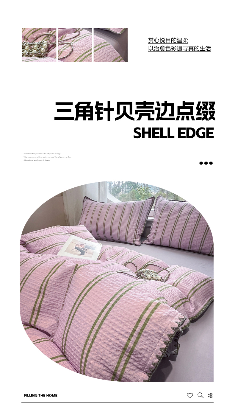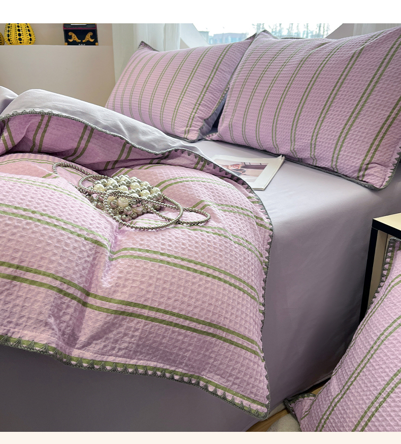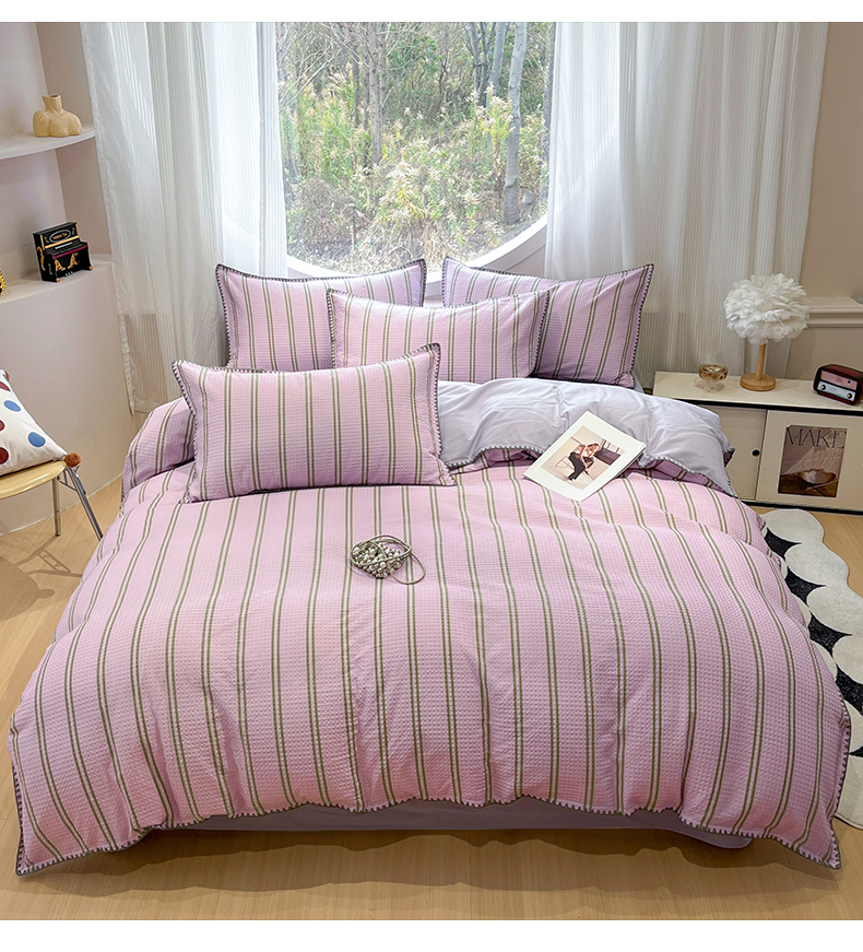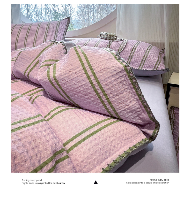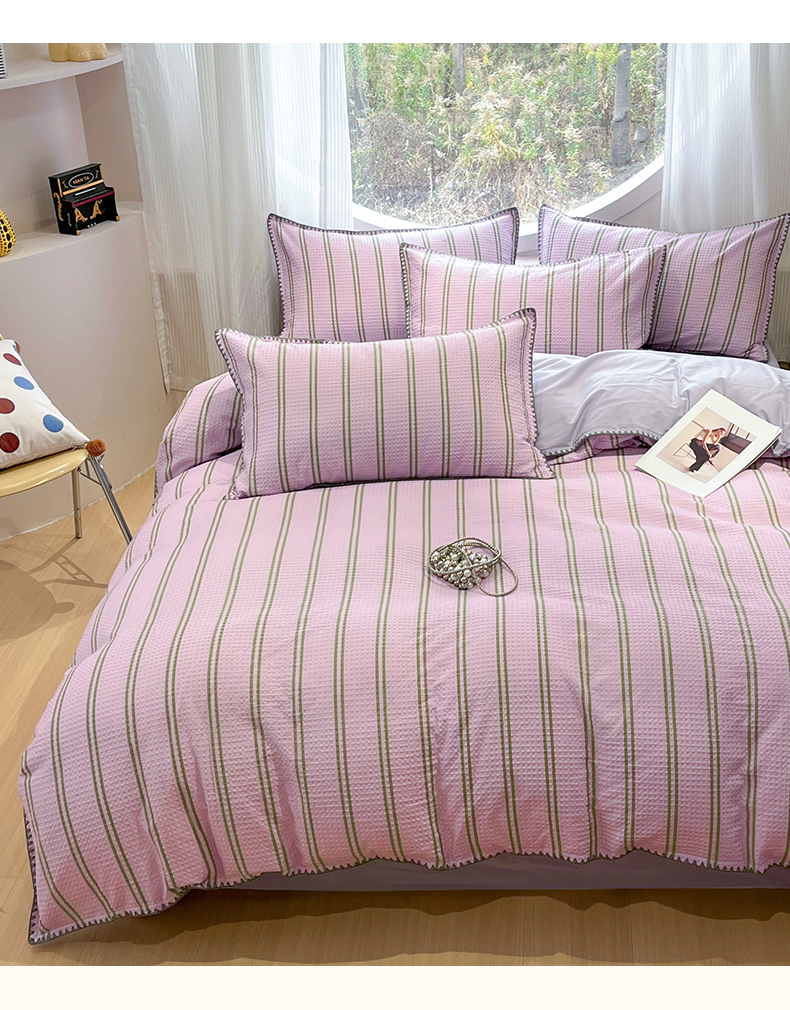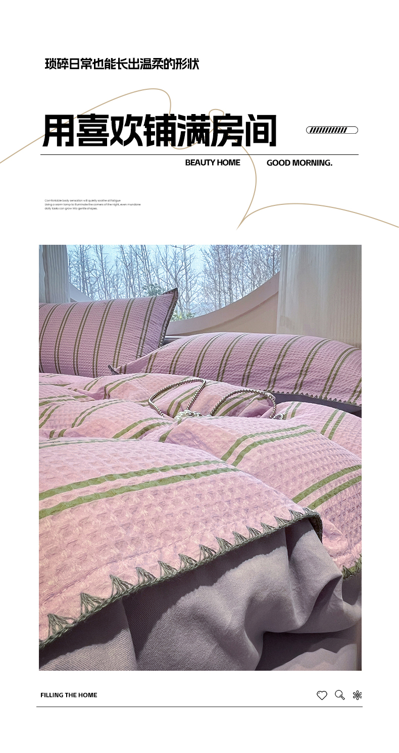 当前位置: 91家纺网 > 商品网购 > 床品套件 > 四件套 > 全棉普通四件套 > 莱茵家居 2026新款A类全棉华夫格印花贝壳边套件-华夫系列 华夫-树莓