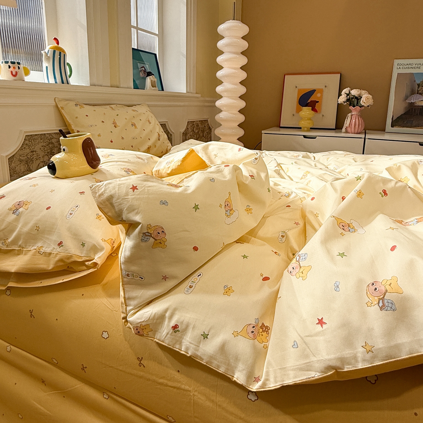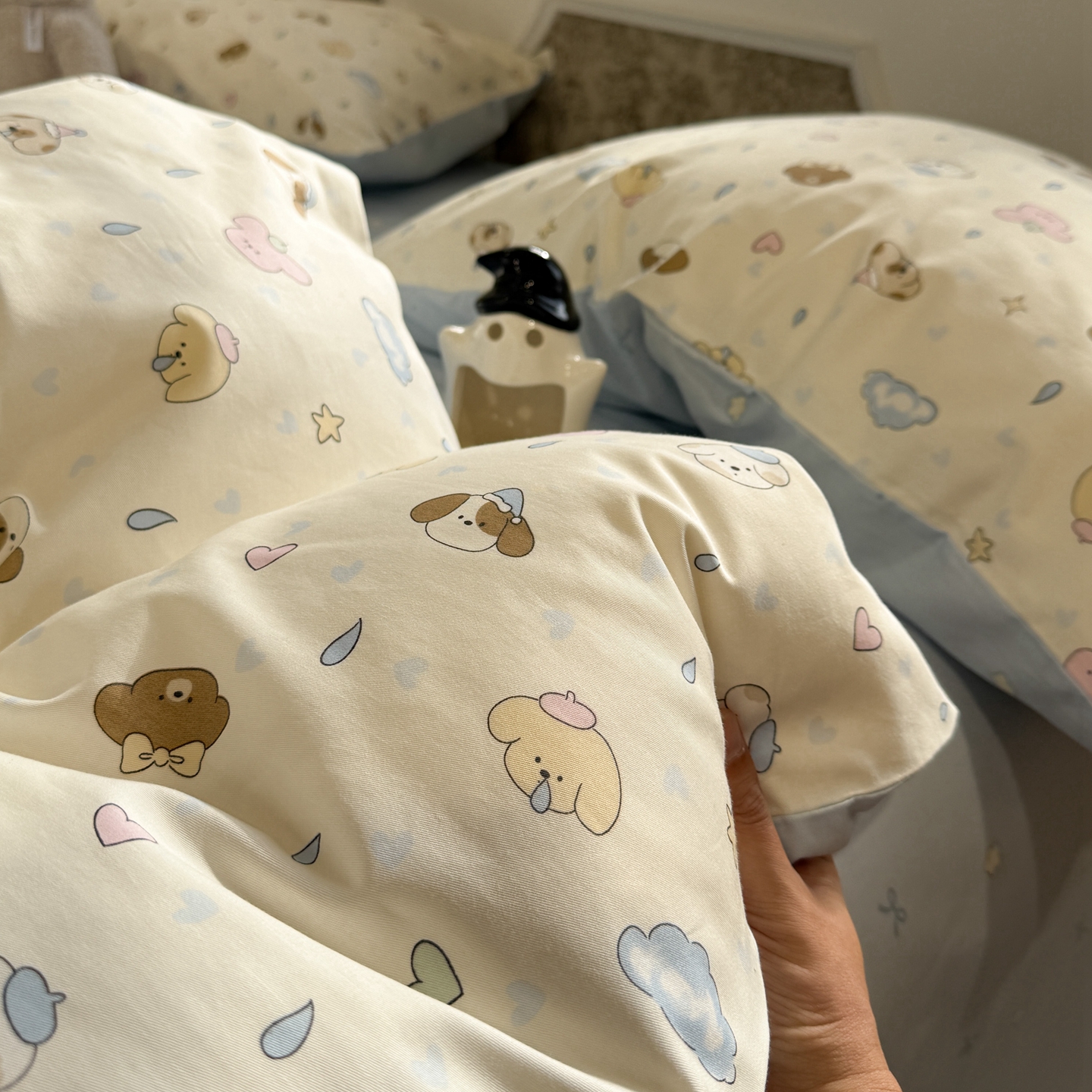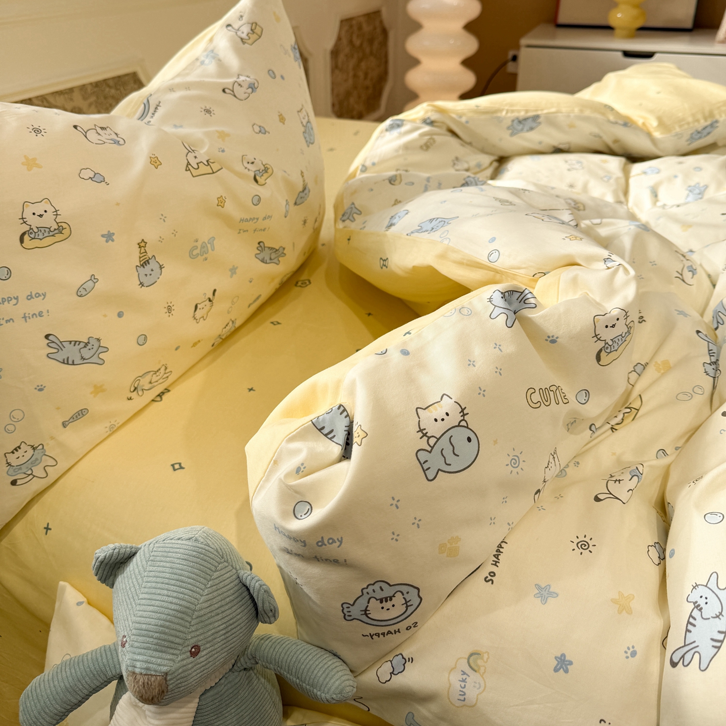 当前位置: 91家纺网 > 商品网购 > 床品套件 > 四件套 > 全棉普通四件套 > 呗旺鹿 2026新款全棉纯棉40支13070卡通印花四件套-场景二 机灵猫