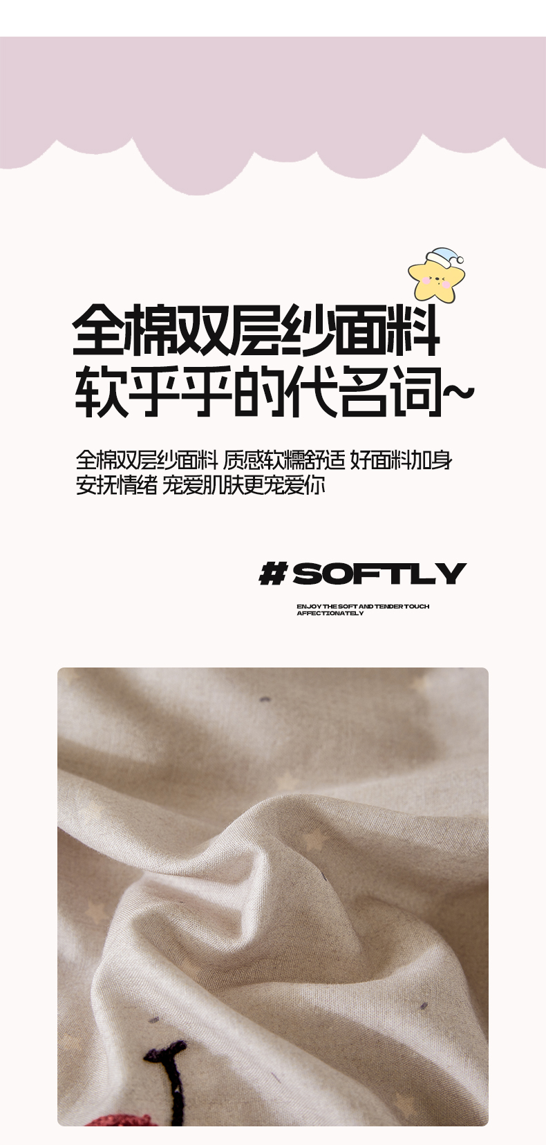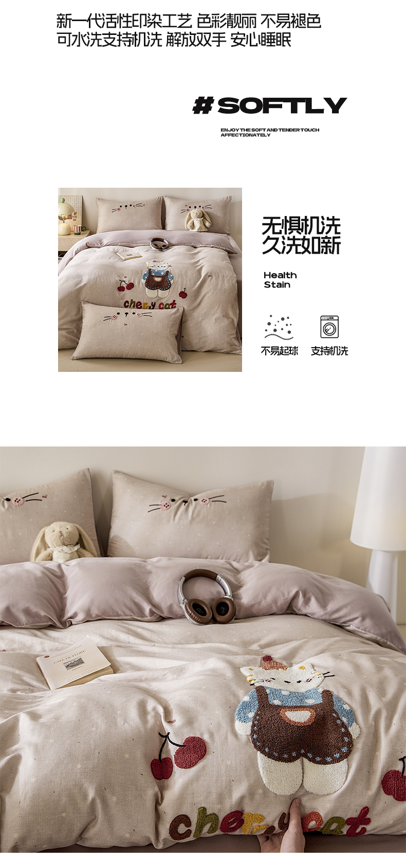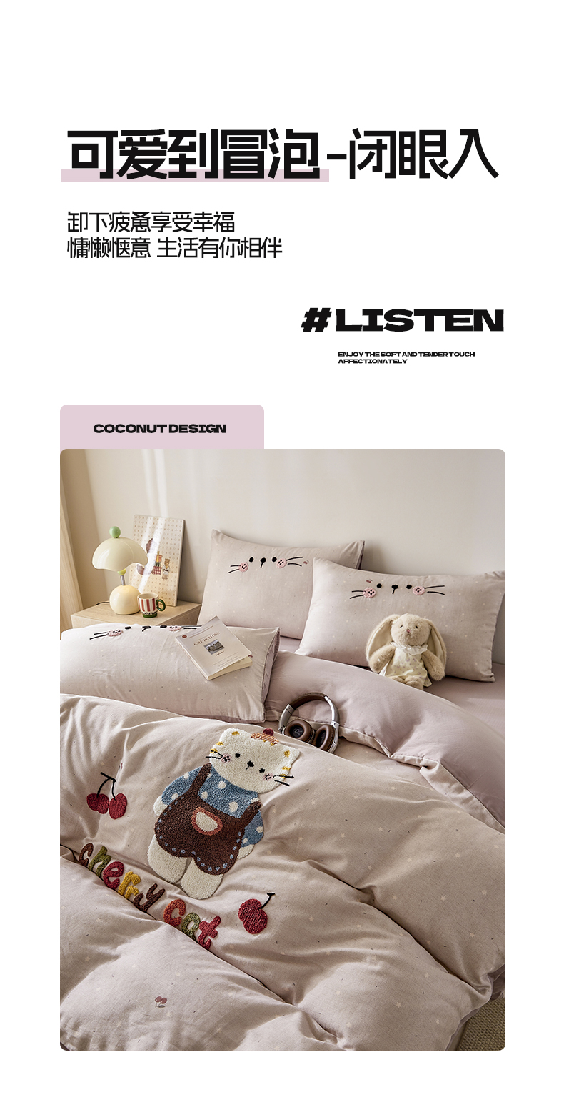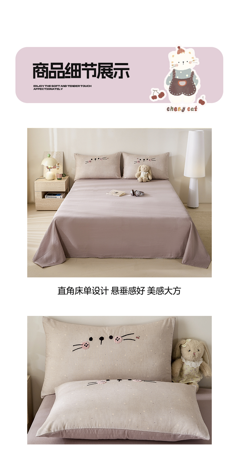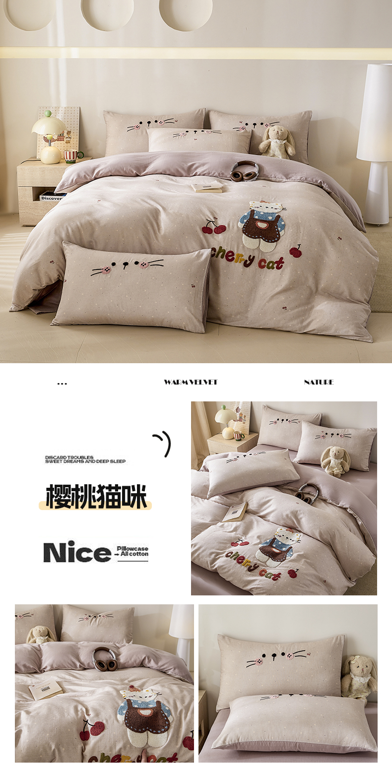 商品名称:宜家坊 2026新款A类全棉双层纱毛巾绣四件套 樱桃猫咪