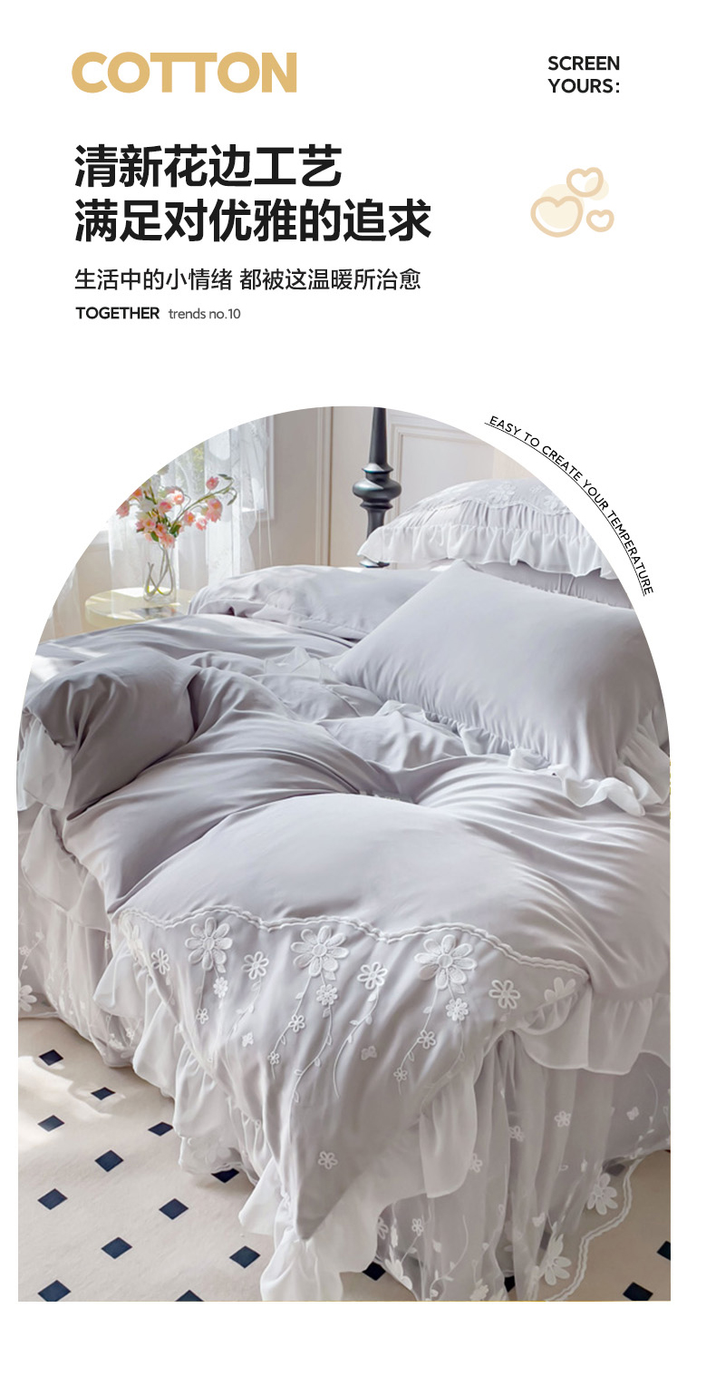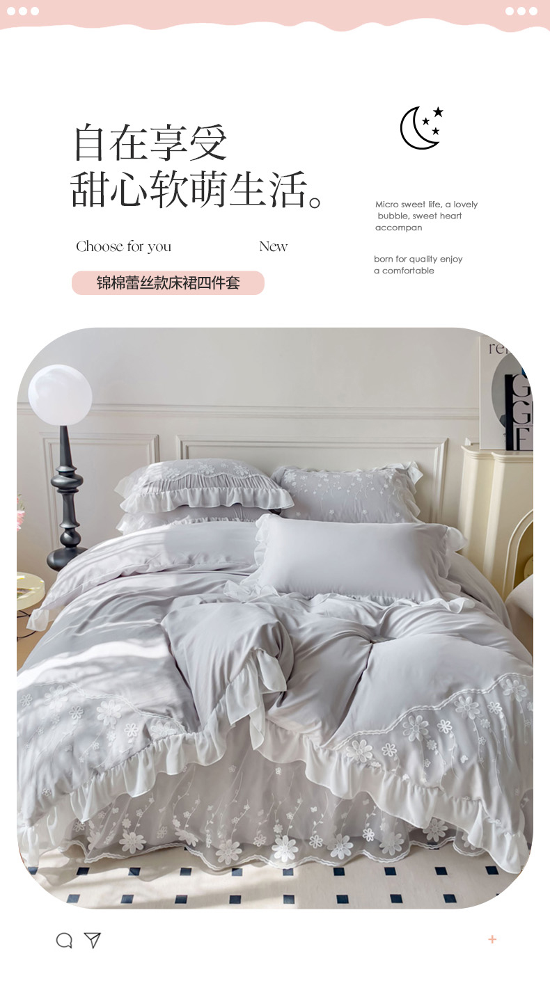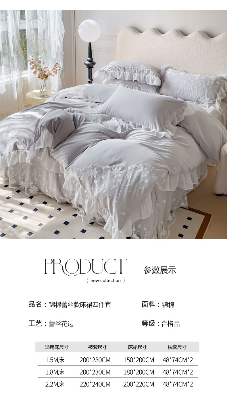 商品名称:睡美人 2026新款锦棉蕾丝款系列韩版公主风床裙四件套-花舞 花舞-香槟灰