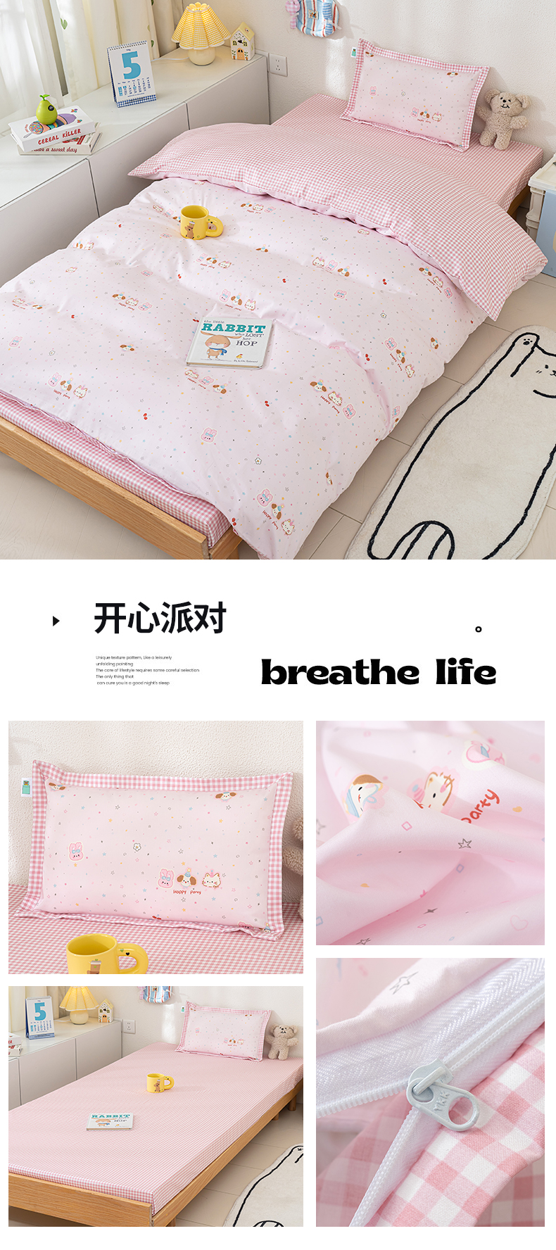 (总)良佐生活 2026年新款A类铂金精梳全棉学生三件套,甜心熊,挖机小分队,调皮象,福宝,乐兔粉,布布,太空探险,乐兔蓝