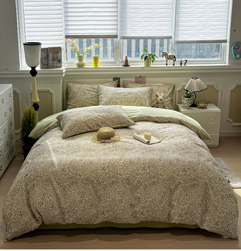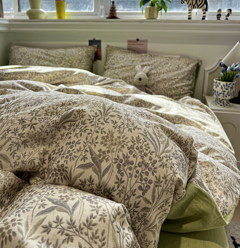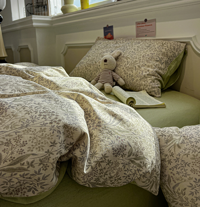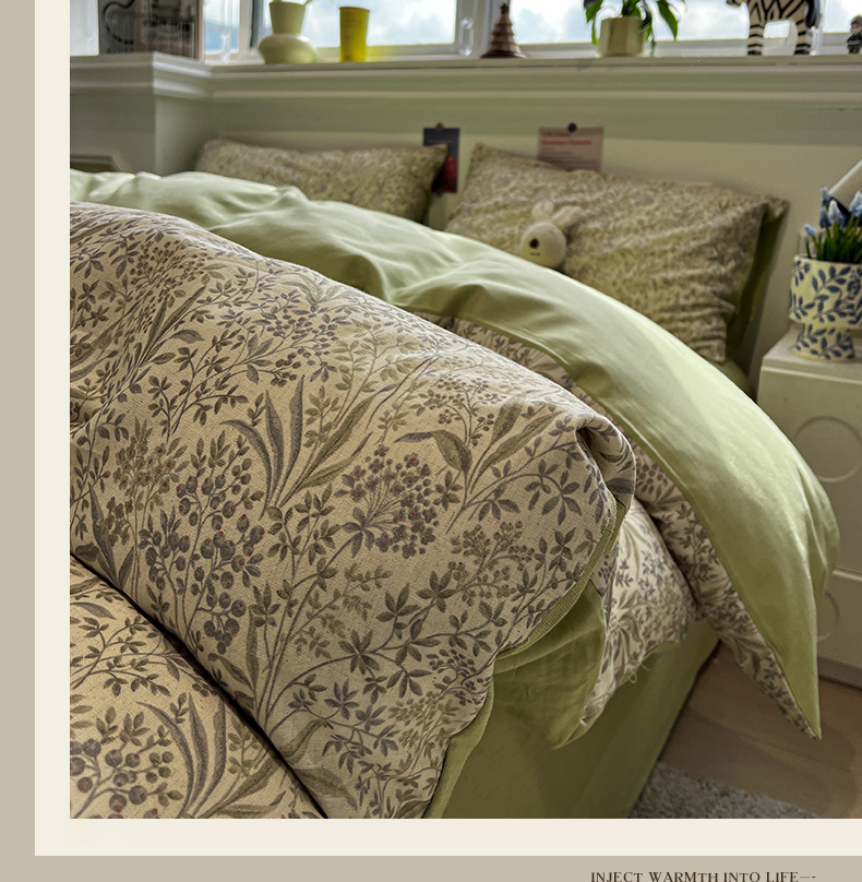 忆生活家纺 2026新款复古田园风棉麻四件套 绿茵-绿