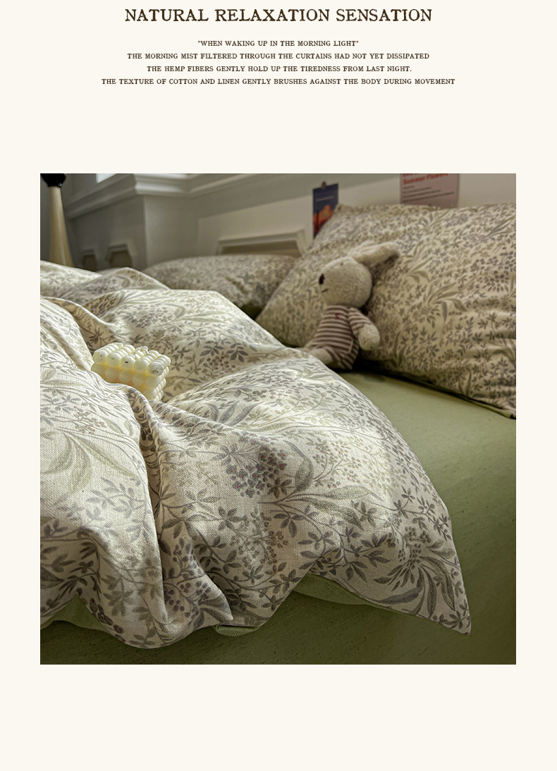 商品名称:忆生活家纺 2026新款复古田园风棉麻四件套 绿茵-绿