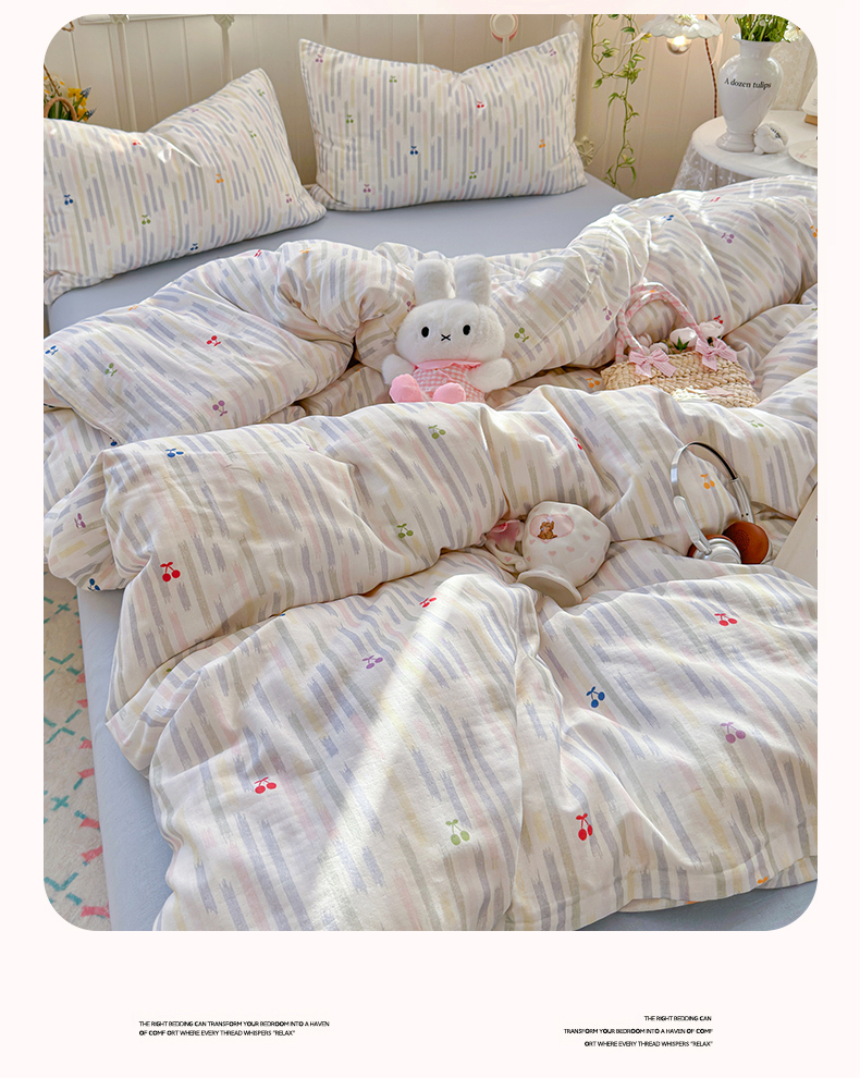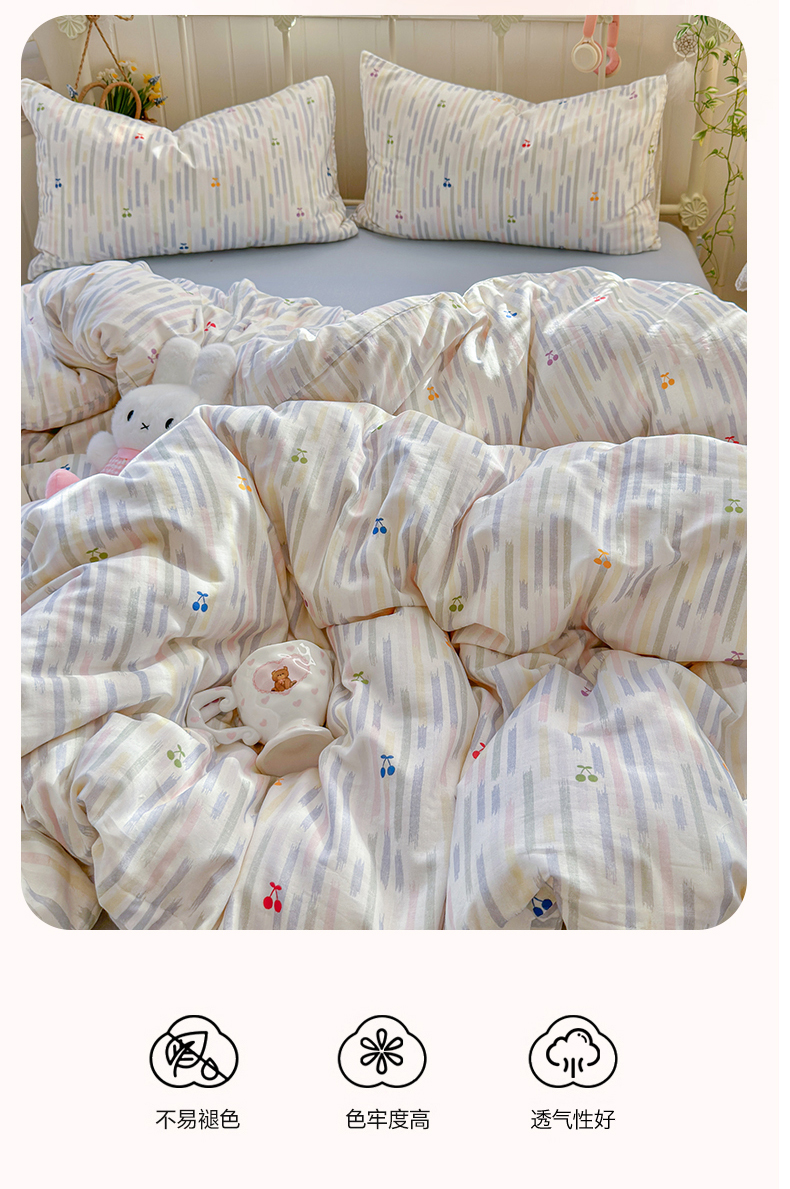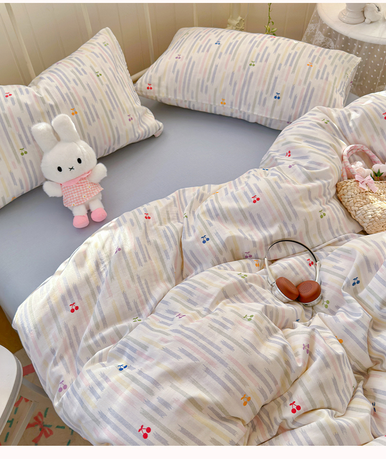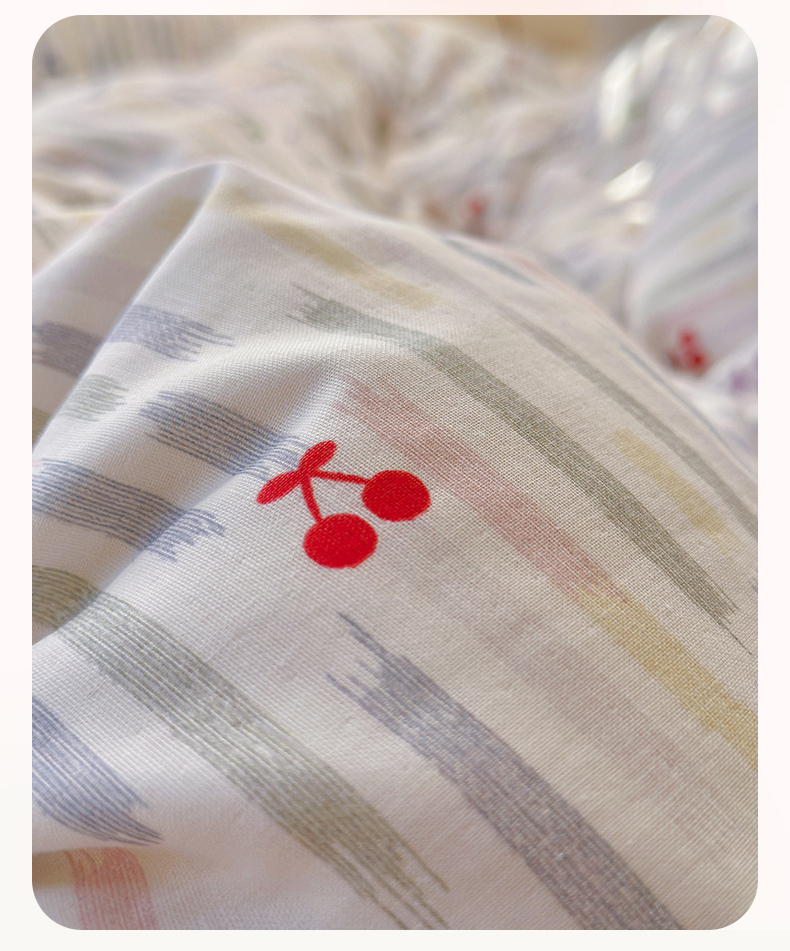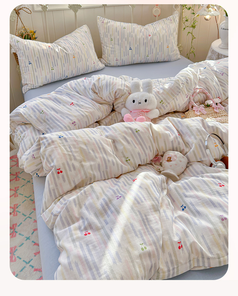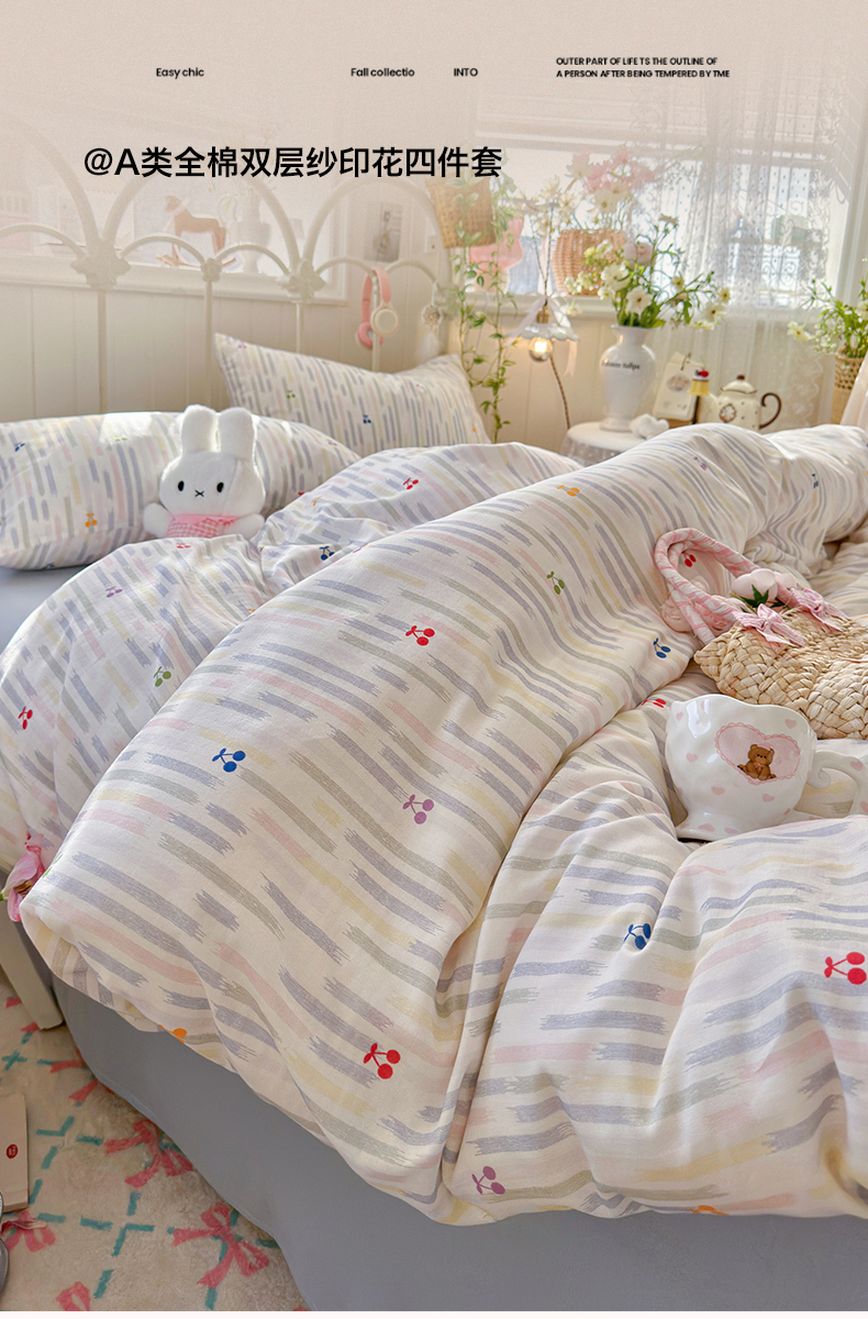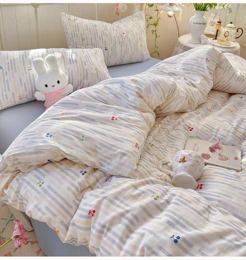 当前位置: 91家纺网 > 商品网购 > 床品套件 > 四件套 > 全棉普通四件套 > 名兮家居 2026春夏新款全棉纯棉A类双层纱四件套 双层纱-彩条樱桃