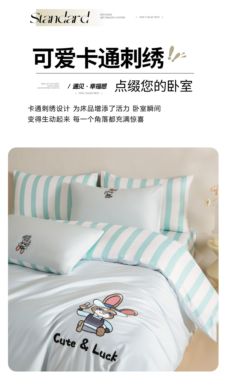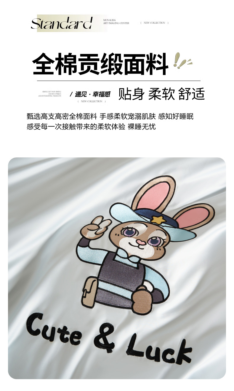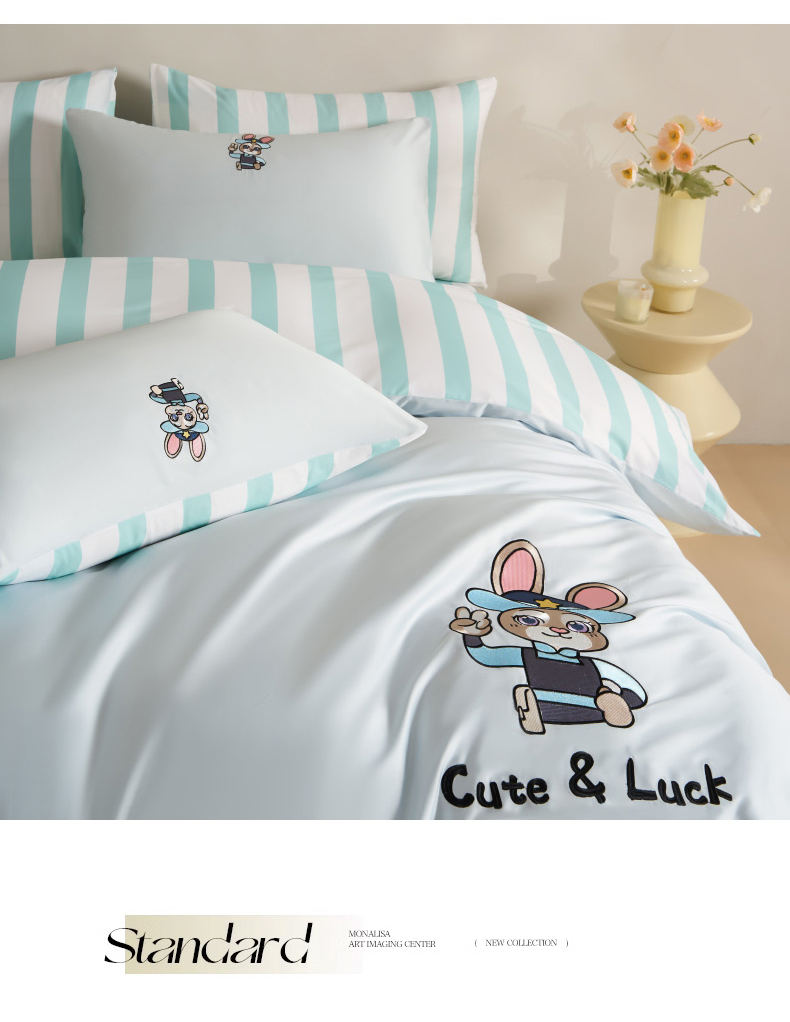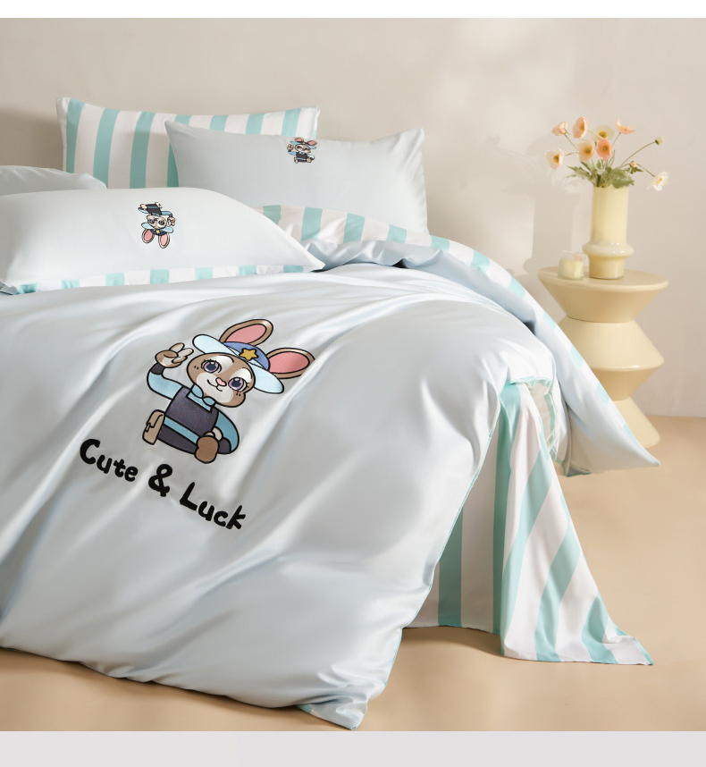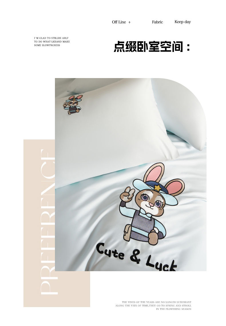 当前位置: 91家纺网 > 商品网购 > 床品套件 > 四件套 > 全棉普通四件套 > 慕尚家纺 2026春夏新款全棉纯棉50s贡缎绣花四件套 兔警官蓝