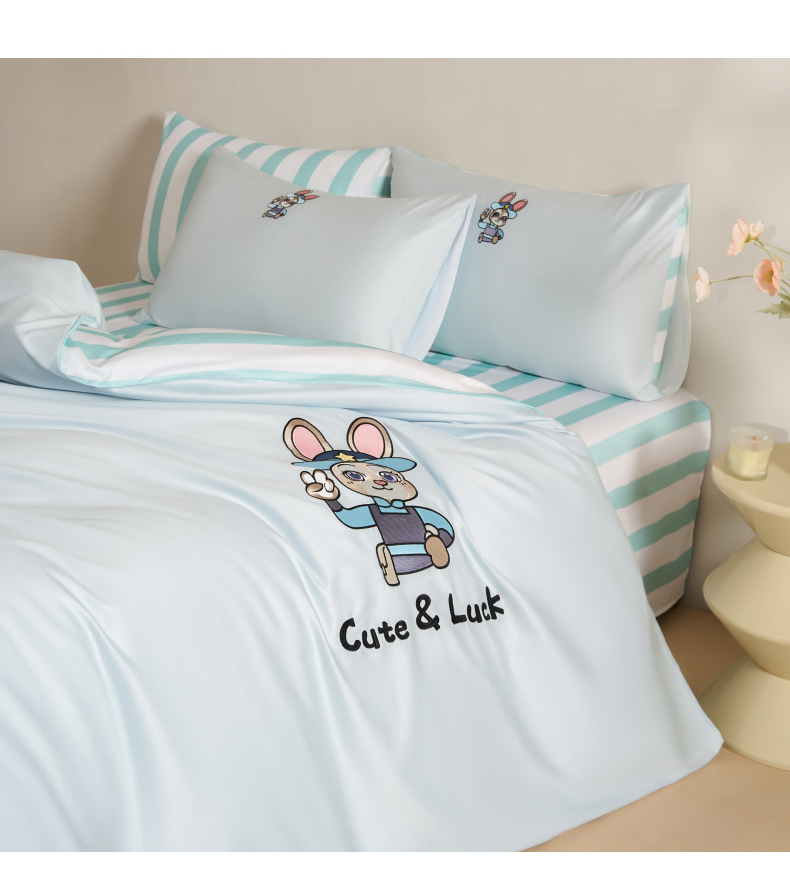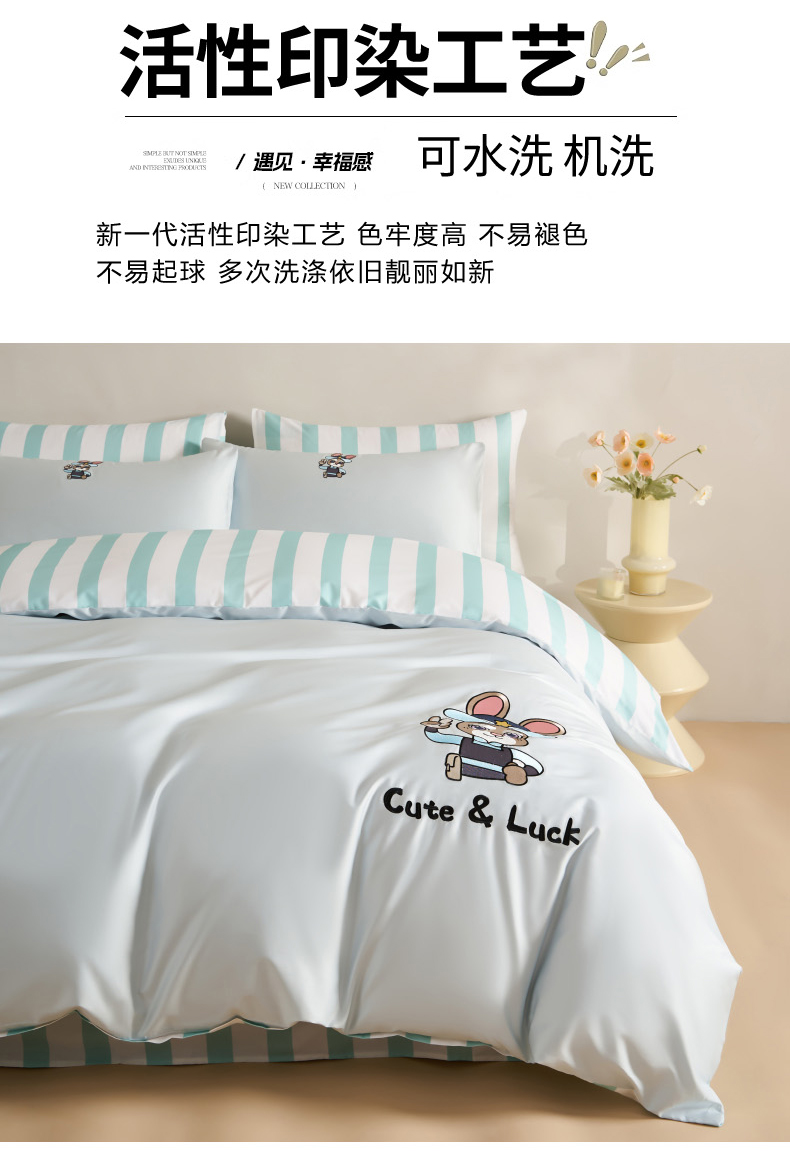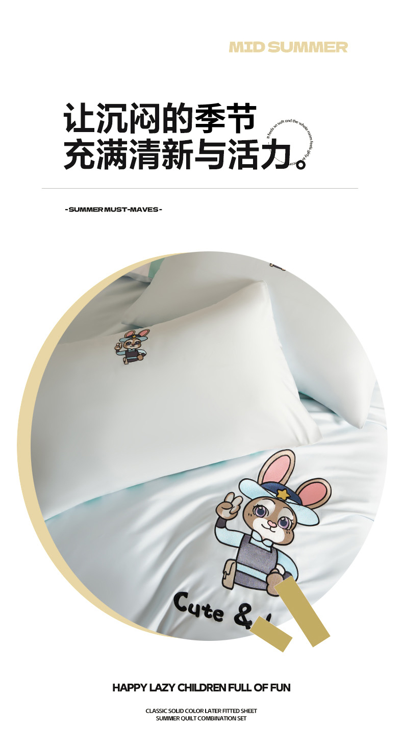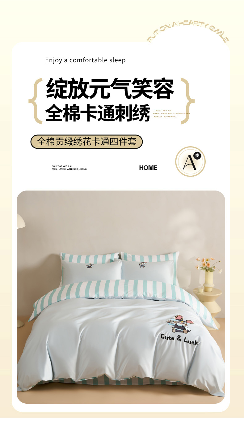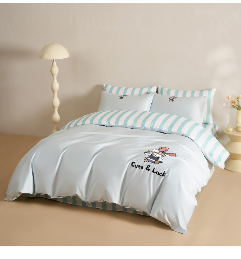 当前位置: 91家纺网 > 商品网购 > 床品套件 > 四件套 > 全棉普通四件套 > 慕尚家纺 2026春夏新款全棉纯棉50s贡缎绣花四件套 兔警官蓝