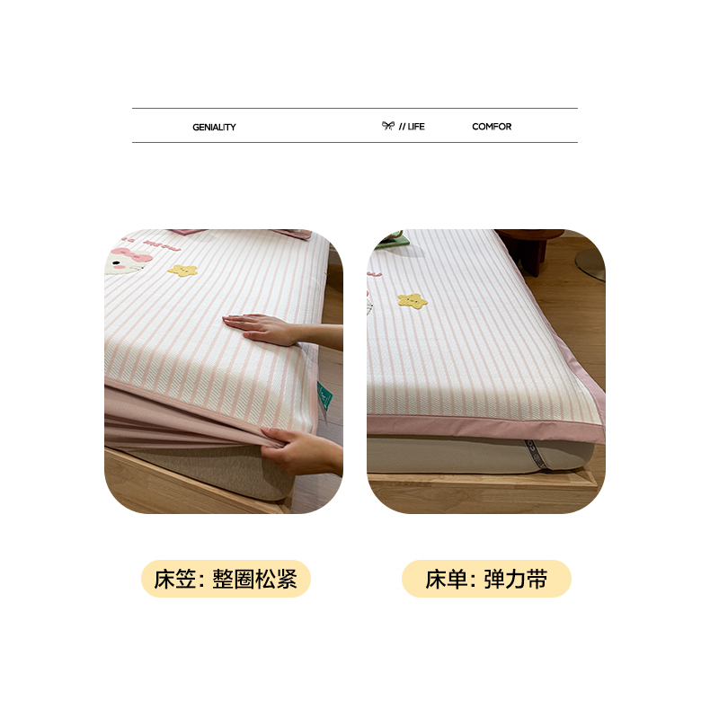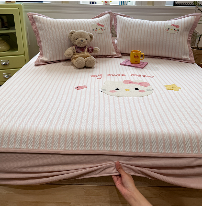 (总)雅居纺家纺 2026新款PE凉感卡通床裙床盖凉席韩版花边加厚三明治底PE凉感席,粉色猫咪家族,粉色星星腊肠狗,萌萌苹安果,汪星人,夏日苹果狗,幸运酷熊