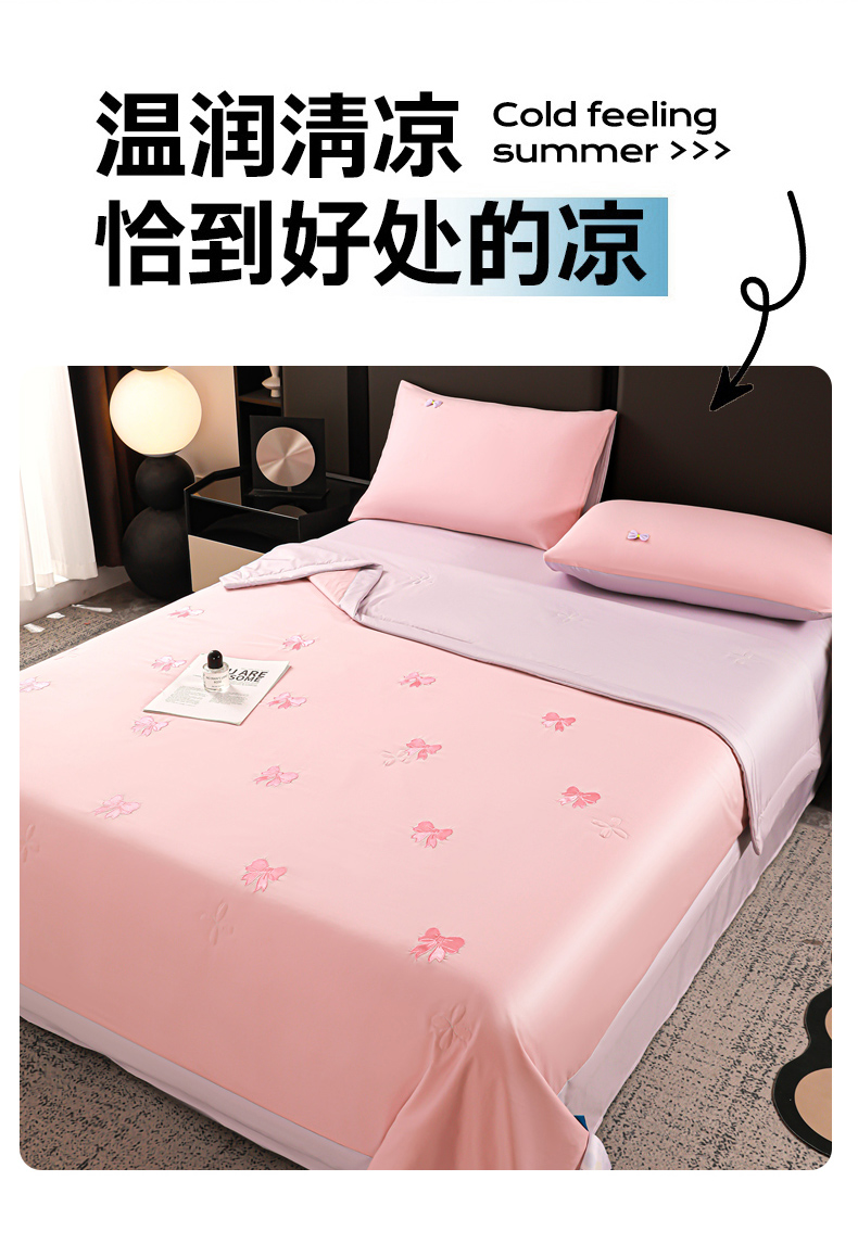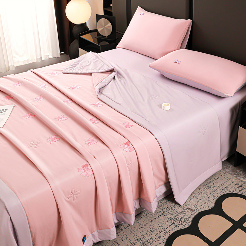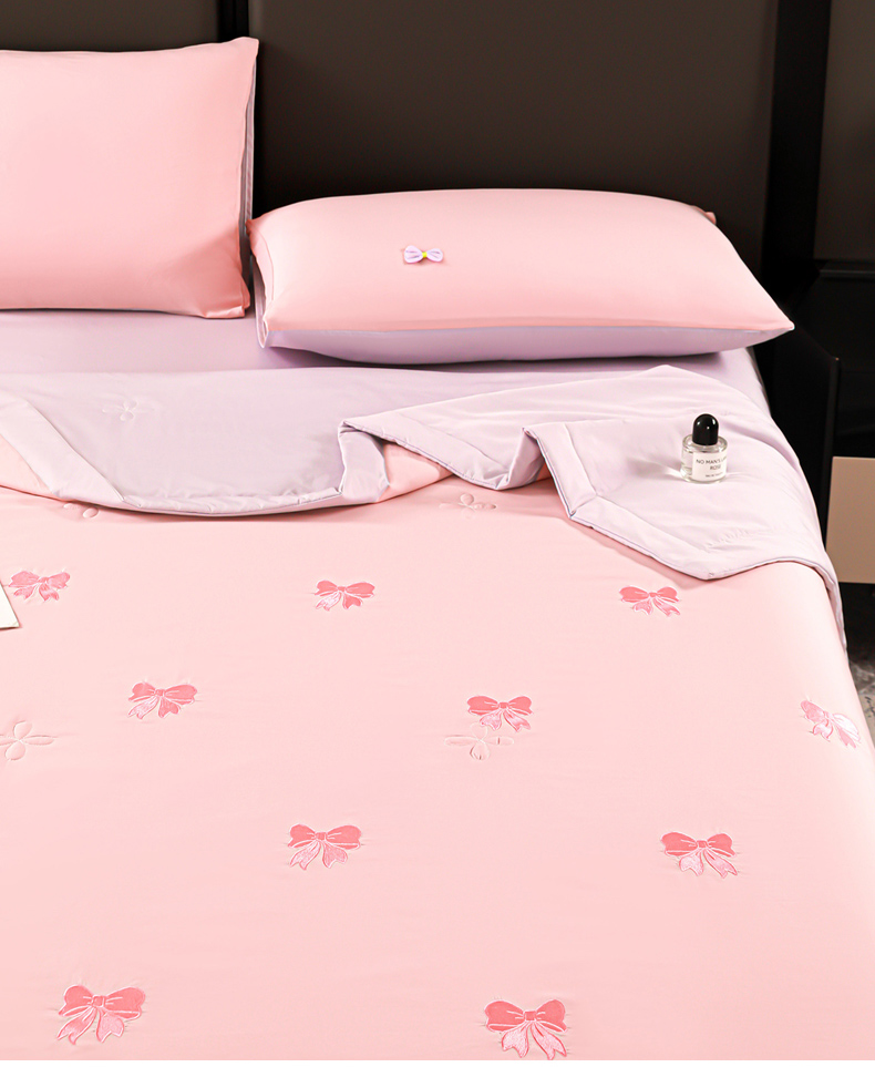 • 91家纺网 家纺一手货源 找家纺 佳鸿家纺 2026新款A类凉感冰柔丝刺绣手包边夏凉被夏被四件套 提供质检报告 粉紫蝴蝶结