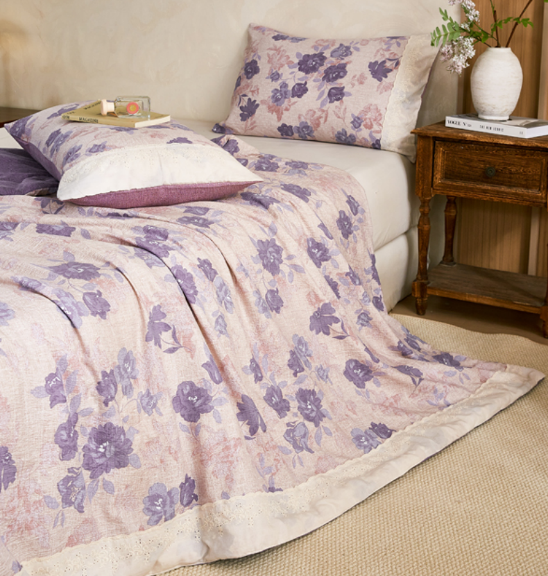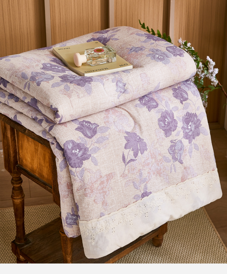 圣比熊 2026新款A类夏天原麻全棉蕾丝花边加厚夏被宿舍双人床仿亚麻被子被芯 安紫