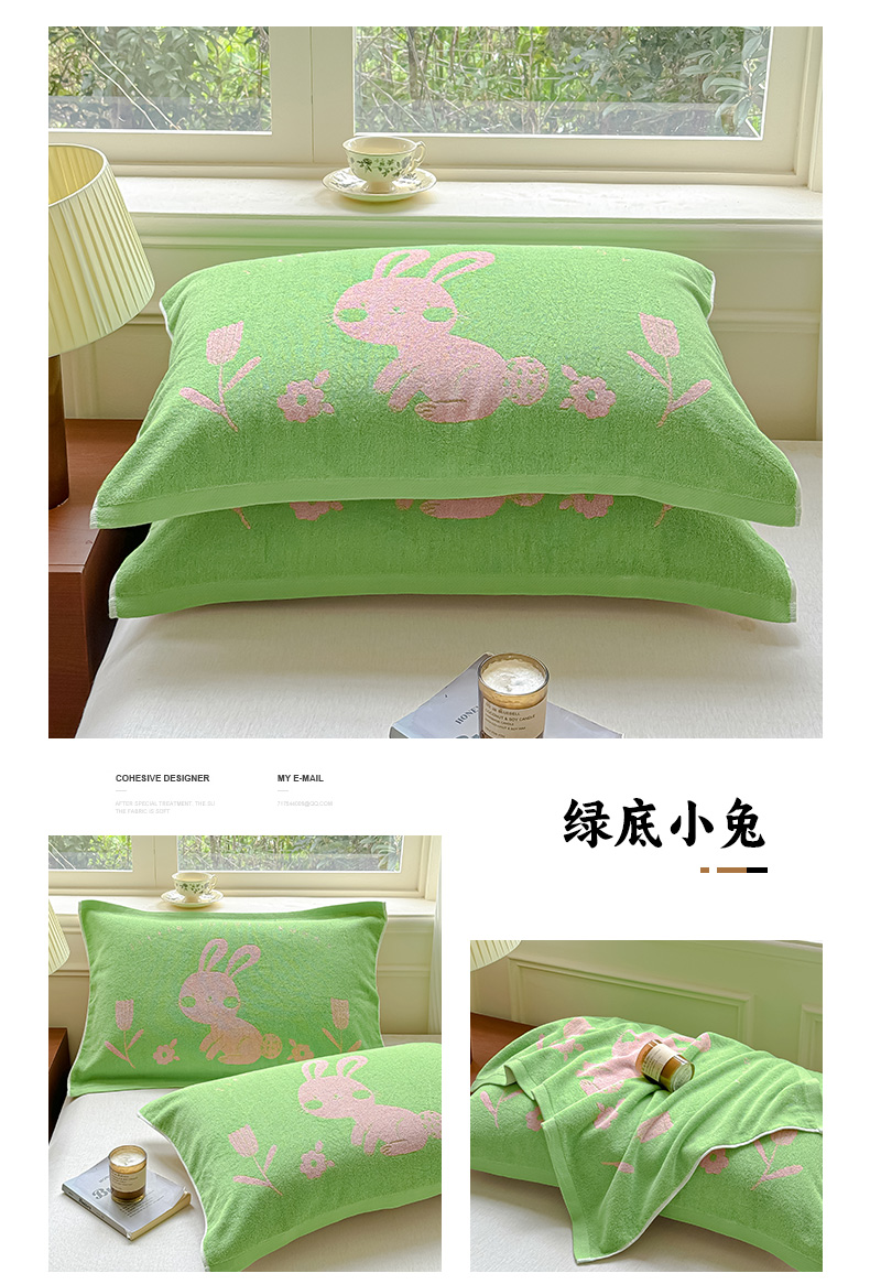 商品名称:乐家毛巾被(工厂自产自销) 2026新款A类全棉纯棉色织提花抗菌毛圈枕巾 绿底小兔