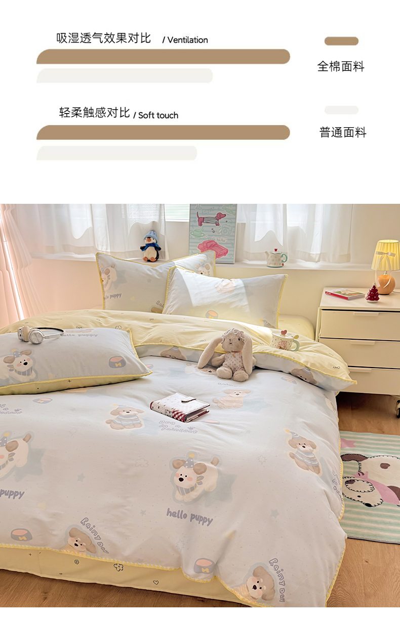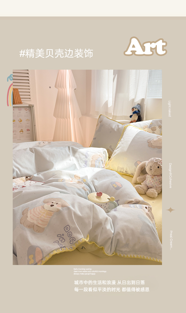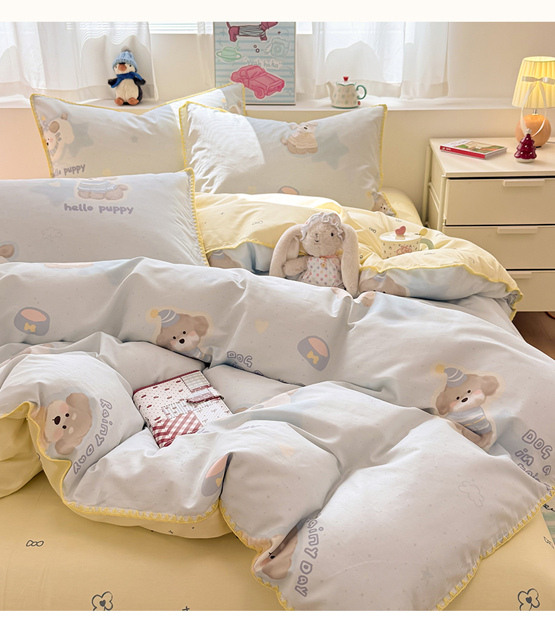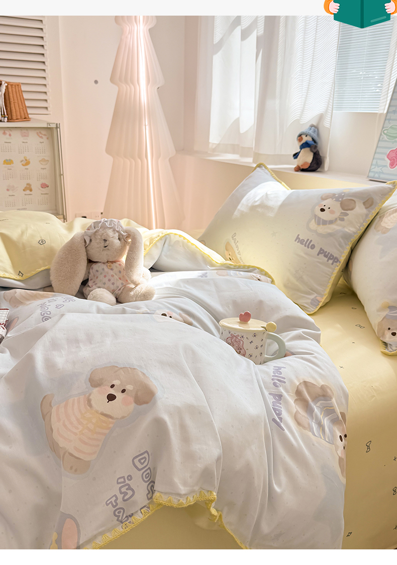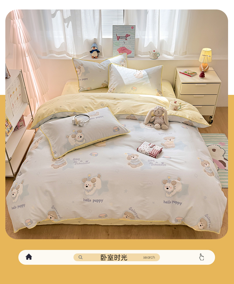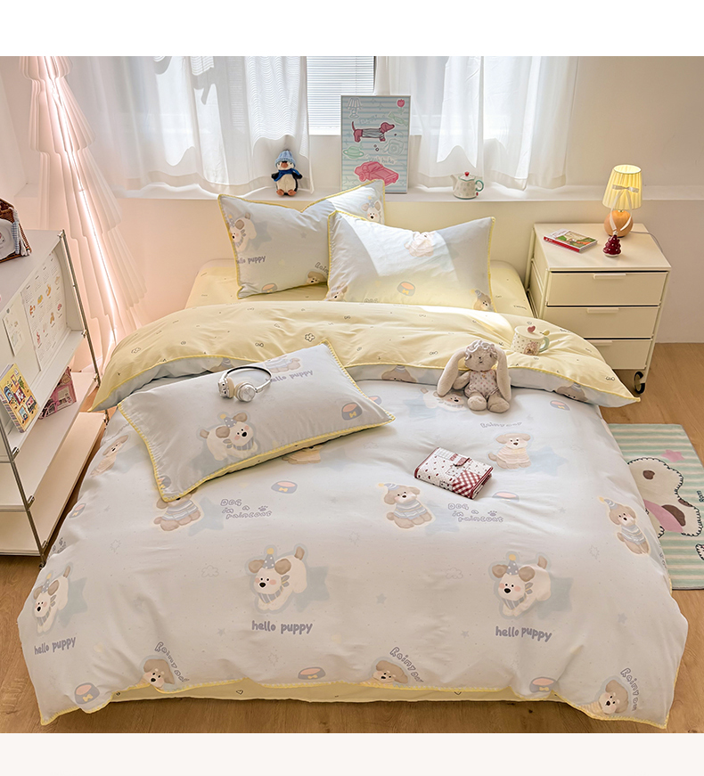 当前位置: 91家纺网 > 商品网购 > 床品套件 > 四件套 > 全棉普通四件套 > 简宜家居(朝初家纺) 2026新款贝壳边卡通可爱纯棉全棉四件套 派对小狗-黄