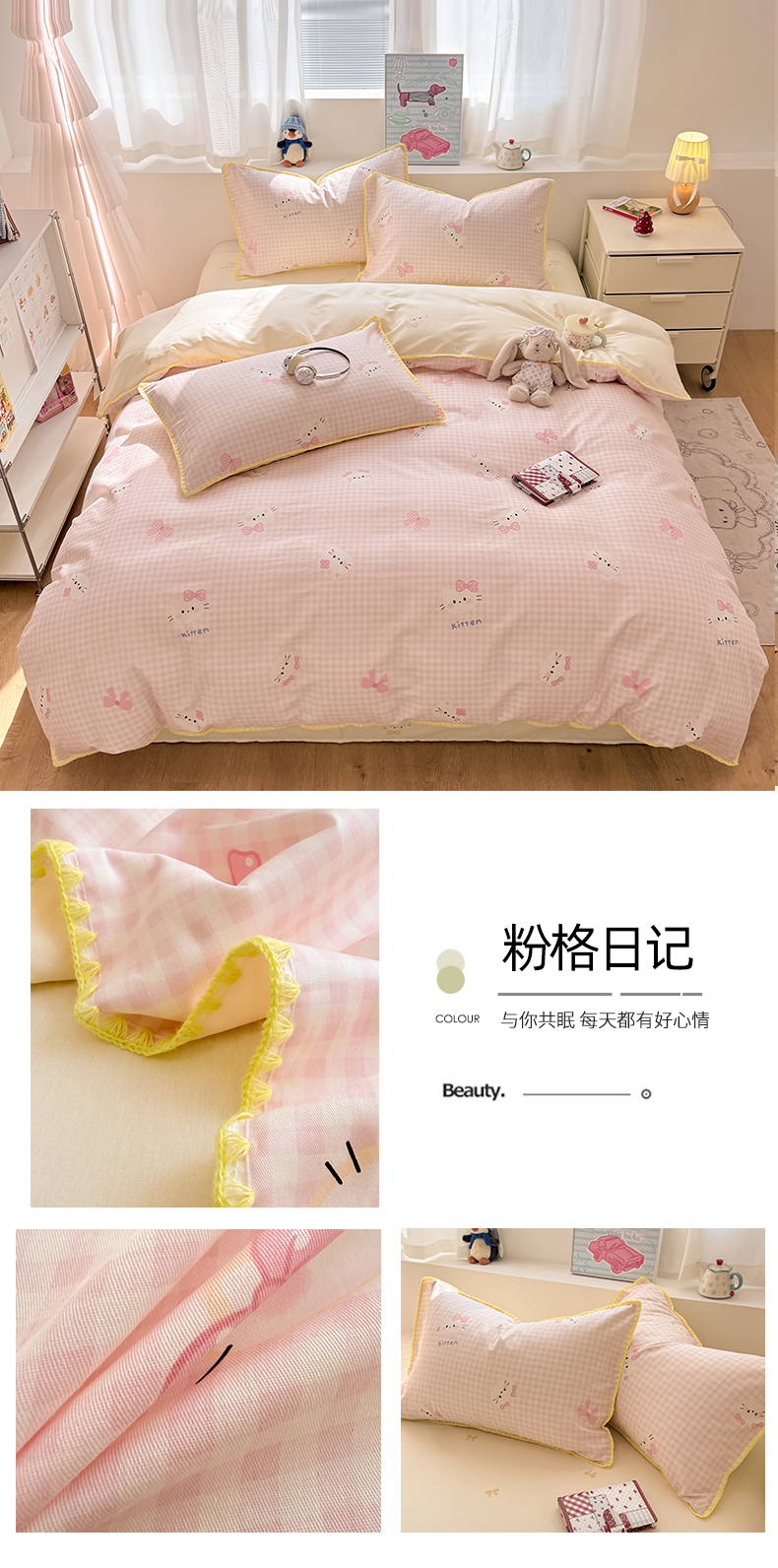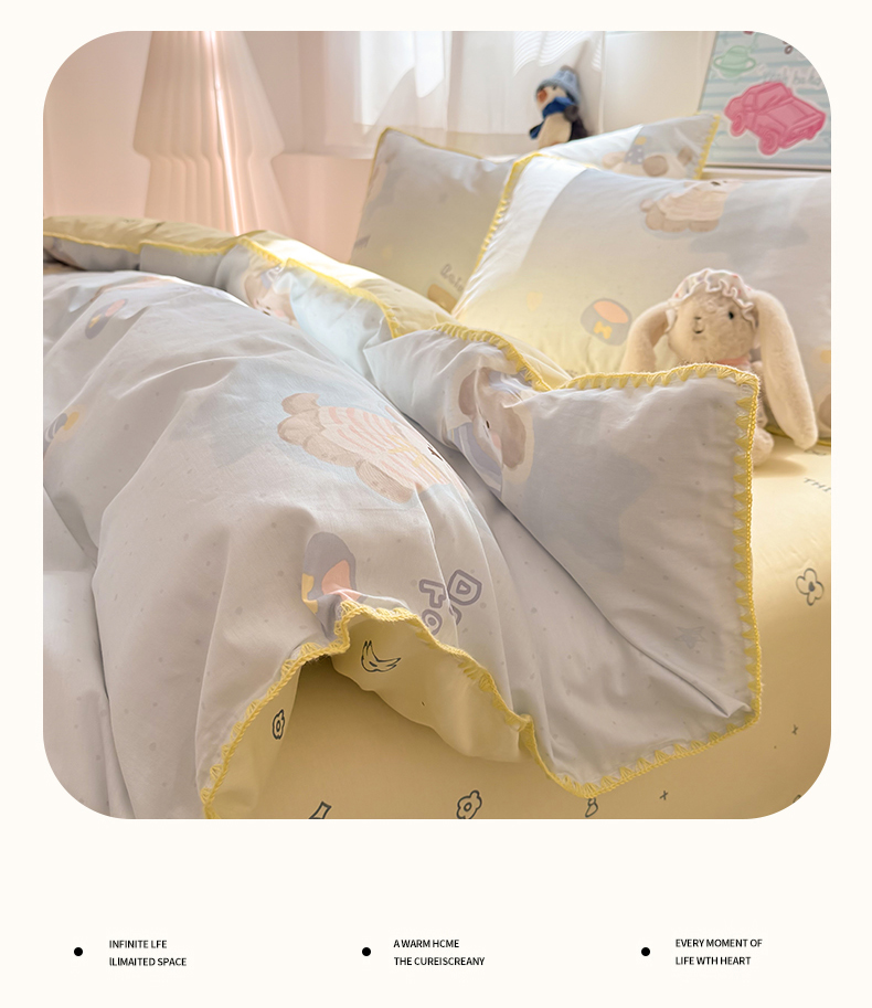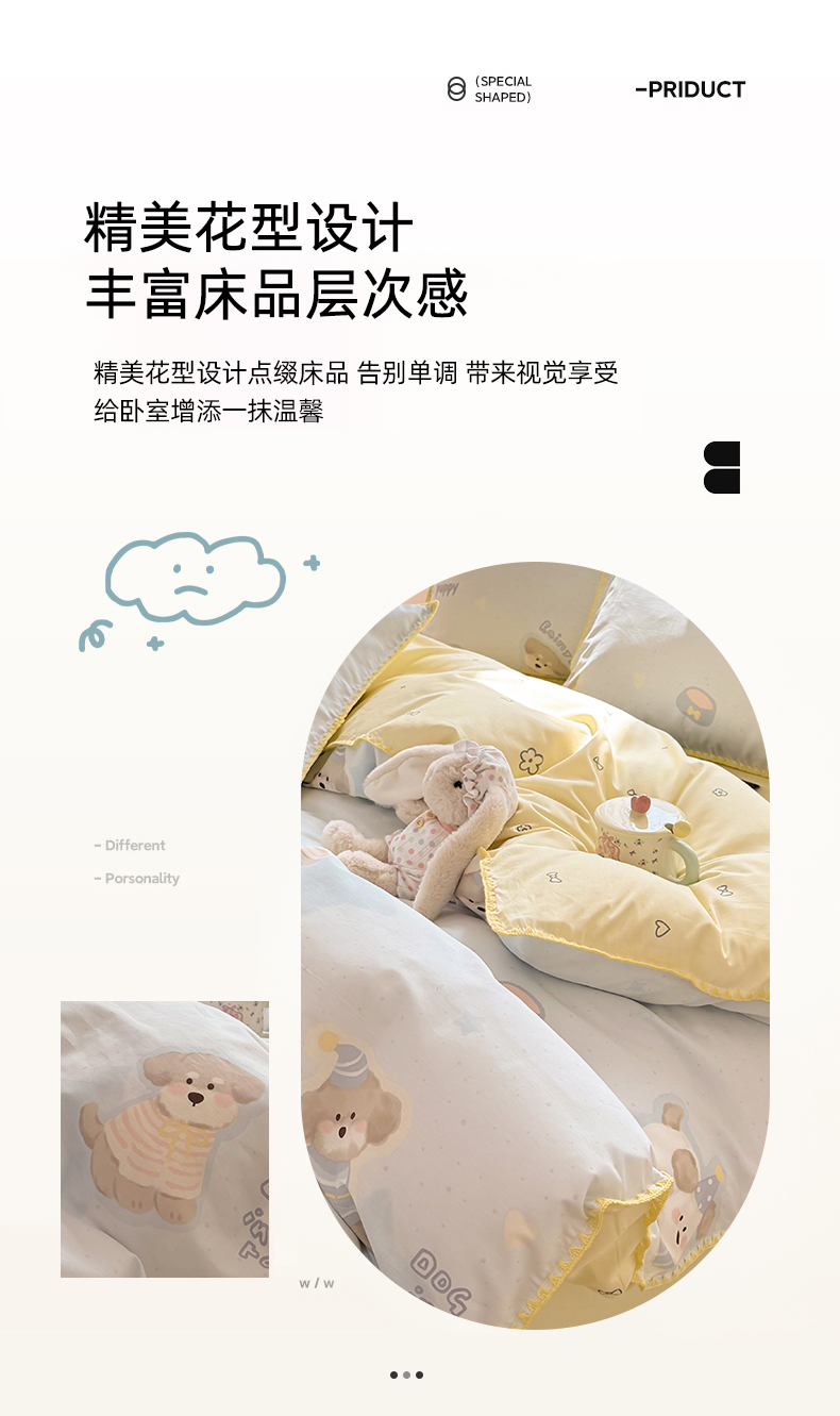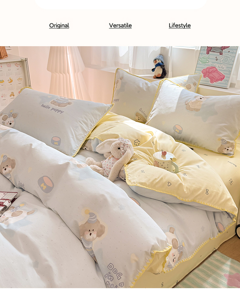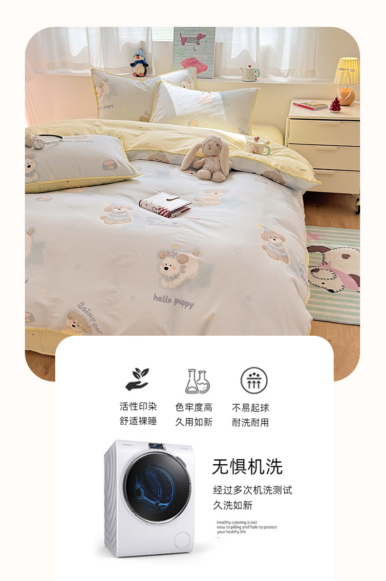 当前位置: 91家纺网 > 商品网购 > 床品套件 > 四件套 > 全棉普通四件套 > 简宜家居(朝初家纺) 2026新款贝壳边卡通可爱纯棉全棉四件套 派对小狗-黄
