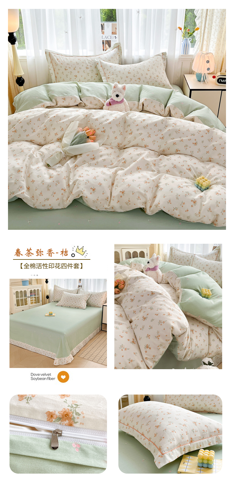 美织缘家纺 2026直播爆款一字绣吊边床单款纯棉全棉四件套印花百分百(喷气高品质) 春茶弥香-桔,春茶弥香-桔