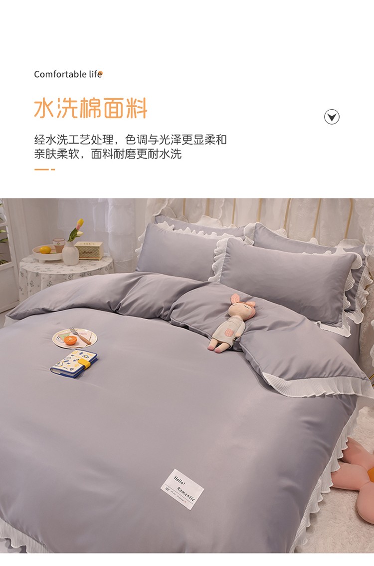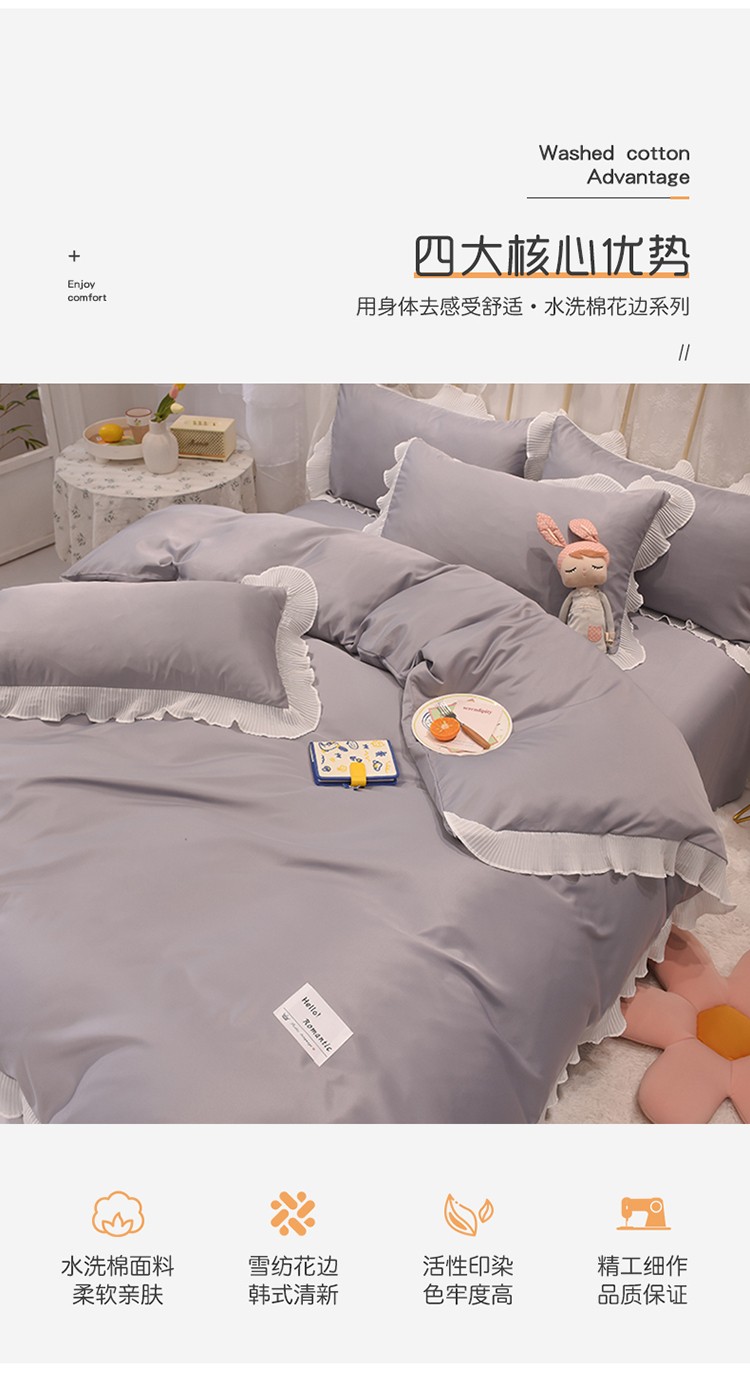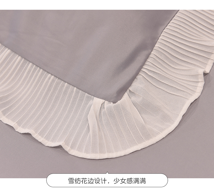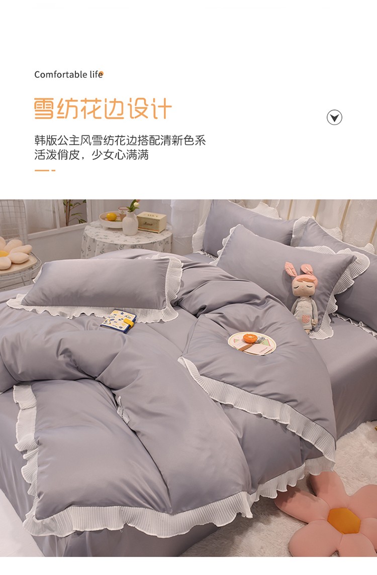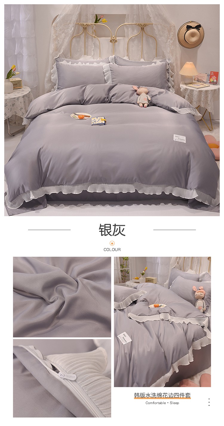 商品名称:2024新款韩版公主风雪纺花边水洗棉四件套 诗语银灰