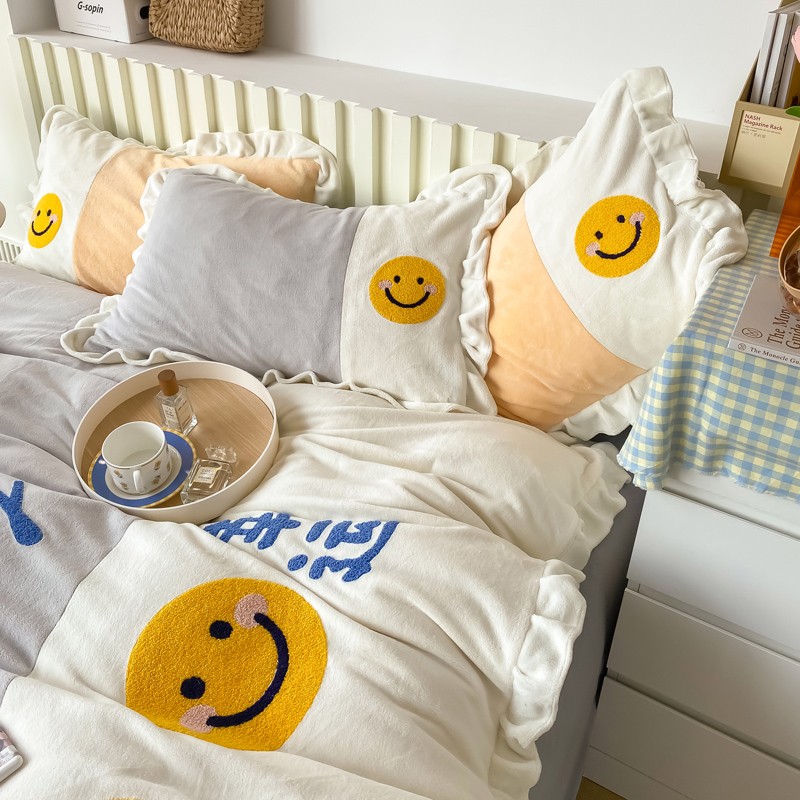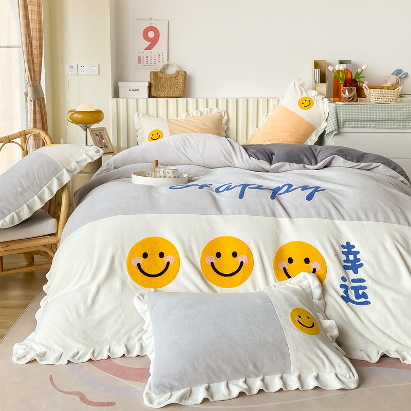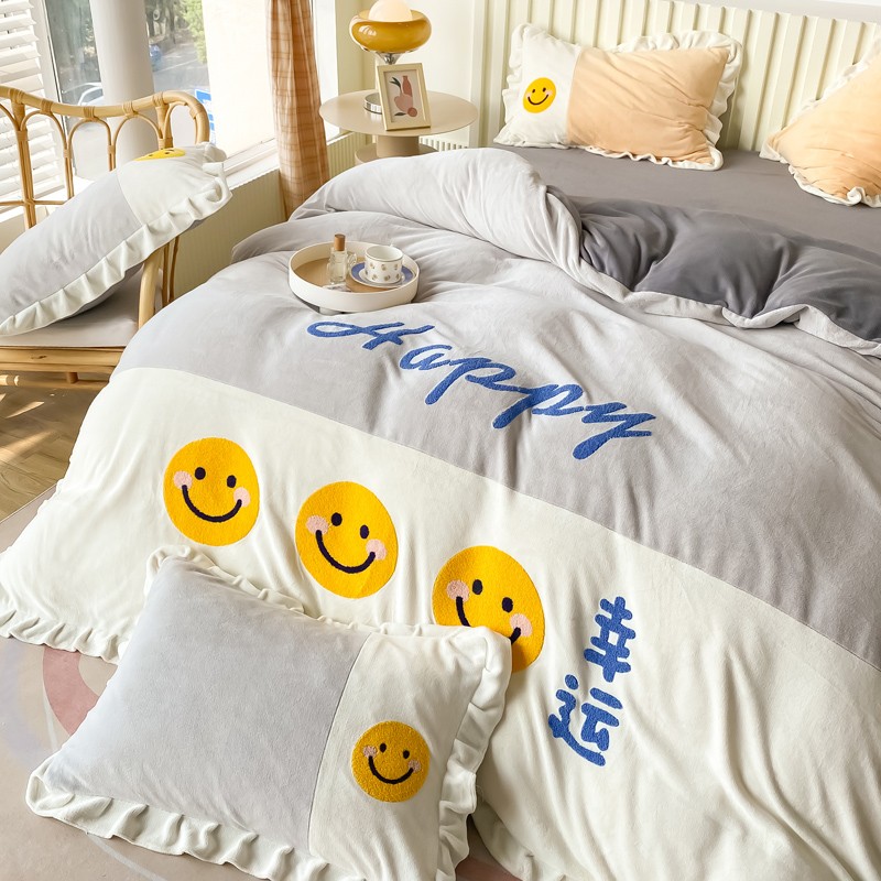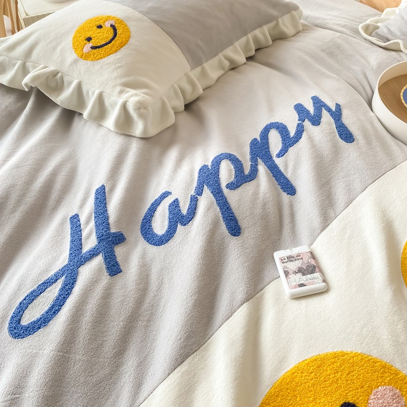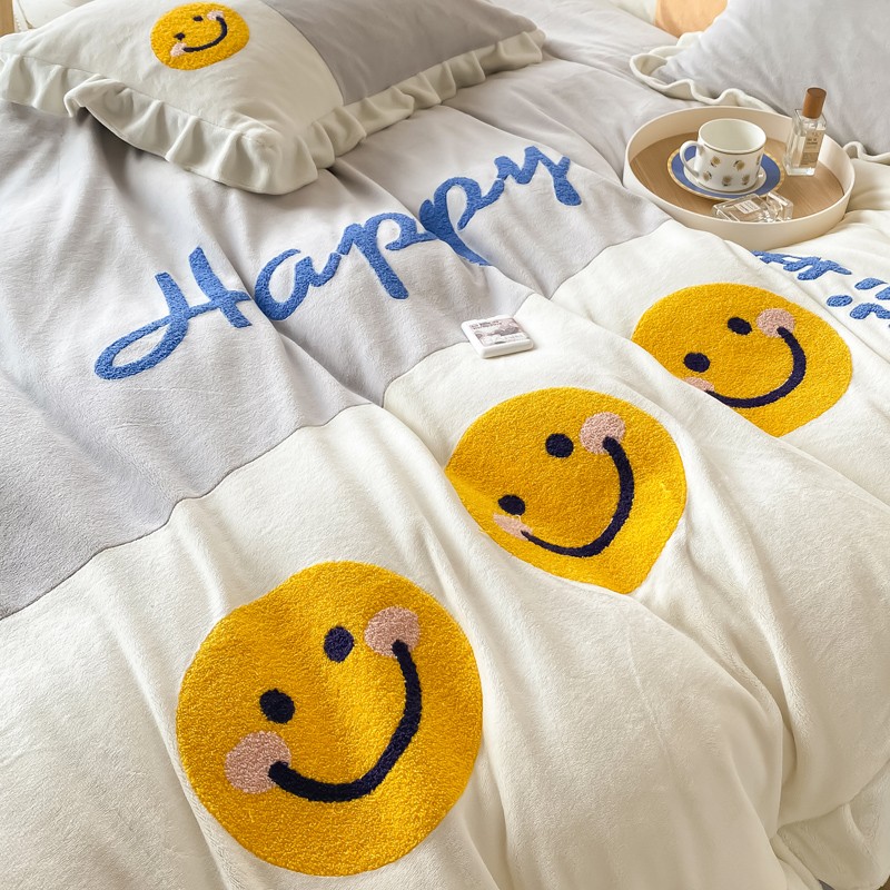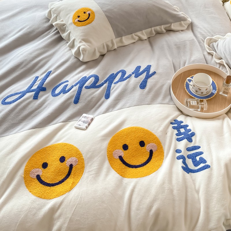 当前位置: 91家纺网 > 商品网购 > 床品套件 > 四件套 > 牛奶绒四件套 > 懒猫家纺 2021新款牛奶绒毛巾绣四件套实拍图 笑脸-灰