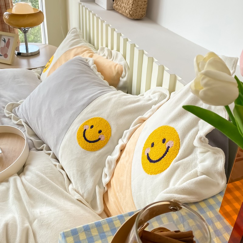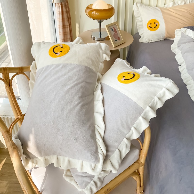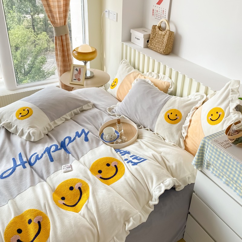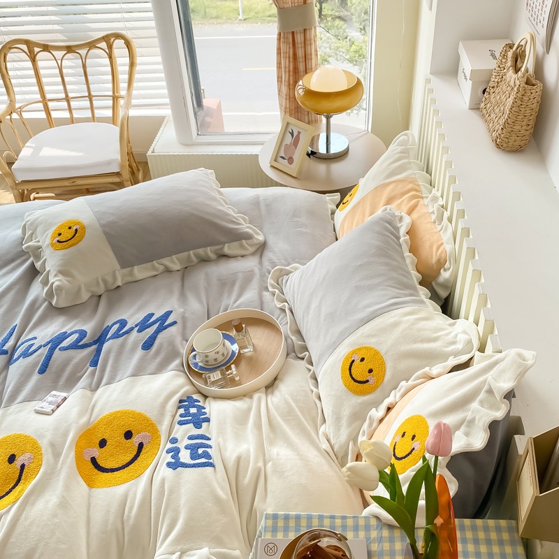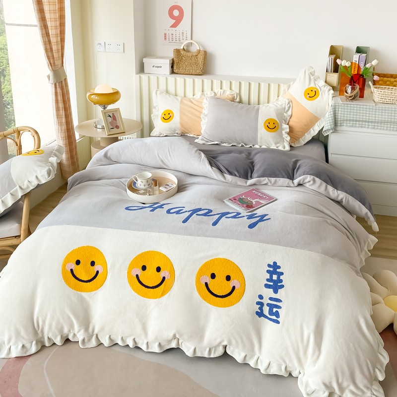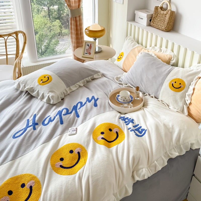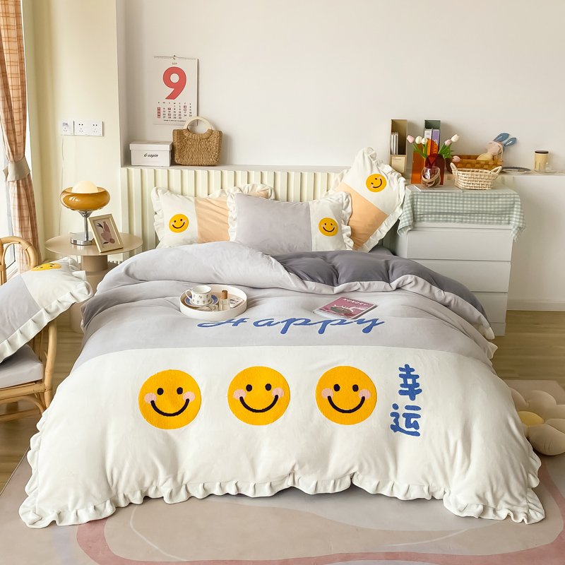 当前位置: 91家纺网 > 商品网购 > 床品套件 > 四件套 > 牛奶绒四件套 > 懒猫家纺 2021新款牛奶绒毛巾绣四件套实拍图 笑脸-灰