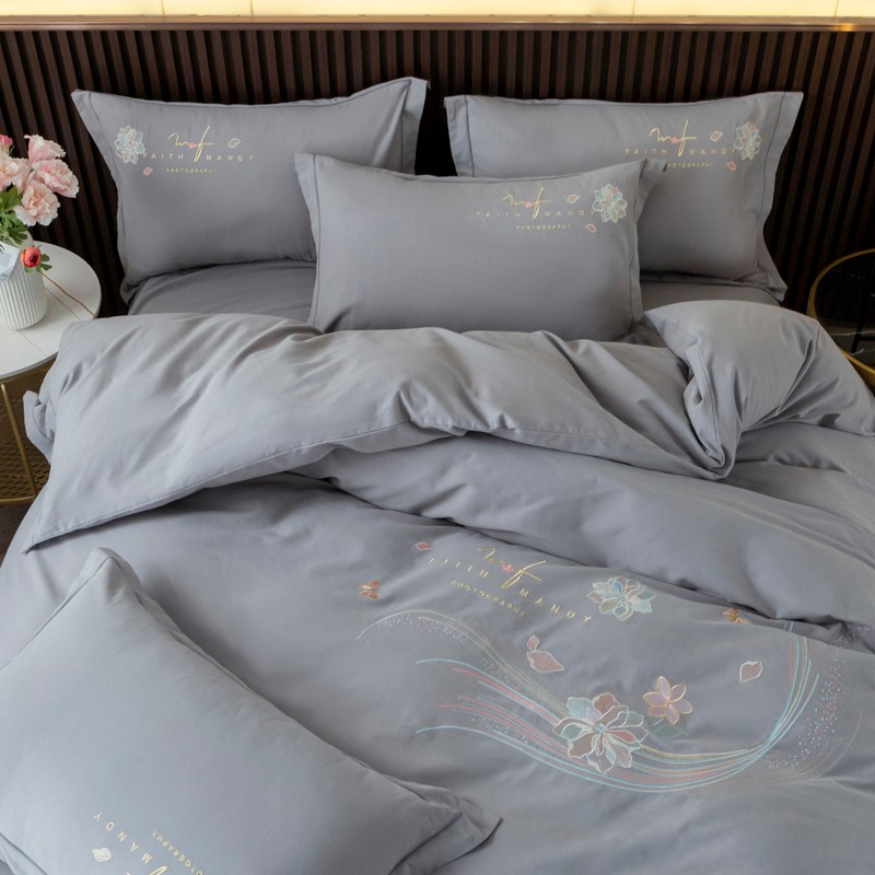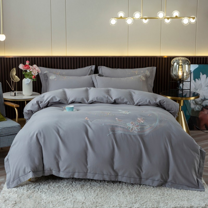 优姿 2022新款100S长绒棉宽边绣花四件套似锦年华-灰色