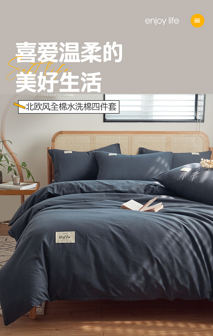 当前位置: 91家纺网 > 商品网购 > 床品套件 > 四件套 > 水洗棉四件套 > AB家纺 2022新款全棉水洗棉四件套 绅士灰