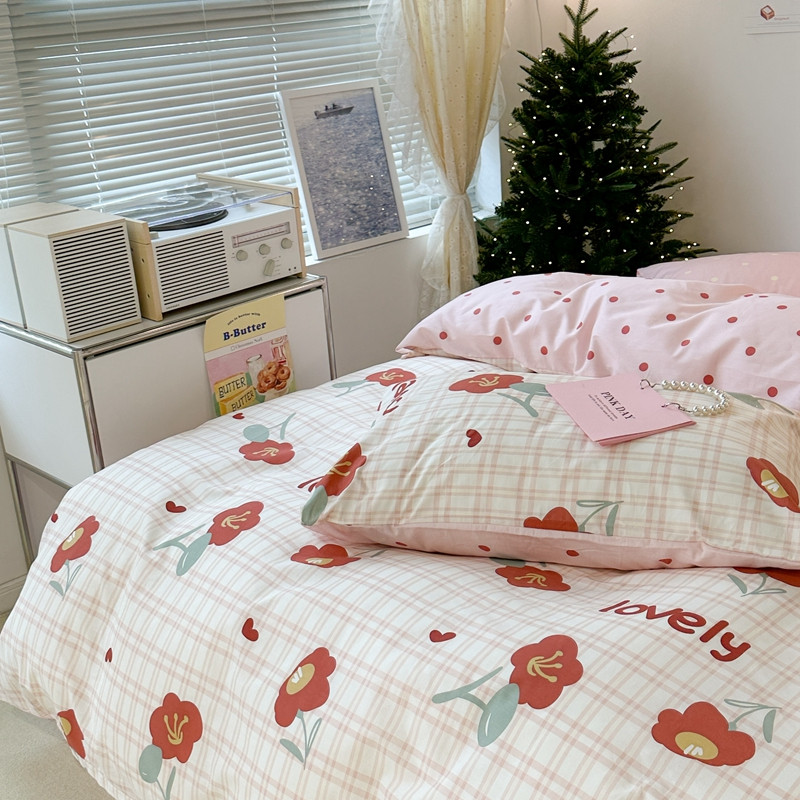 昔可家纺 2023新款圣诞系列全棉四件套 格子小红花