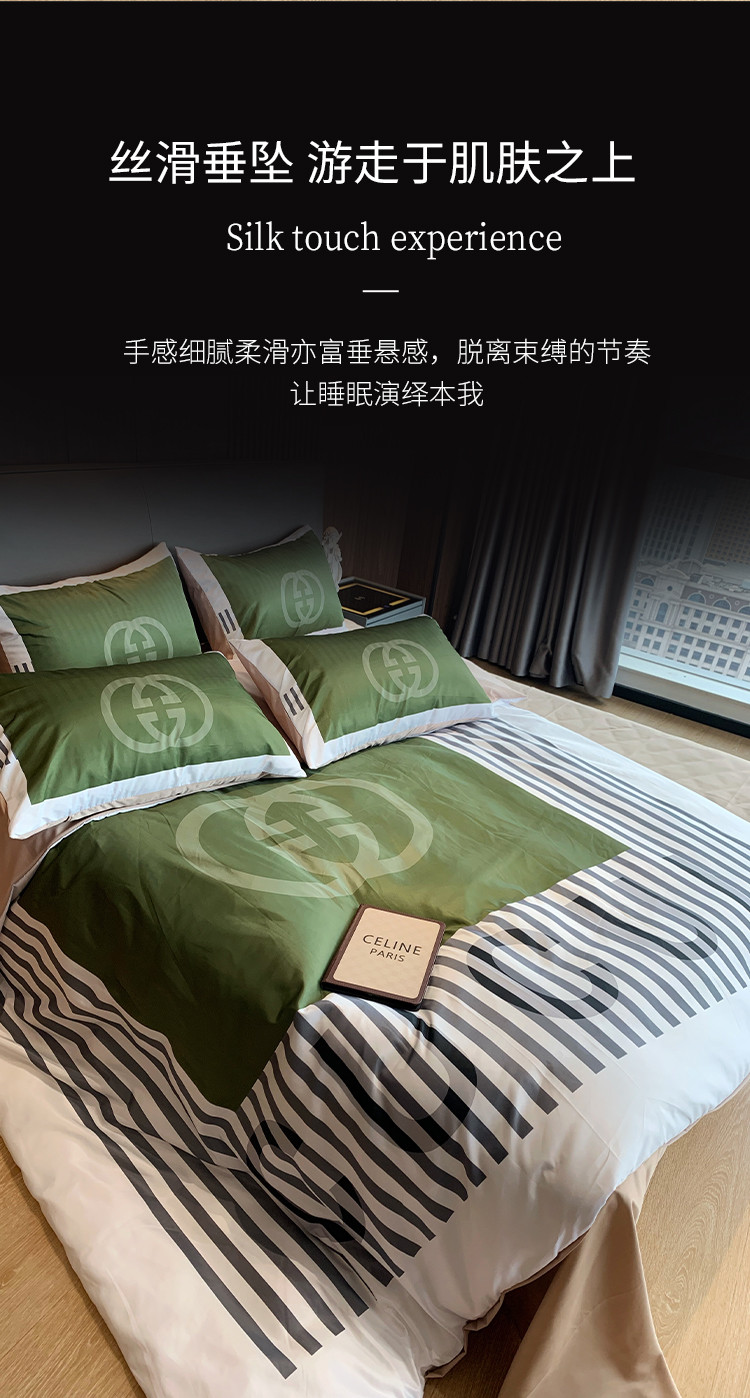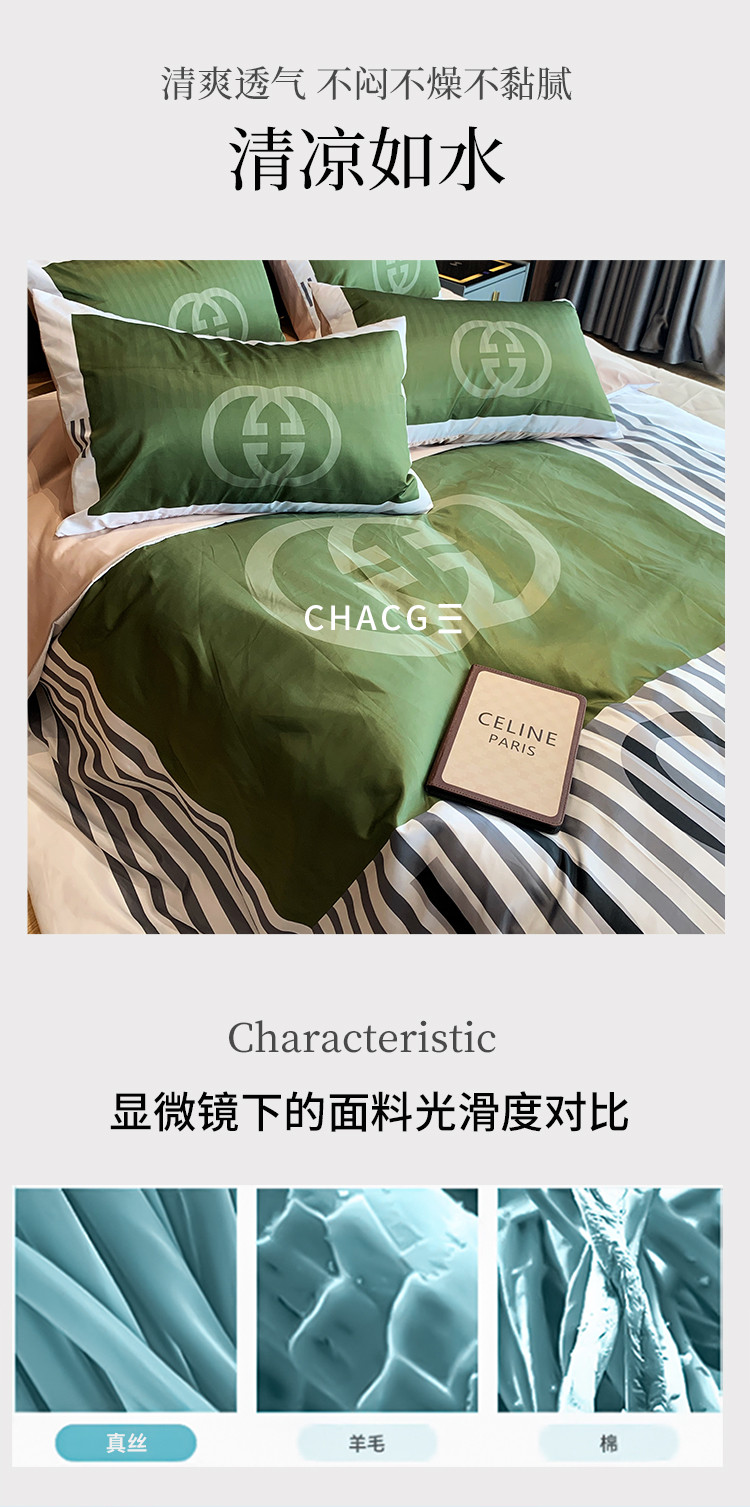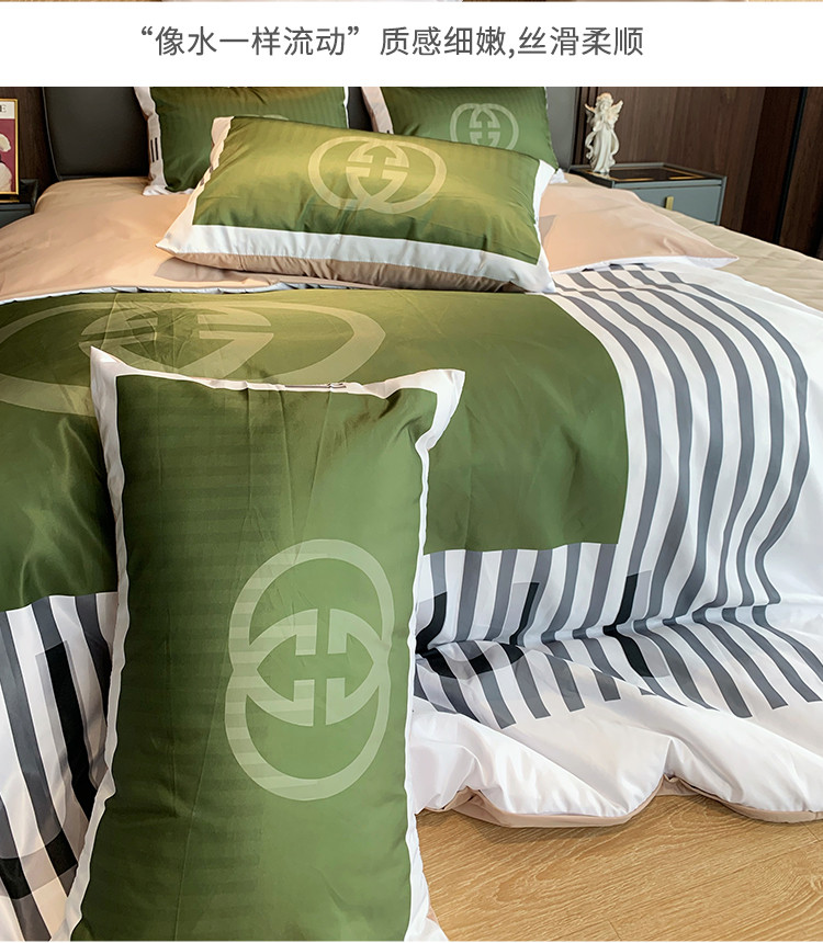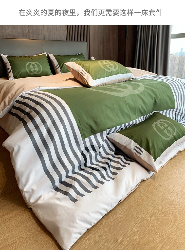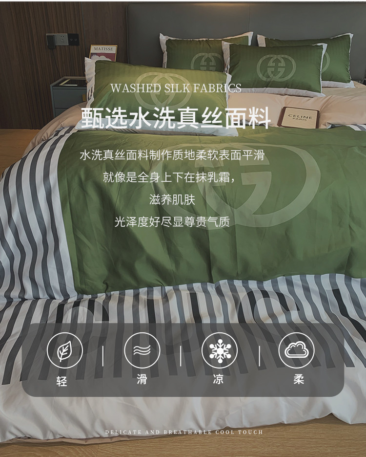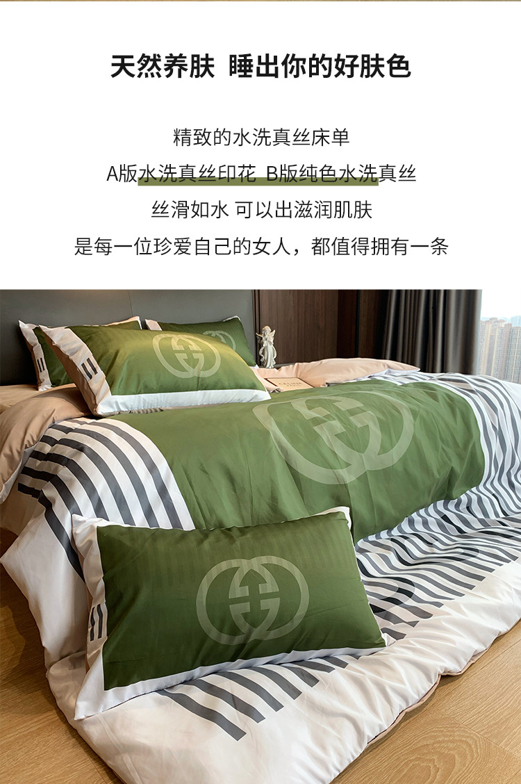 当前位置: 91家纺网 > 商品网购 > 床品套件 > 四件套 > 真丝四件套 > 色鬼布艺 2023新款水洗真丝大牌风四件套 绿色字母