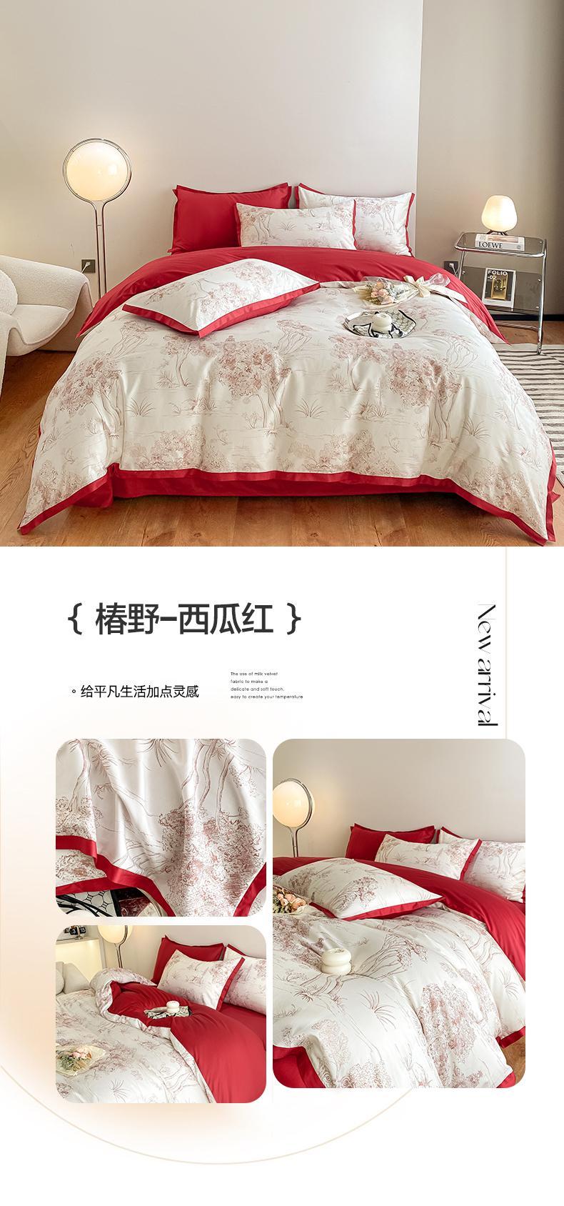 商品名称:(总)秀色 2025新款50支贡缎长绒棉床上四件套数码印花被套轻奢高级感床品 椿野-西瓜红
