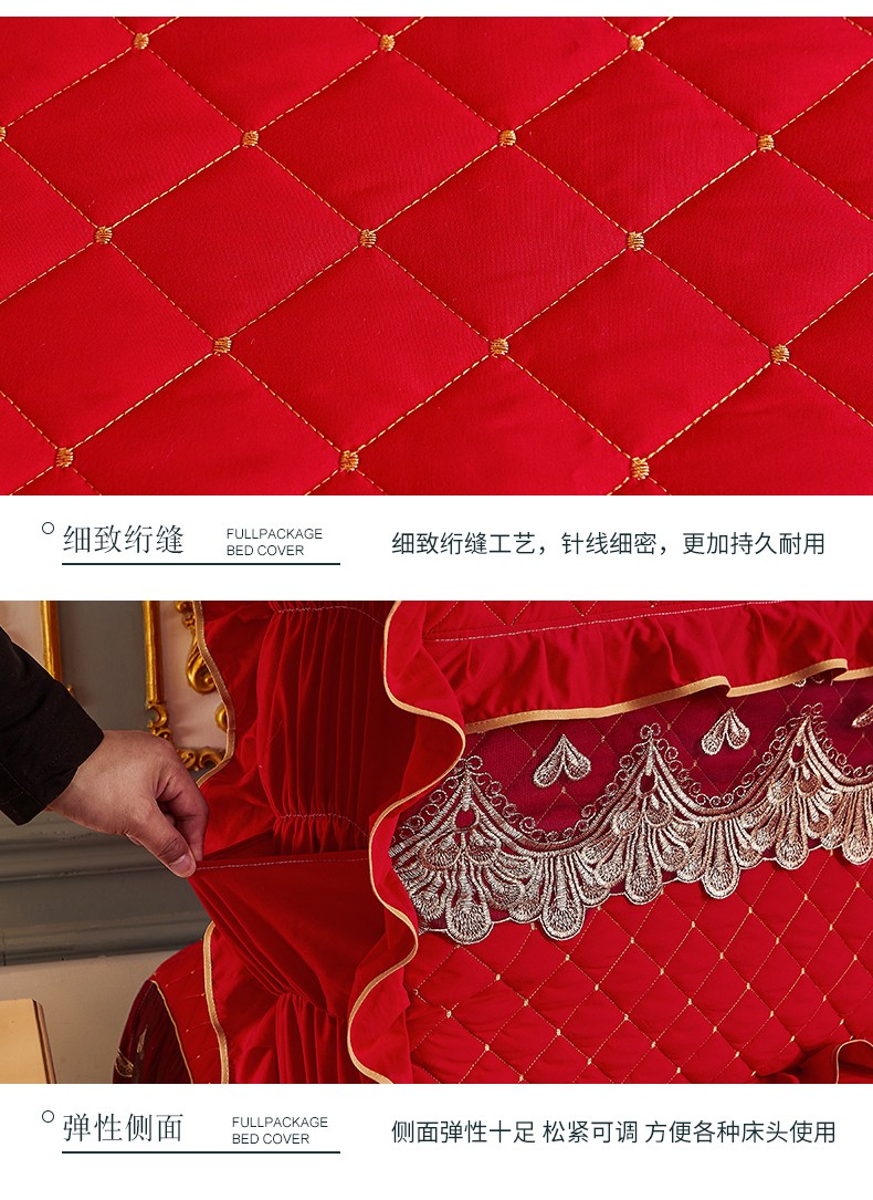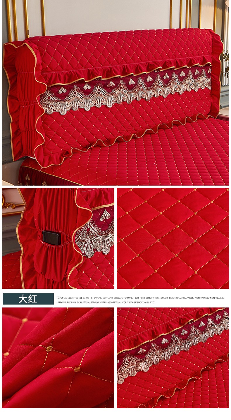 (总)屹成家纺2025新款水晶绒夹棉绗缝蕾丝床裙三件套(塞纳河畔)床裙单件起售价不低于105元,大红,豆沙,翡翠绿,粉玉,橄榄绿,蔚蓝,银灰