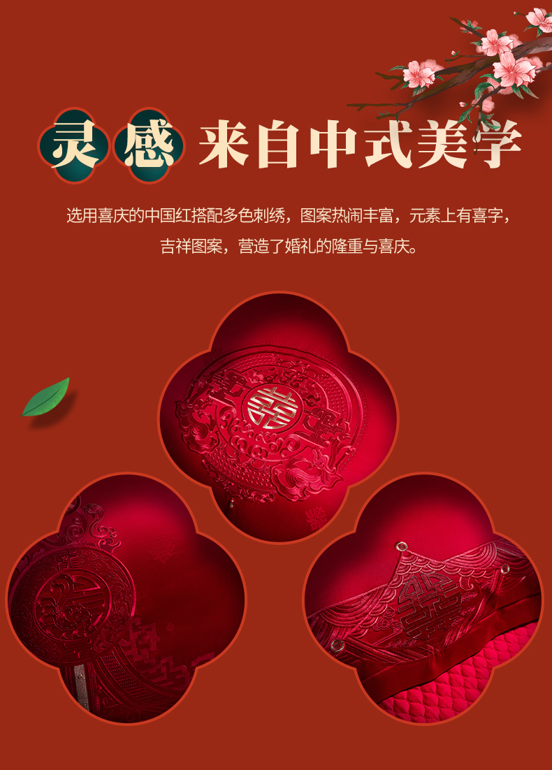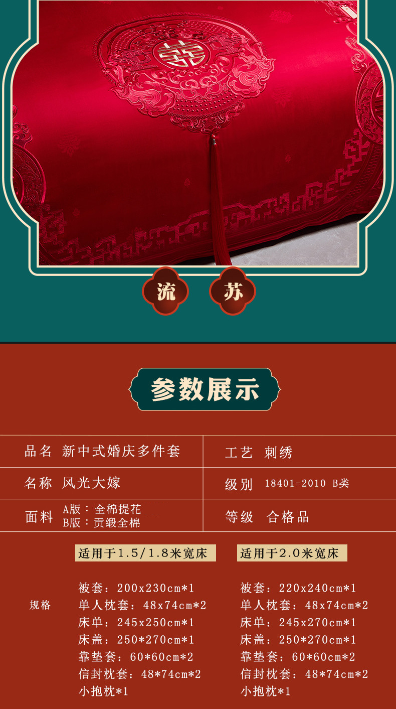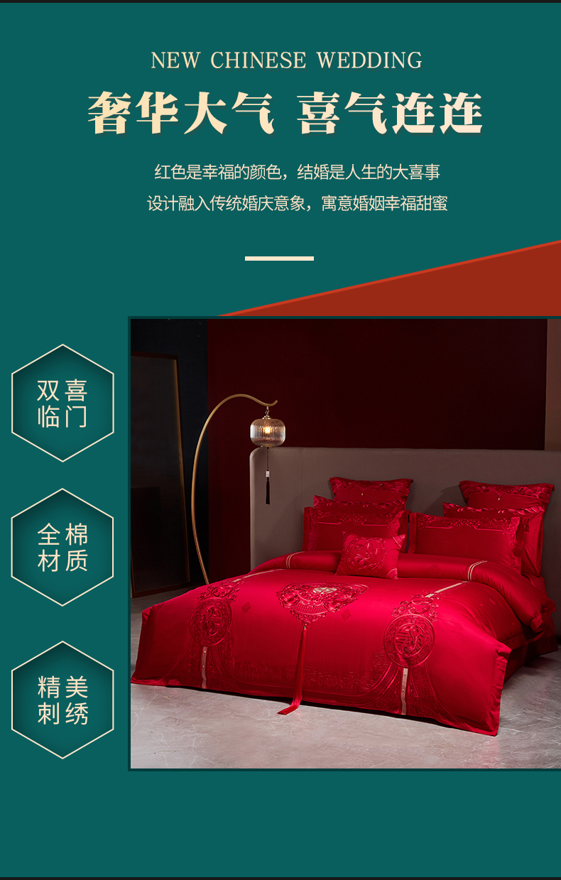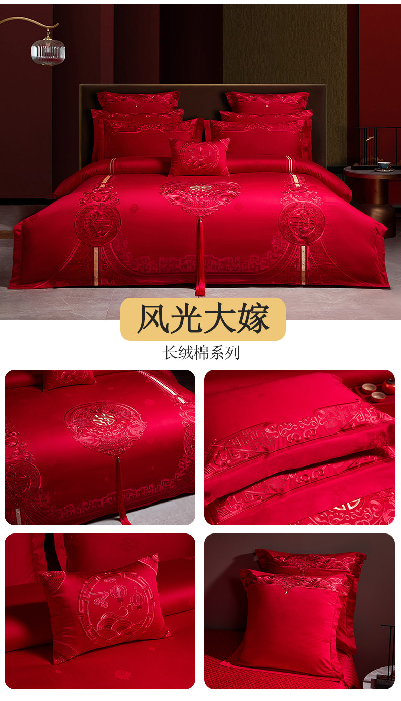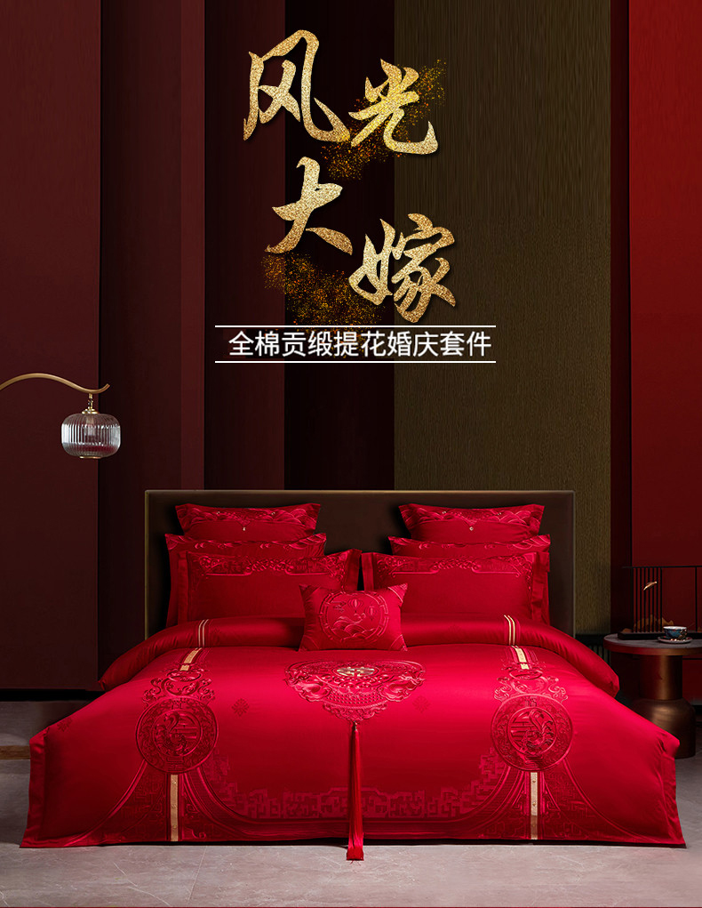 当前位置: 91家纺网 > 商品网购 > 床品套件 > 四件套 > 婚庆四件套 > 宏羽纺 2023新款高支高密全棉贡缎提花婚庆套件 全棉风光大嫁-红