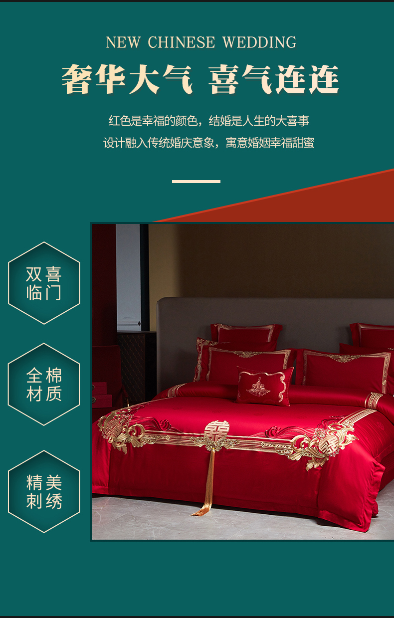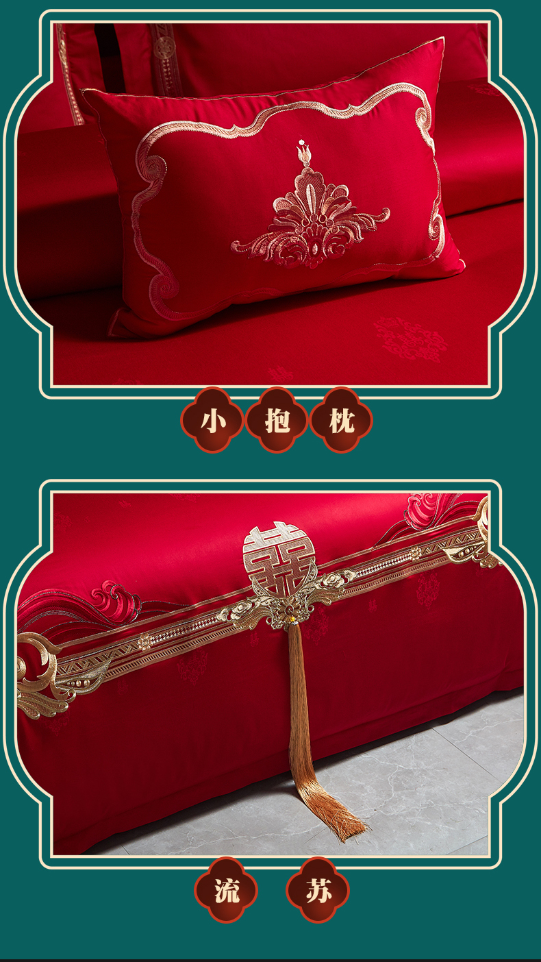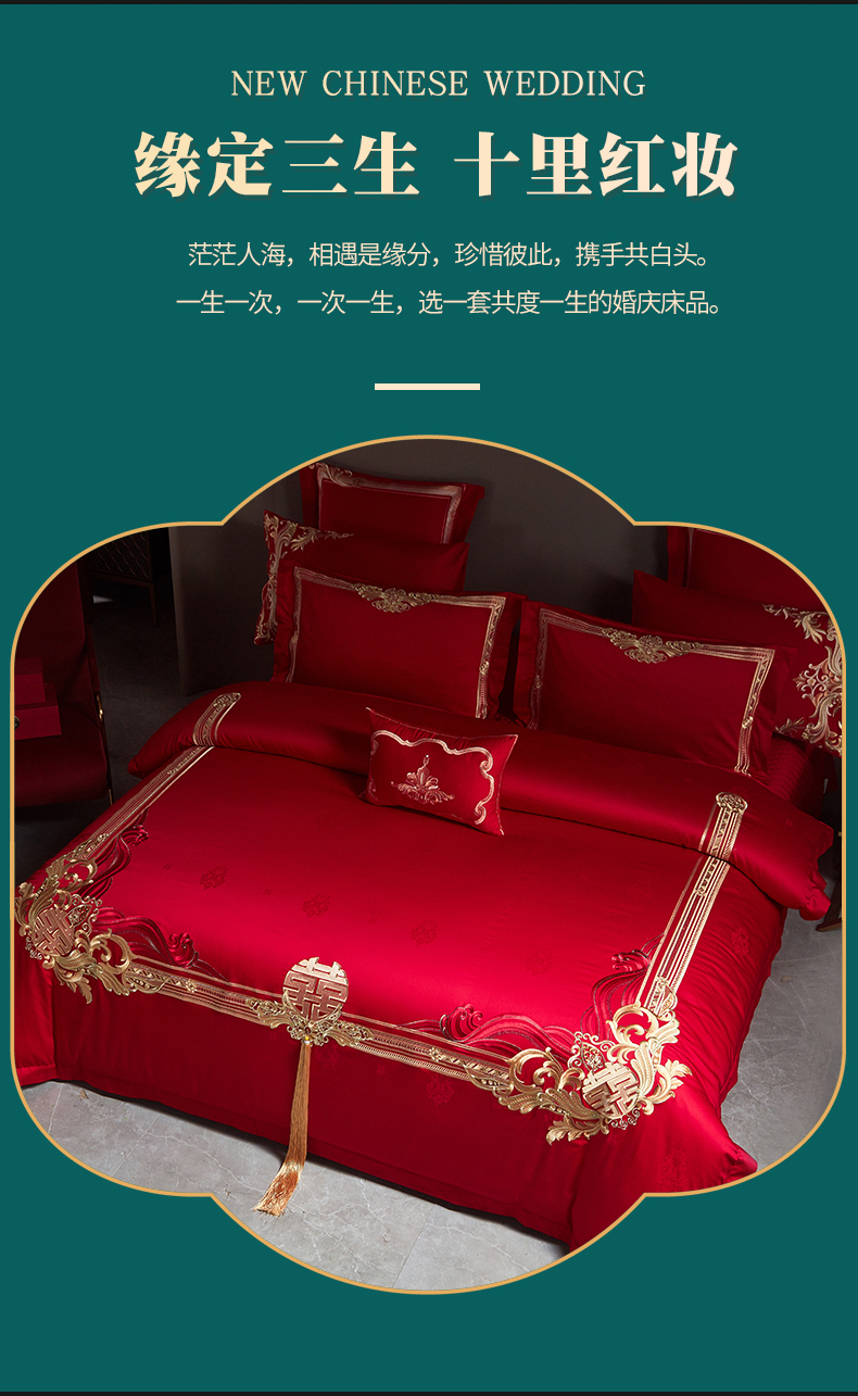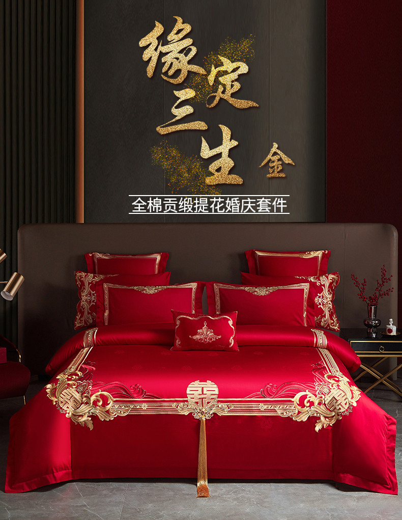 当前位置: 91家纺网 > 商品网购 > 床品套件 > 四件套 > 婚庆四件套 > 宏羽纺 2023新款高支高密全棉贡缎提花婚庆套件 全棉缘定三生-金