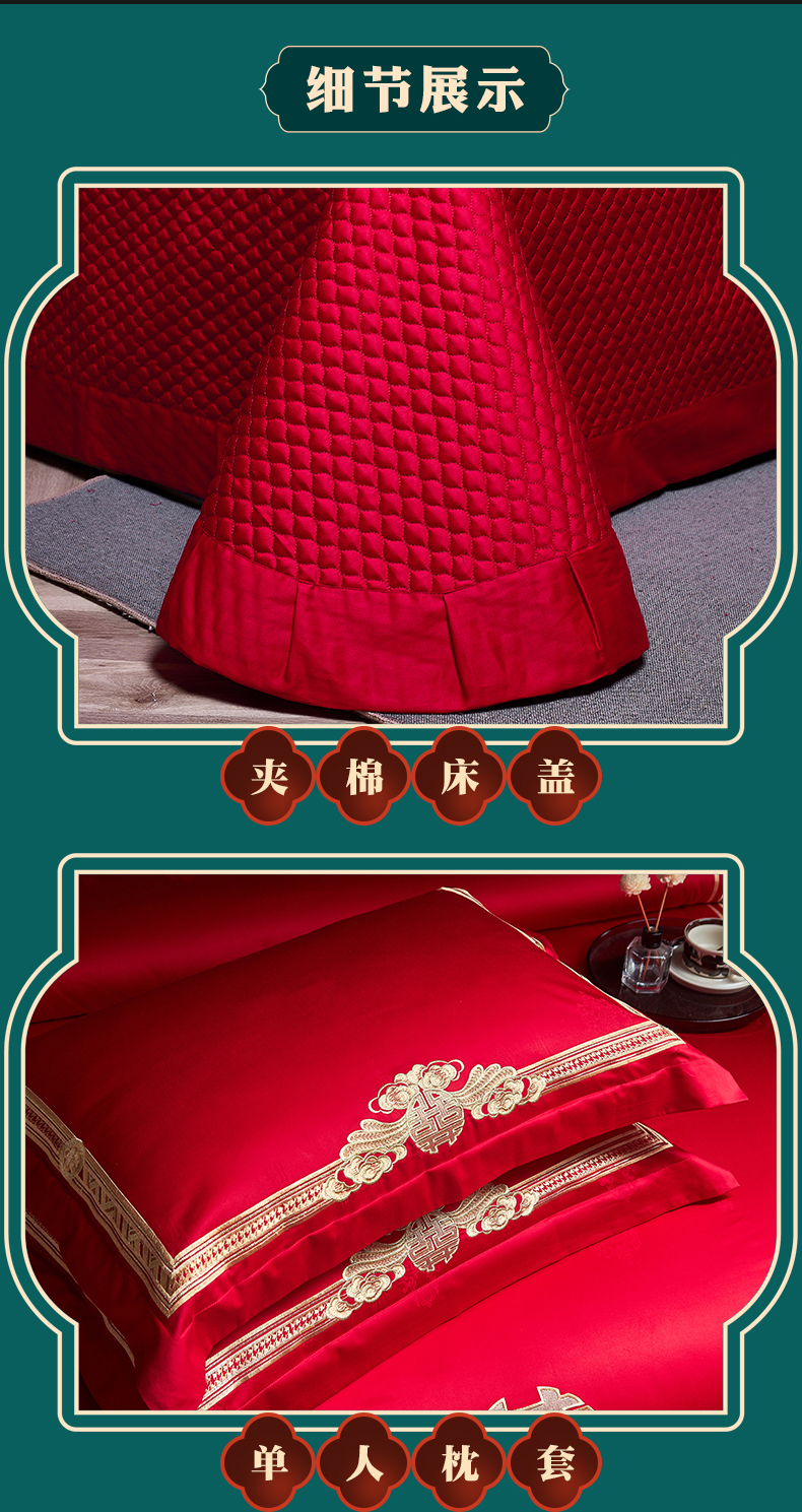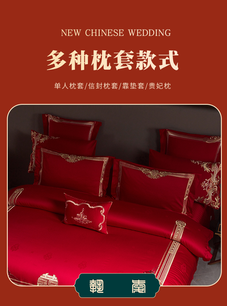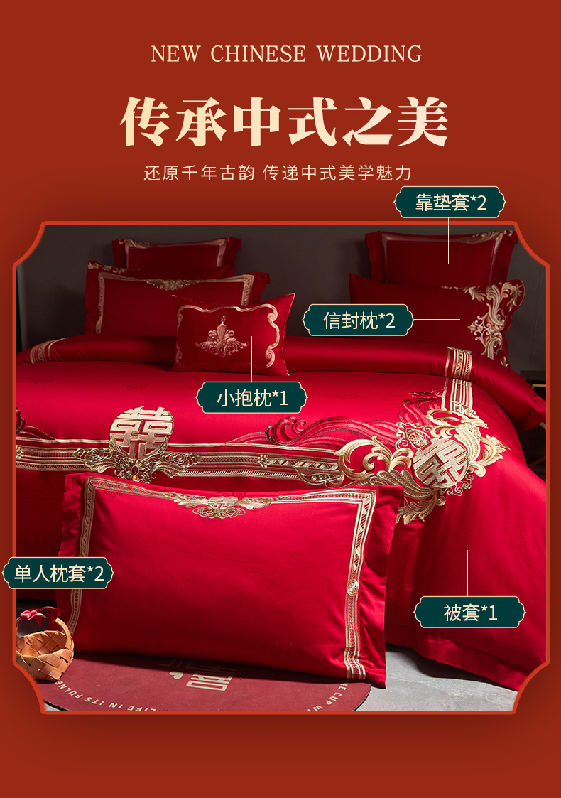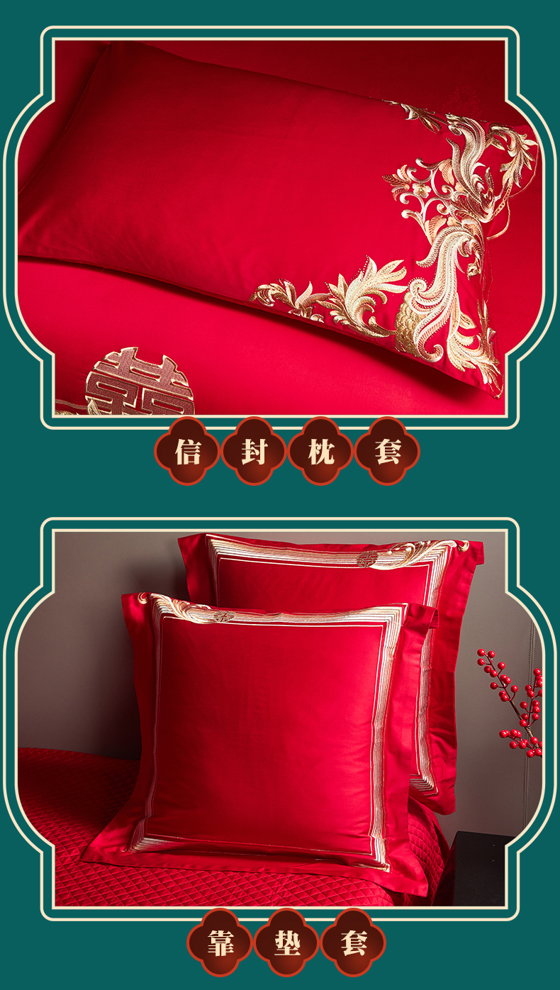 当前位置: 91家纺网 > 商品网购 > 床品套件 > 四件套 > 婚庆四件套 > 宏羽纺 2023新款高支高密全棉贡缎提花婚庆套件 全棉缘定三生-金
