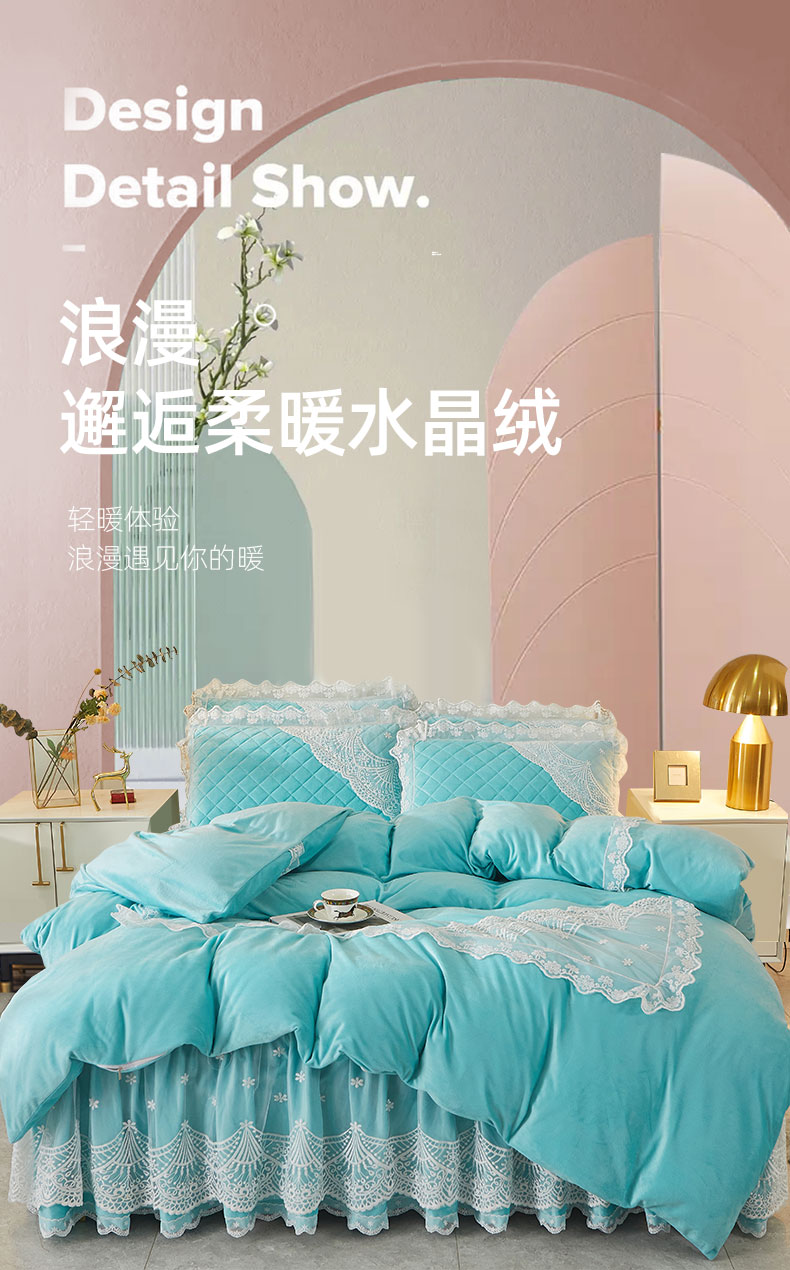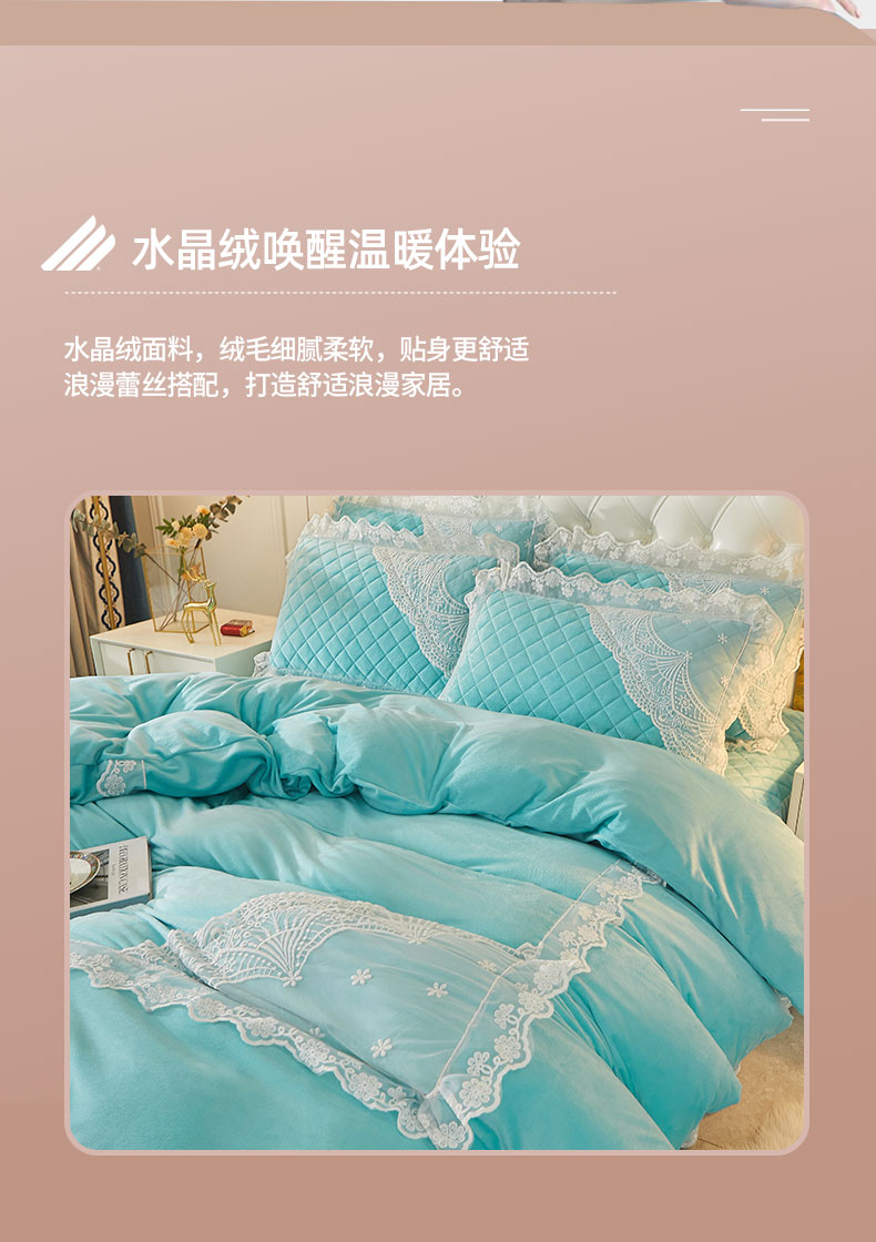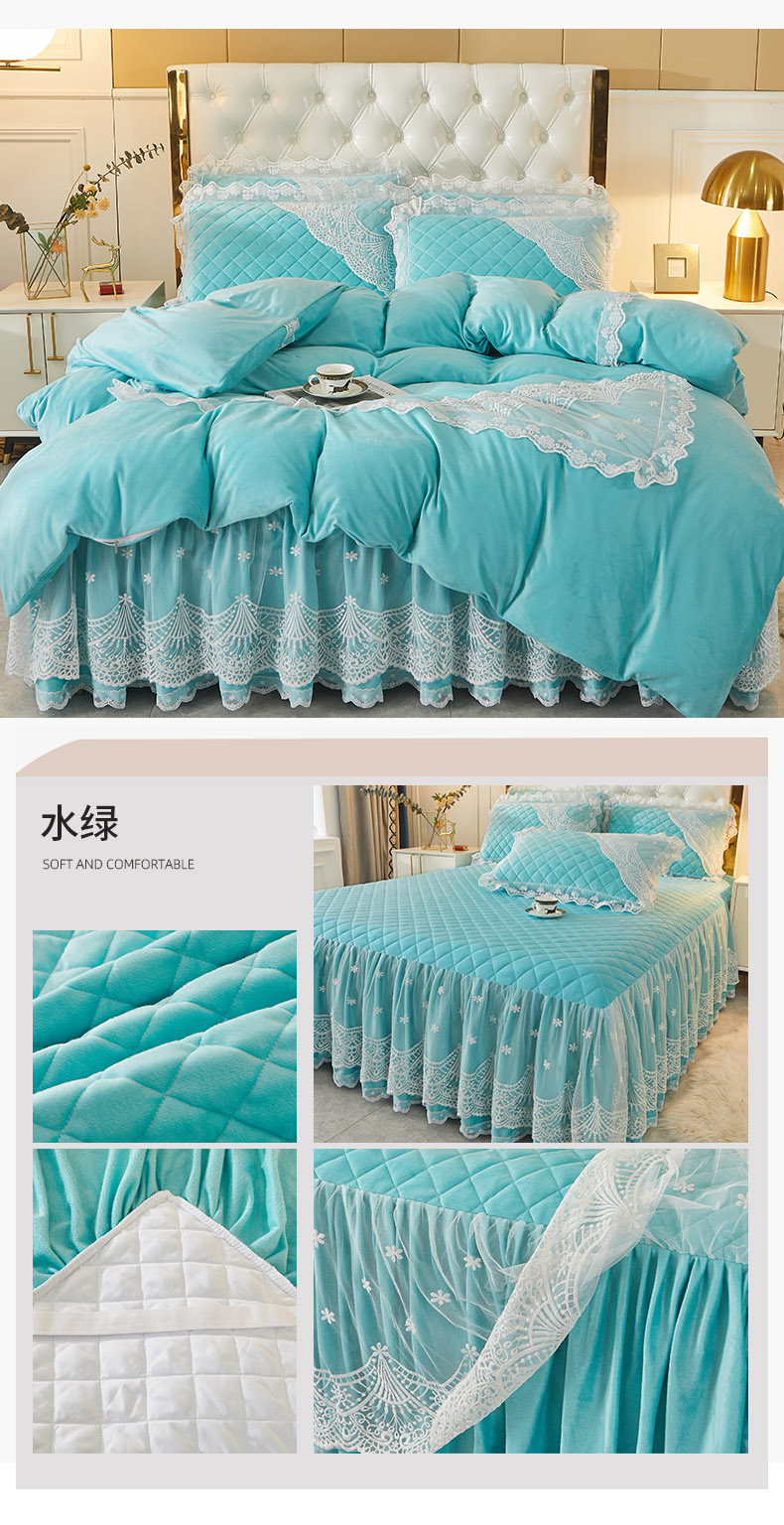当前位置: 91家纺网 > 商品网购 > 床品套件 > 四件套 > 全棉普通四件套 > 2023新款水晶绒保暖床裙四件套爱妮系列 水绿