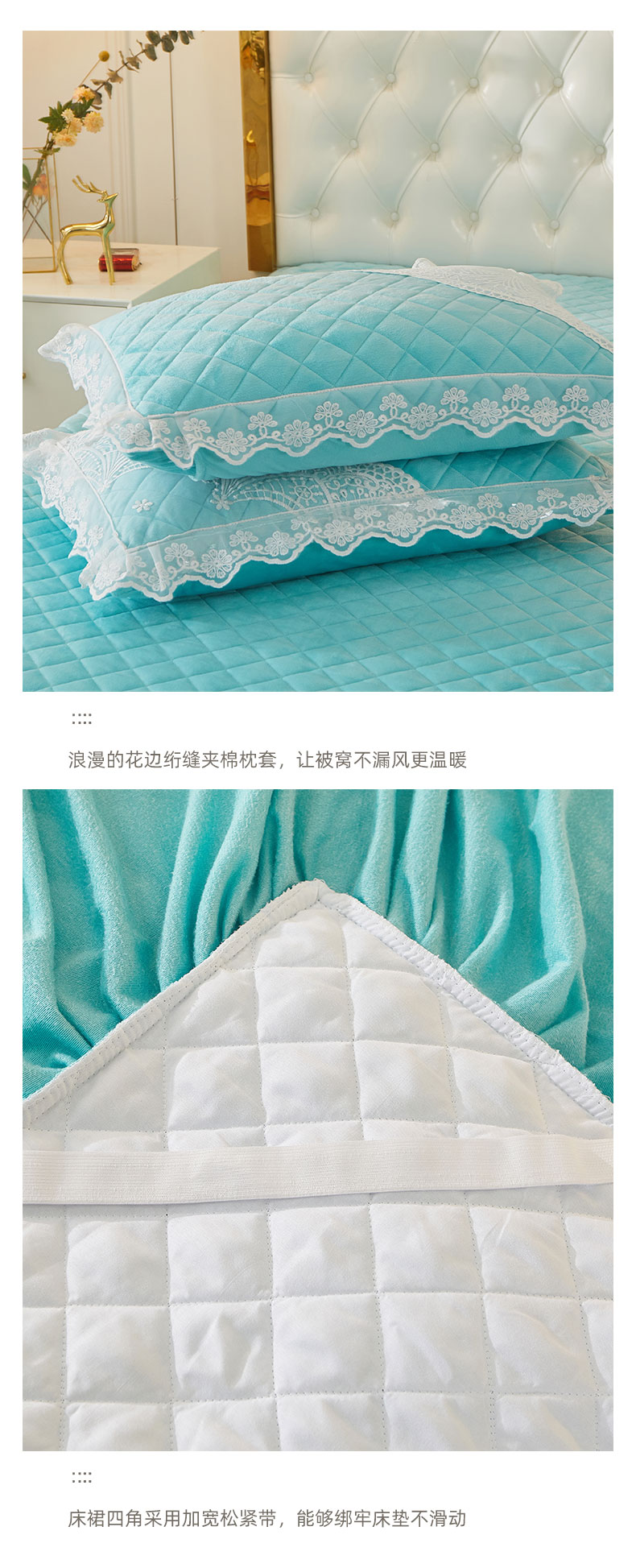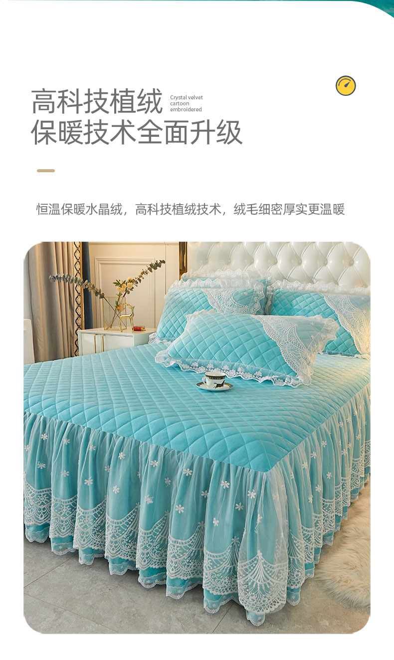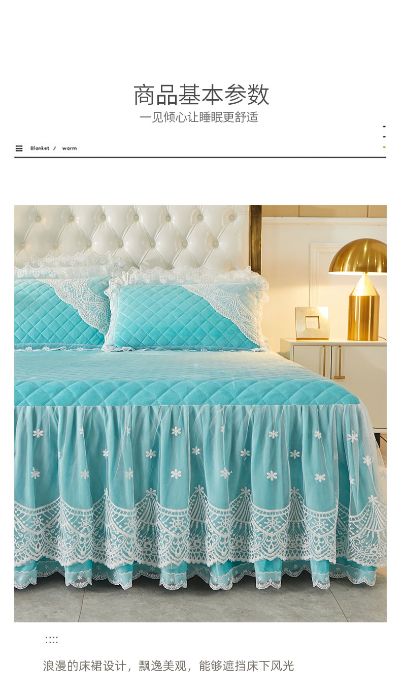 当前位置: 91家纺网 > 商品网购 > 床品套件 > 四件套 > 全棉普通四件套 > 2023新款水晶绒保暖床裙四件套爱妮系列 水绿