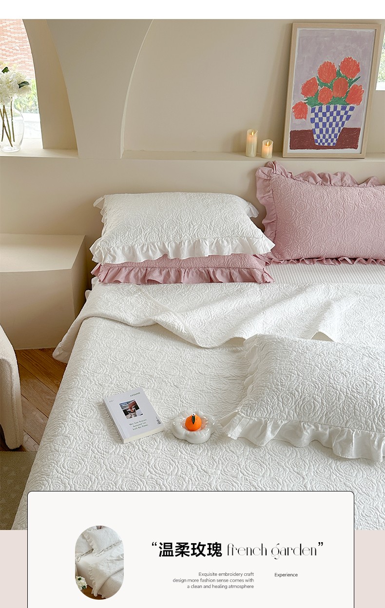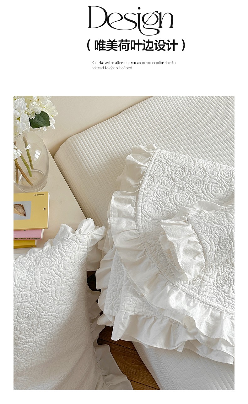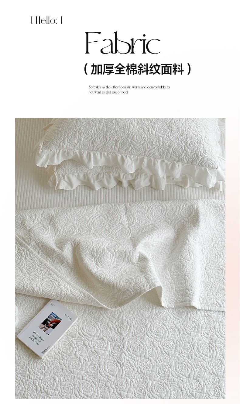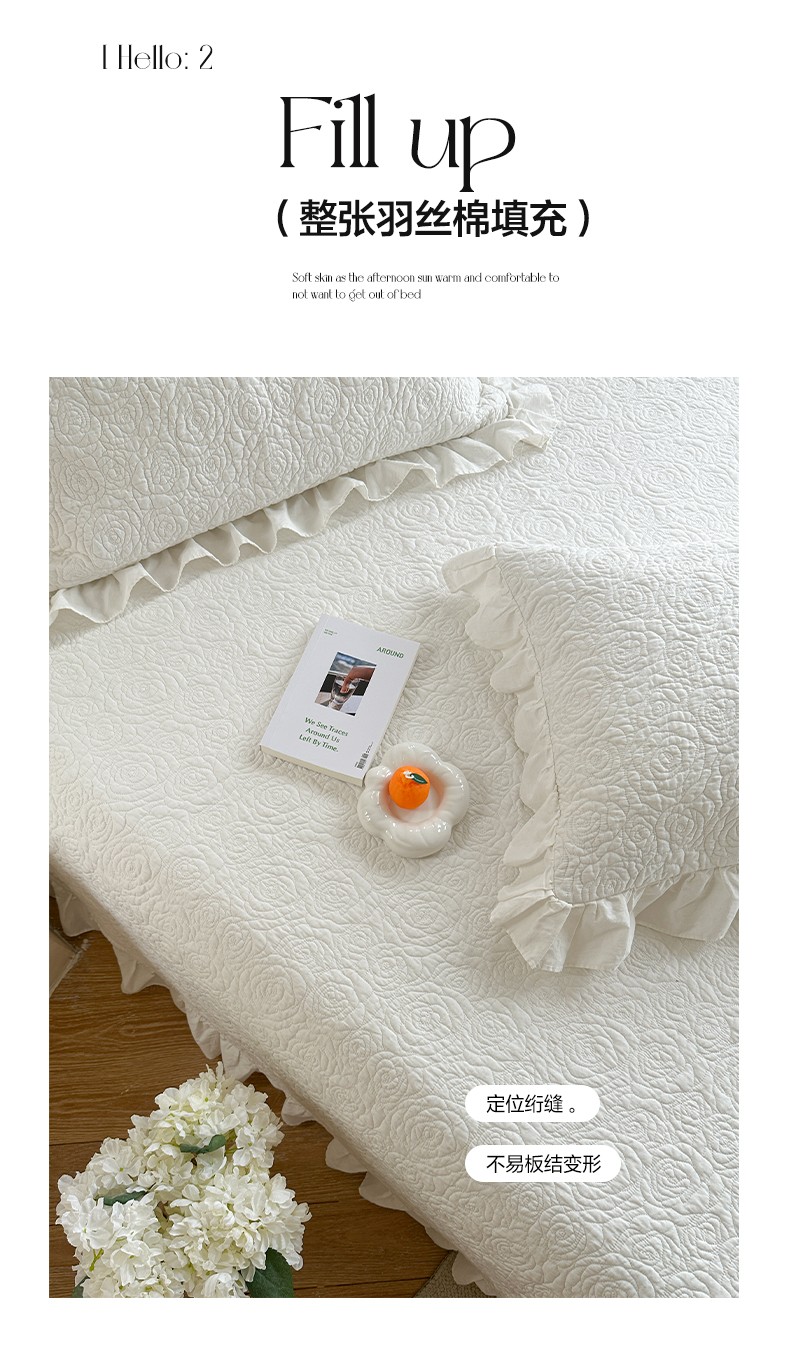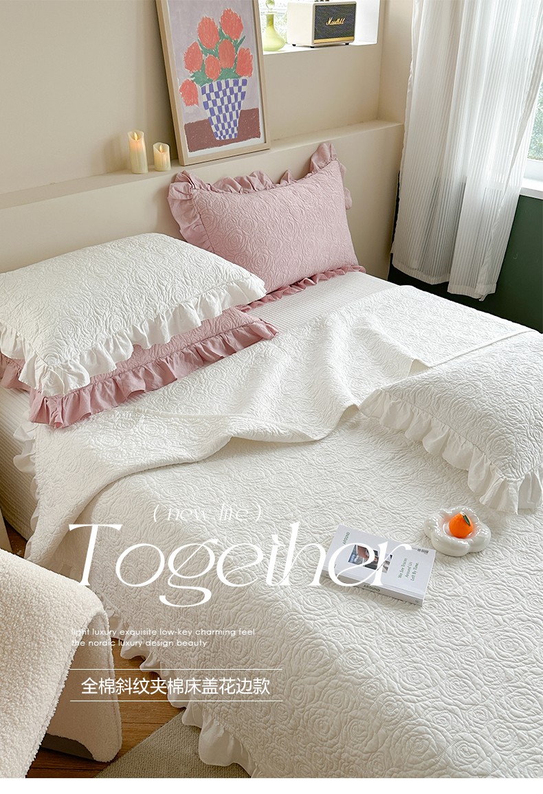 诗黛尔 2023秋冬新款全棉斜纹夹棉床盖花边款-玫瑰花语系列 奶白色