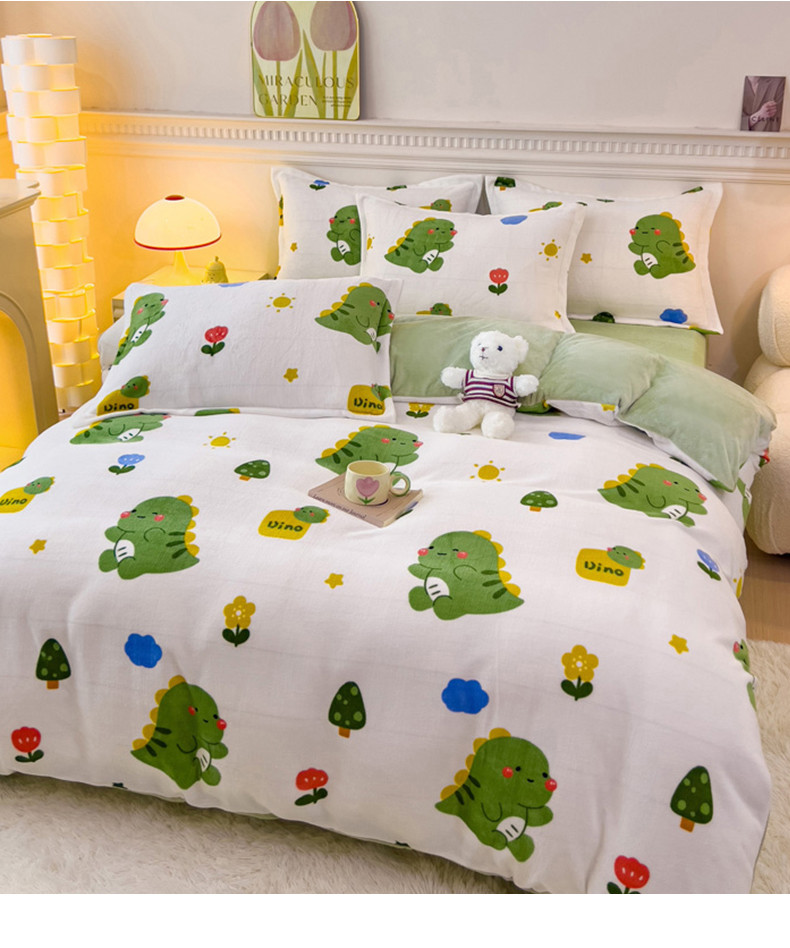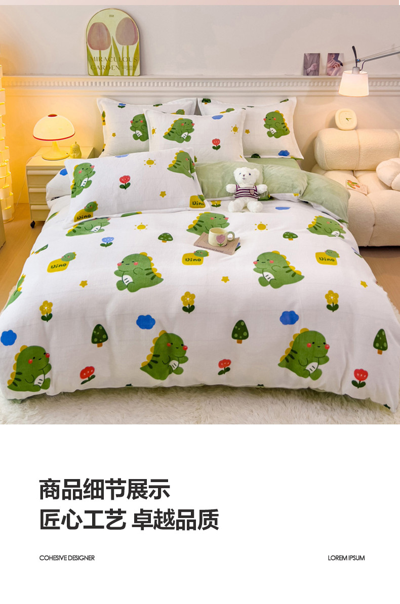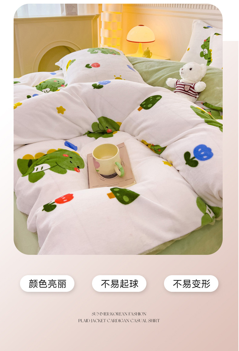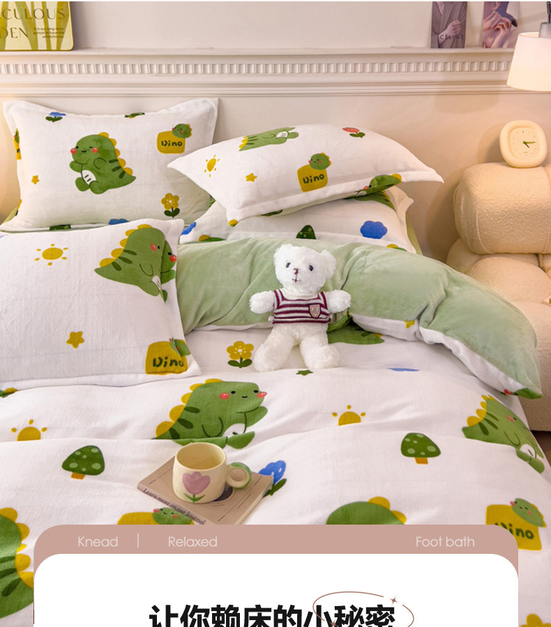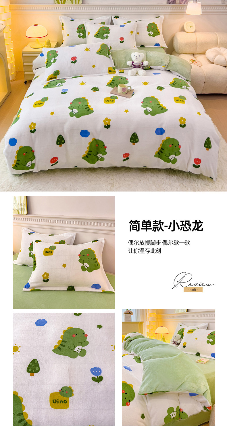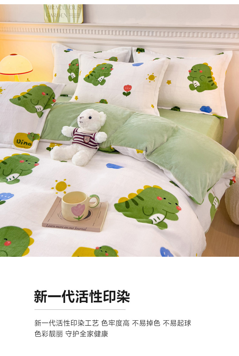 商品名称:宜家坊 2023新款小清新加厚印花牛奶绒四件套 简单款-小恐龙