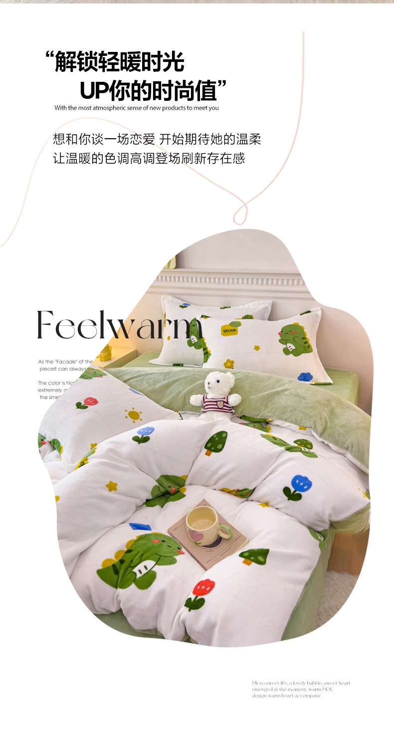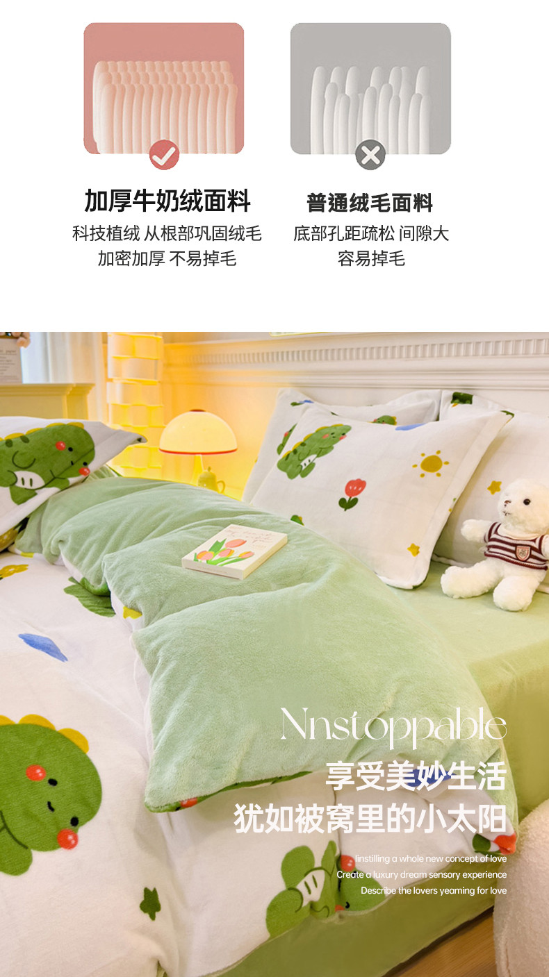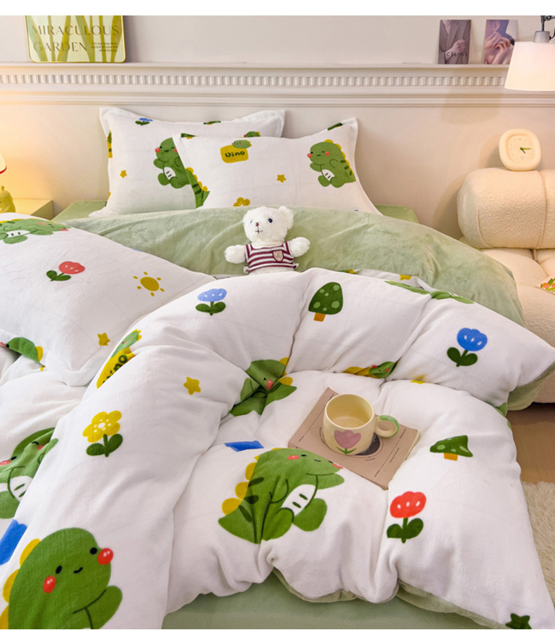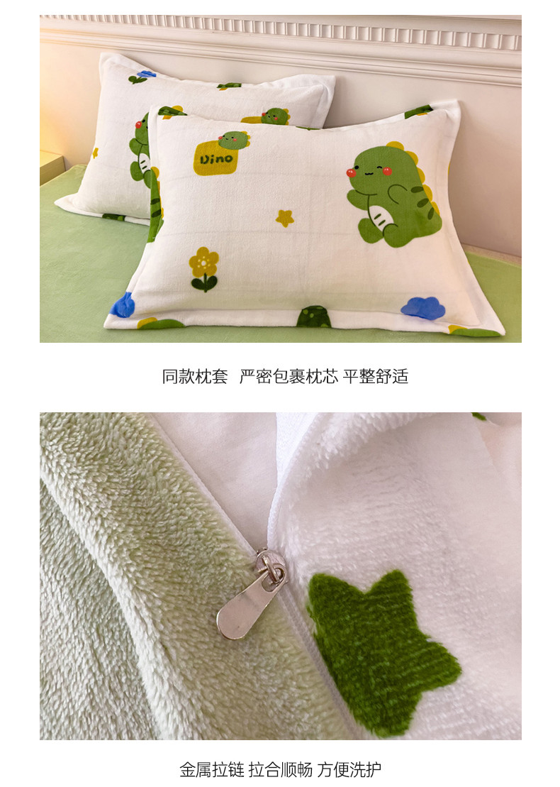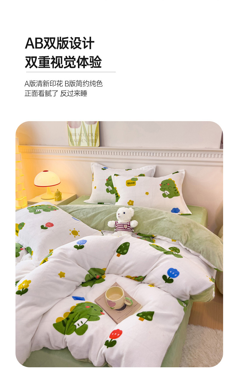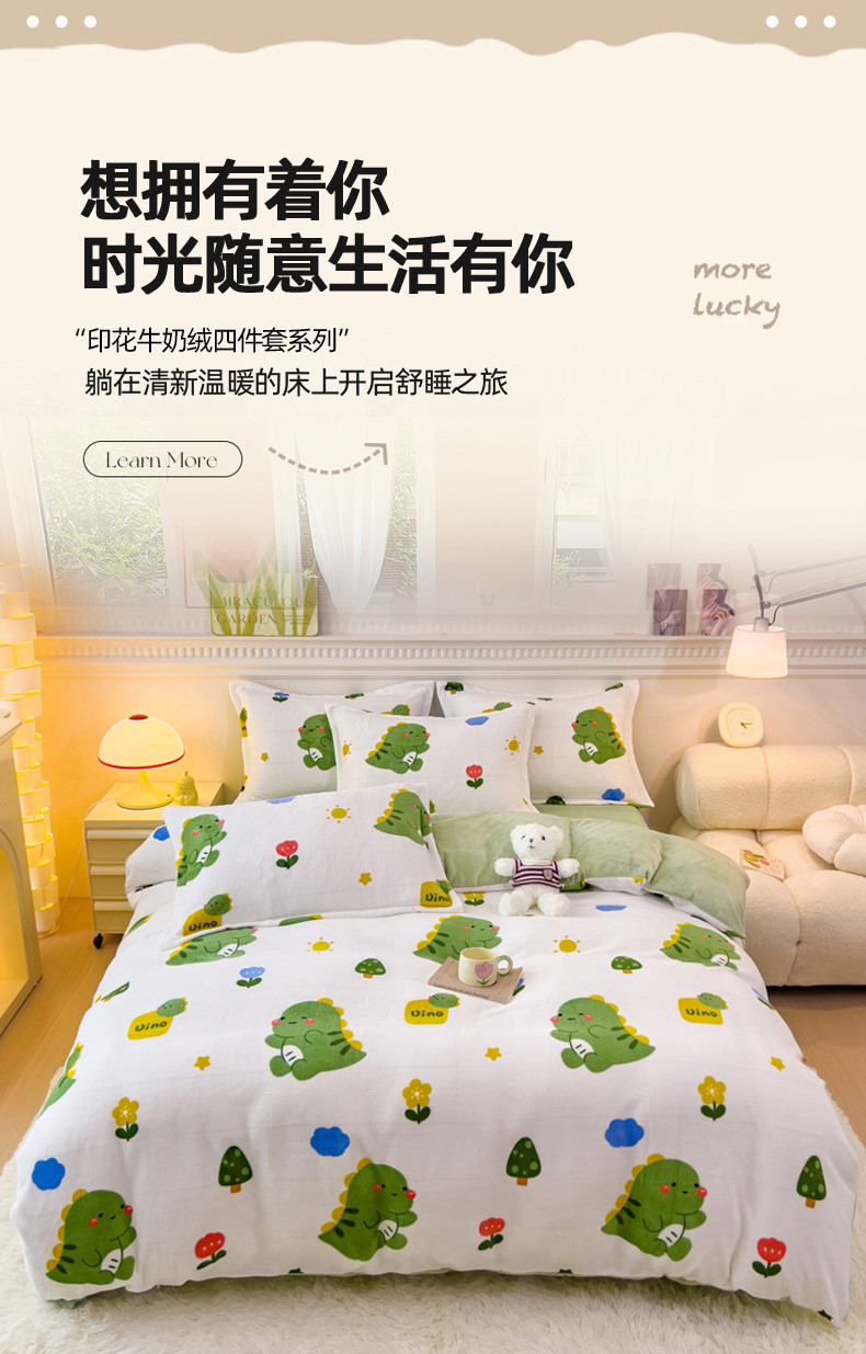 商品名称:宜家坊 2023新款小清新加厚印花牛奶绒四件套 简单款-小恐龙