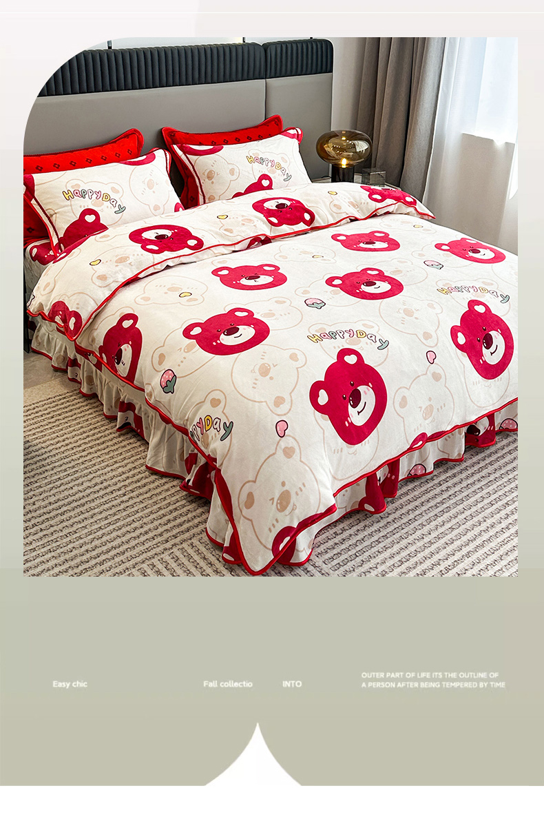 商品名称:欧喜璐 2023新款高克重牛奶绒四件套法莱绒金貂绒8.5斤加厚保暖-印花款 快乐熊
