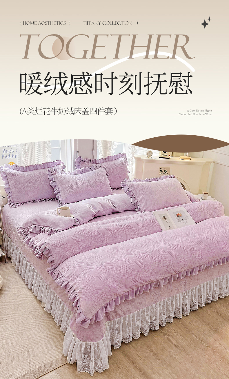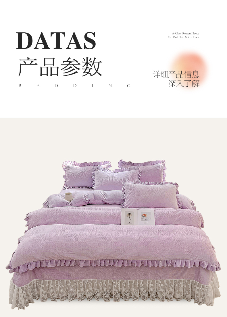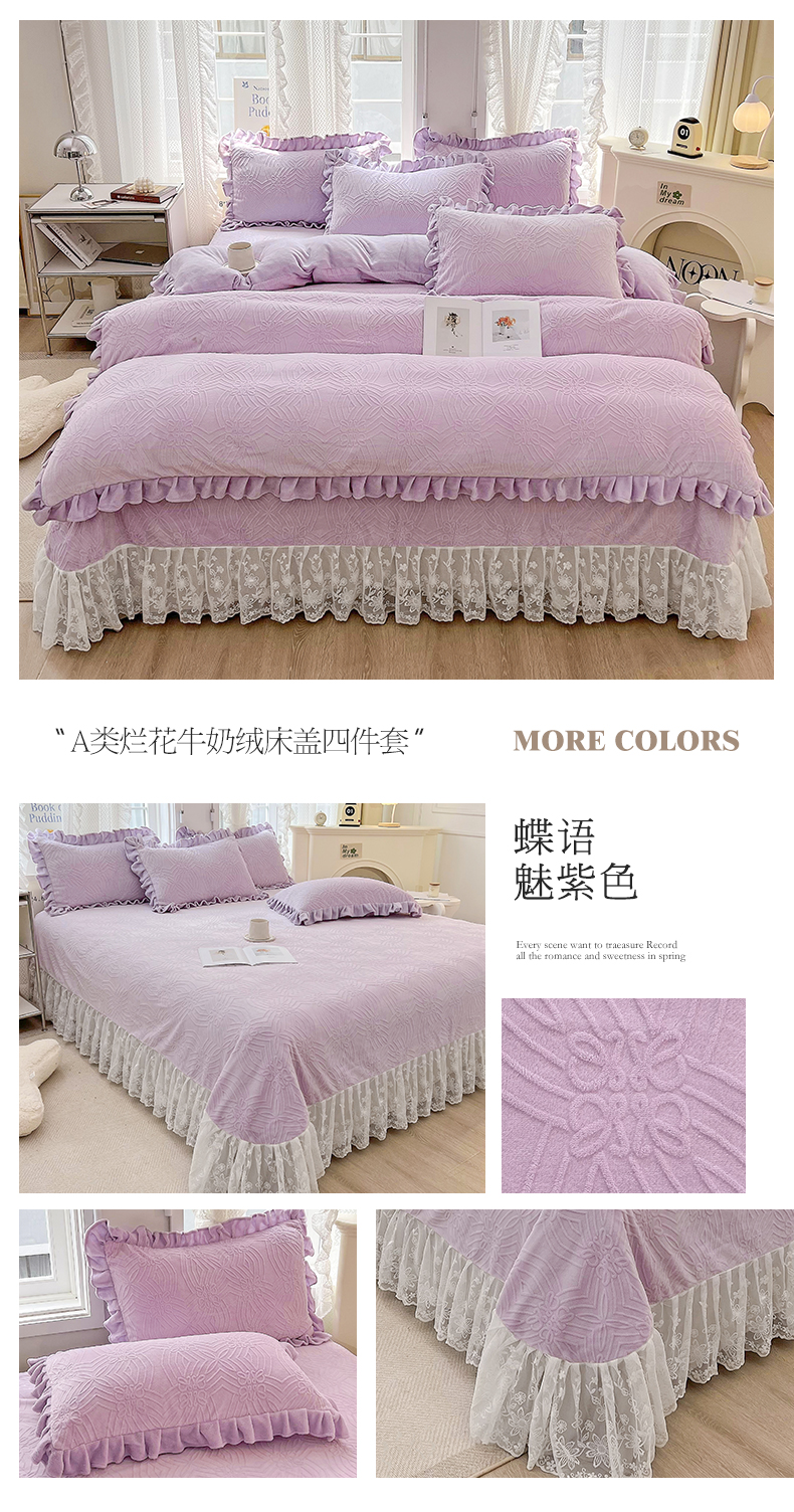 (总)宜凡家纺 2025新款兔绒提花牛奶绒夹棉床裙四件套,爱心 少女粉,爱心 粉紫,爱心 驼色,蝶舞 大红,蝶舞 米色,蝶舞 浅紫,蝶舞 玉色,简爱 苍青,简爱 豆沙紫,简爱 玉色,樱桃 苍青,樱桃 豆沙紫,樱桃 奶油白