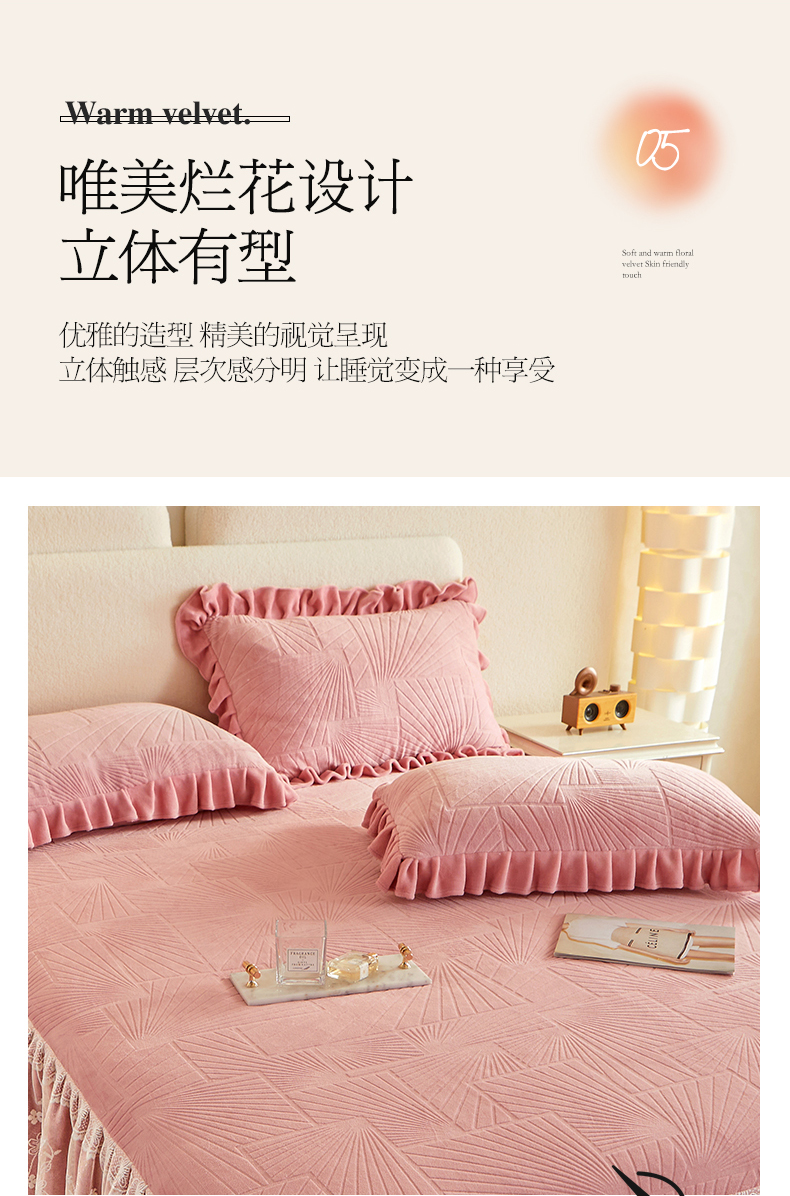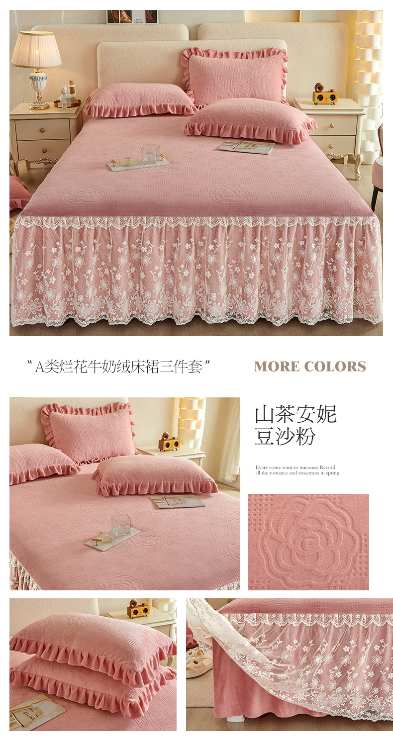 商品名称:宜凡 2023新款烂花牛奶绒床裙三件套 山茶安妮-豆沙粉