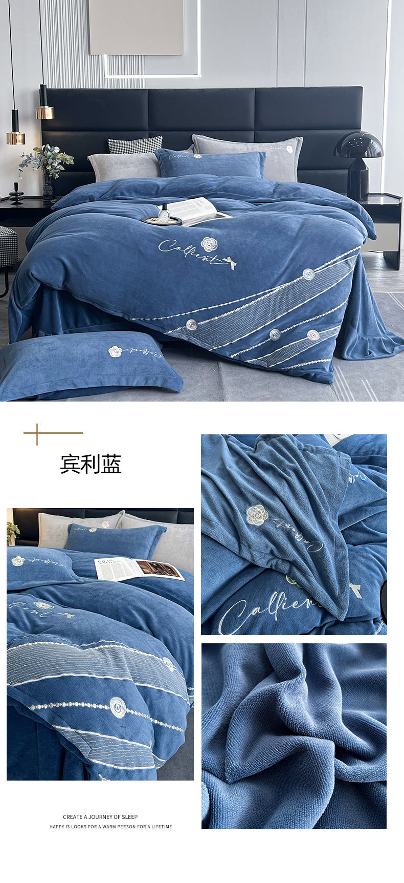 商品名称:丝涟家居 2023牛奶绒绣花四件套-山茶花 蓝色