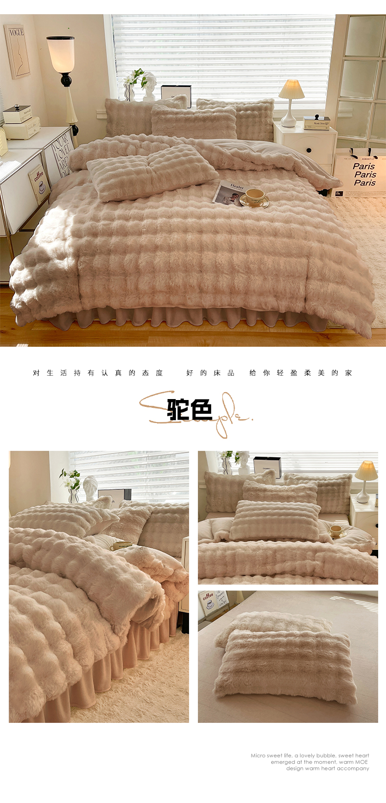 当前位置: 91家纺网 > 商品网购 > 床品套件 > 四件套 > 兔毛绒四件套 > 逸尚阁 2024新款加厚泡泡兔绒四件套 驼色