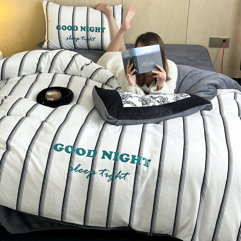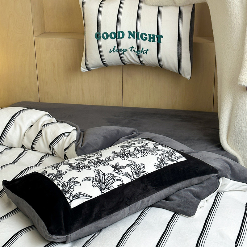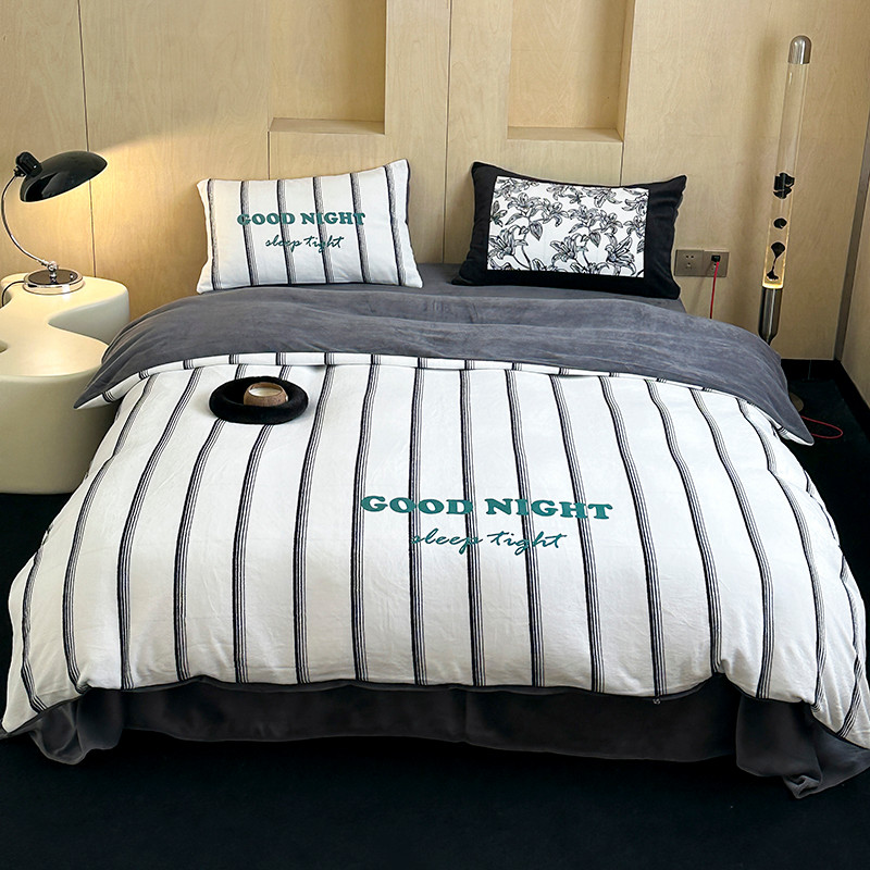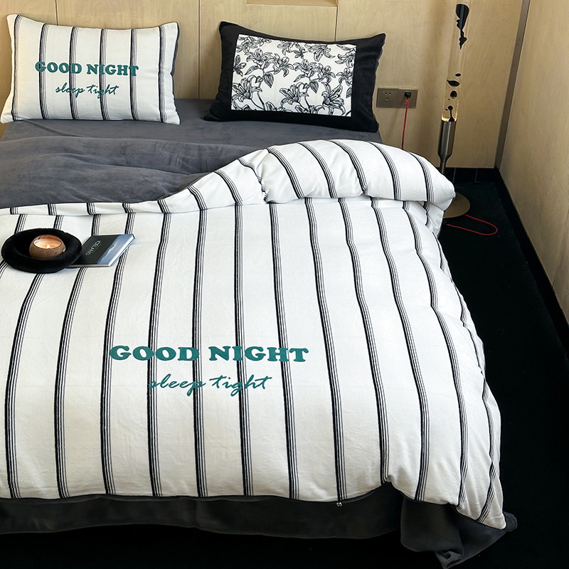 昔可 2023新款大版数码印花牛奶绒四件套 黑条茶歇花