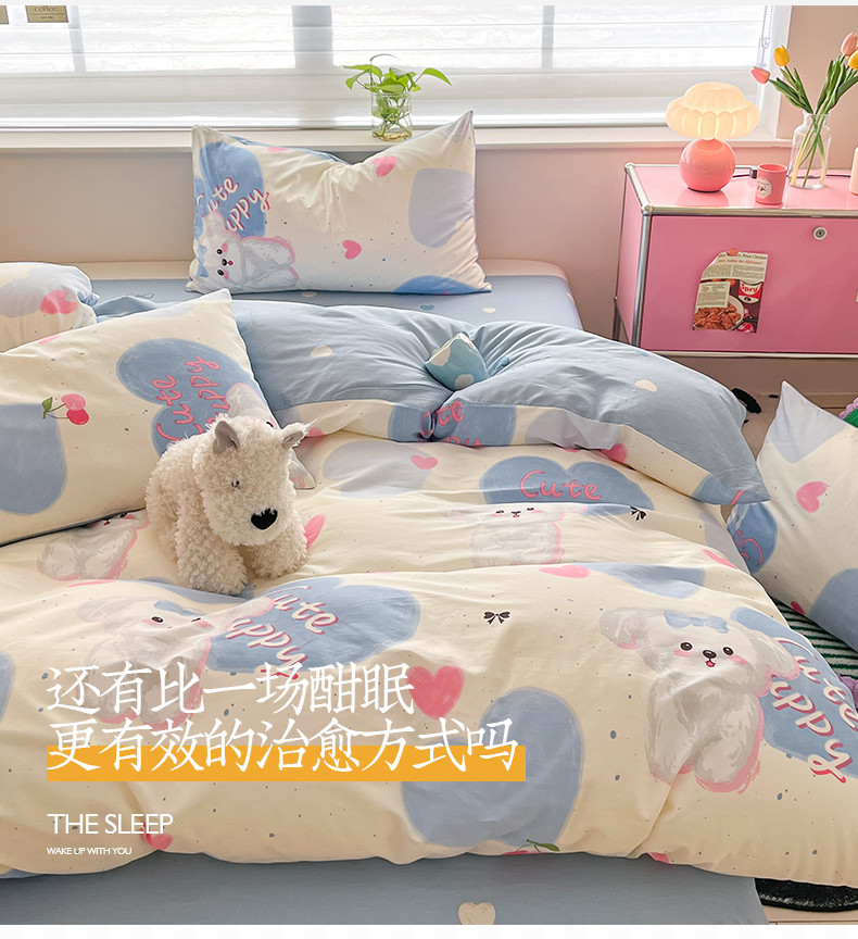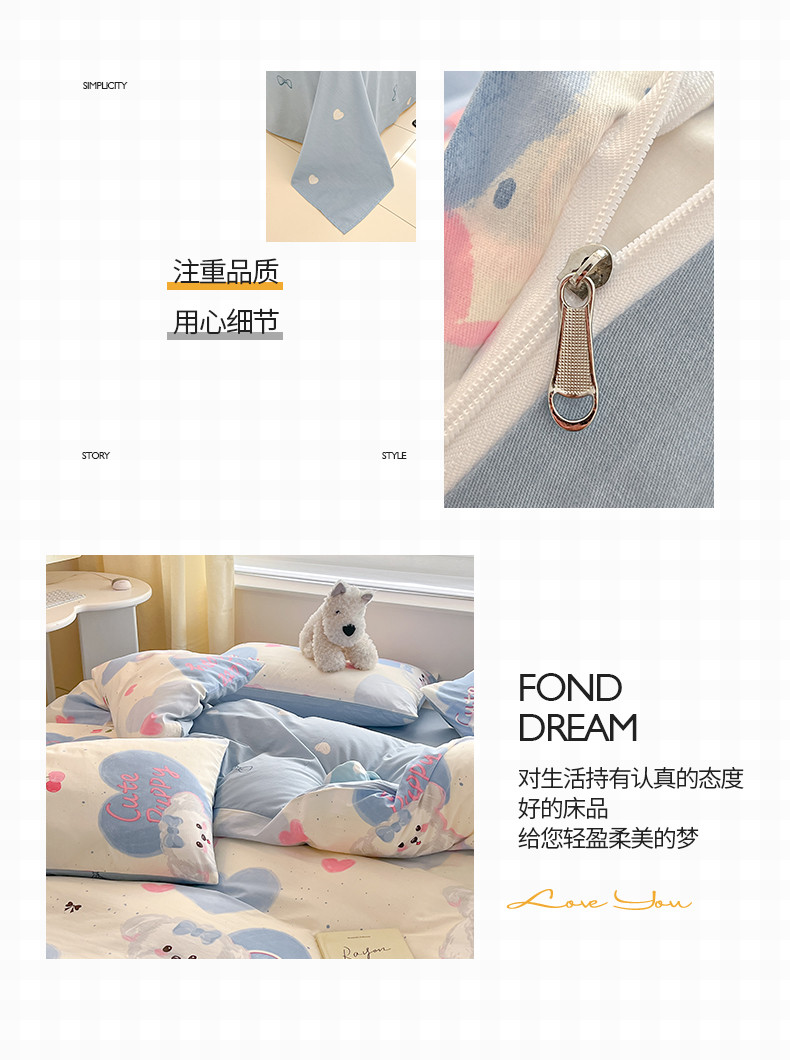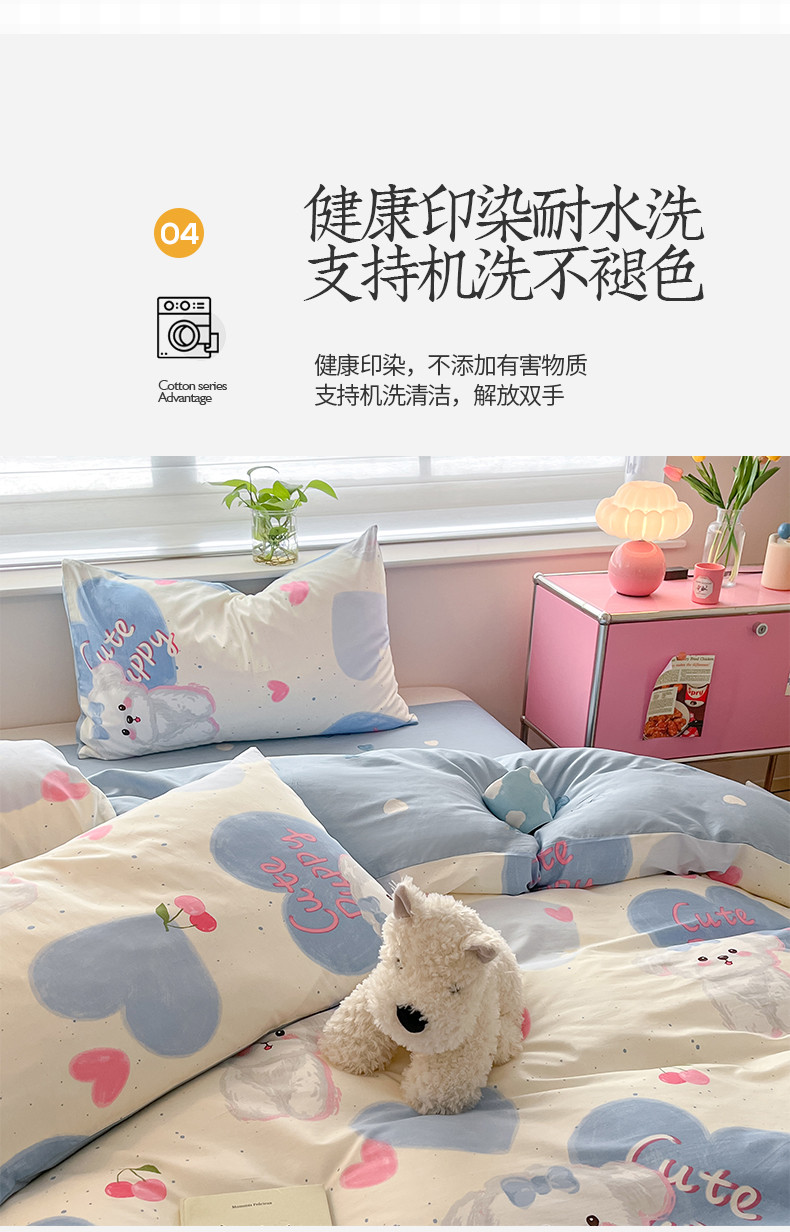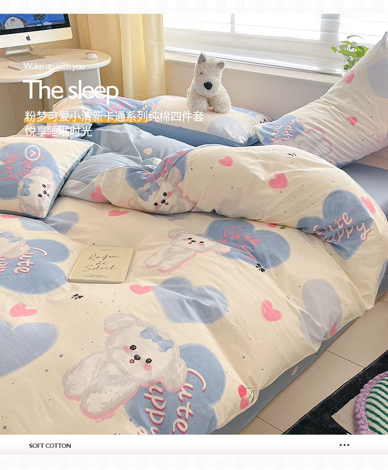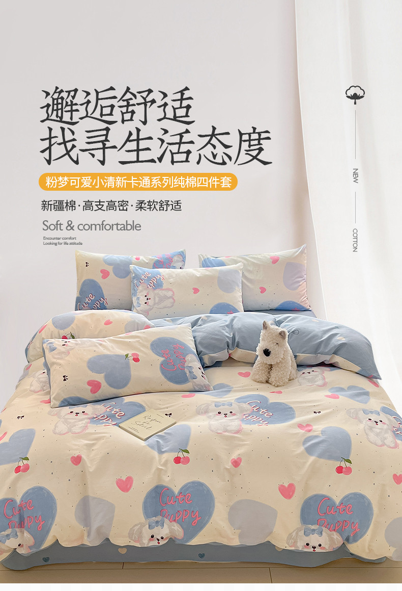 商品名称:桃子家居 2024新款纯棉13372粉梦可爱小清新卡通系列四件套 棉-蓝心萌宠