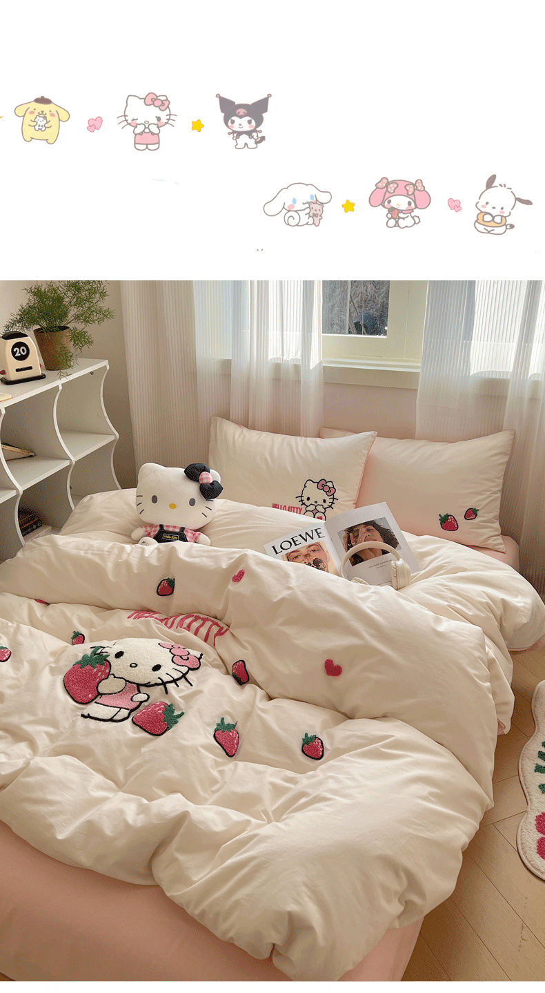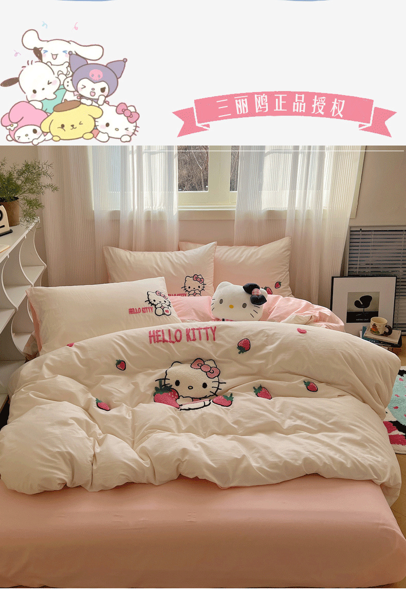 三朵家纺 2024新款春夏全棉三丽鸥毛巾绣四件套 草莓KT
