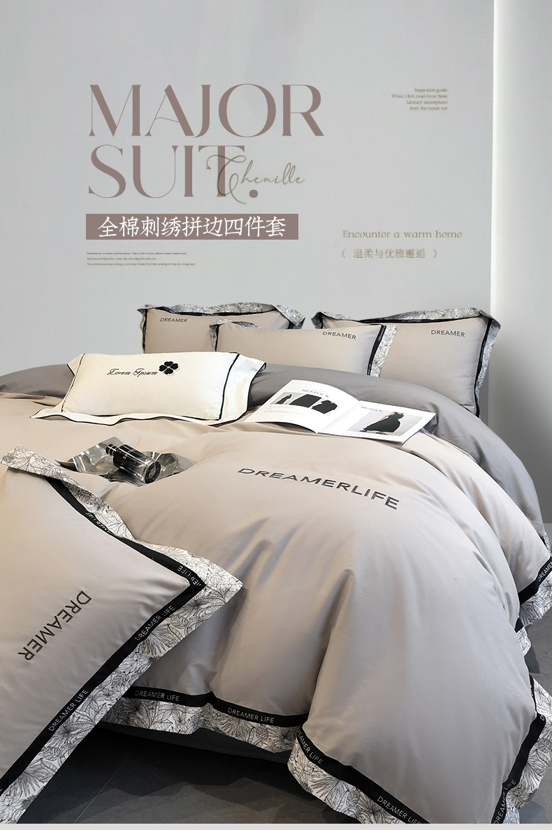 (总)笙意家纺 2025新款全棉刺绣拼边四件套,宾利蓝+山灰,高级灰+山灰,海清+山灰,奶昔白+海清,奶昔白+奶茶,浅豆沙+山灰,山灰+中灰,中灰+山灰