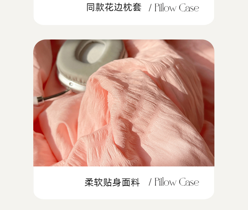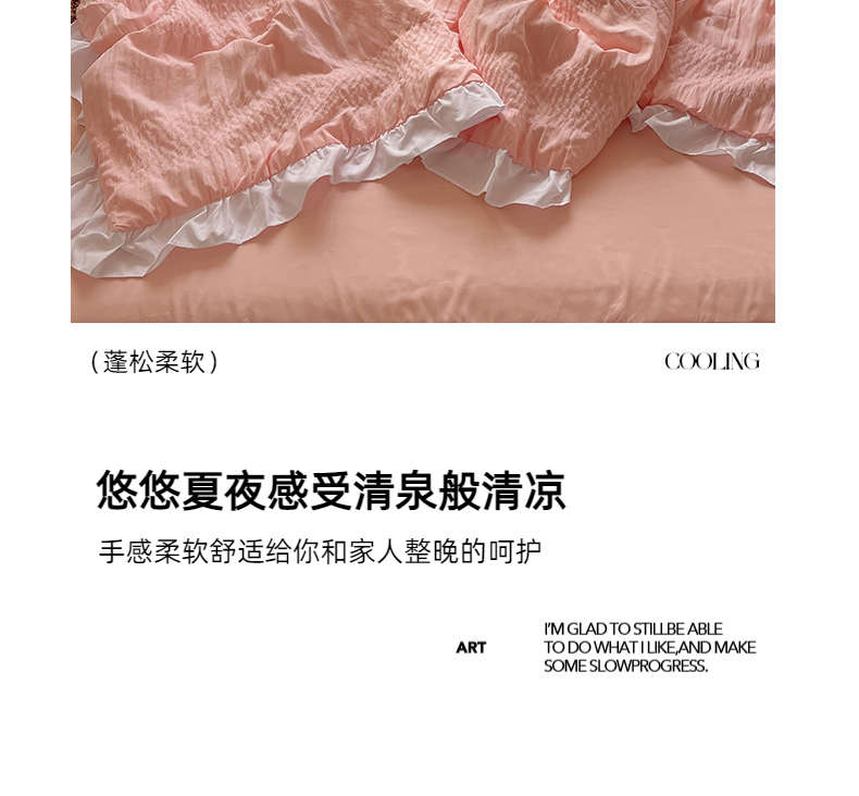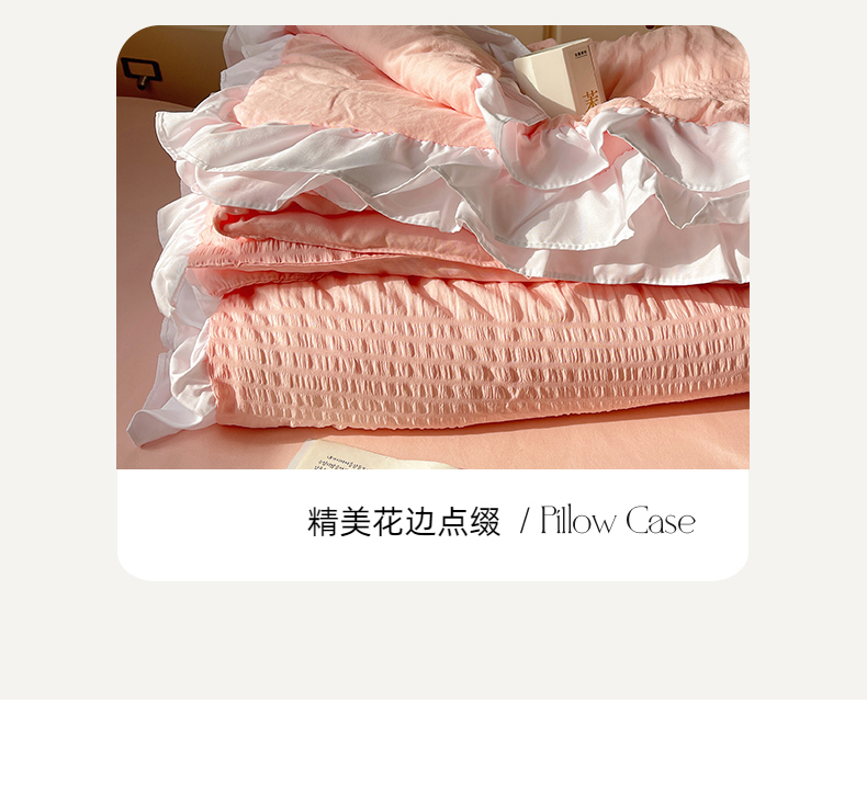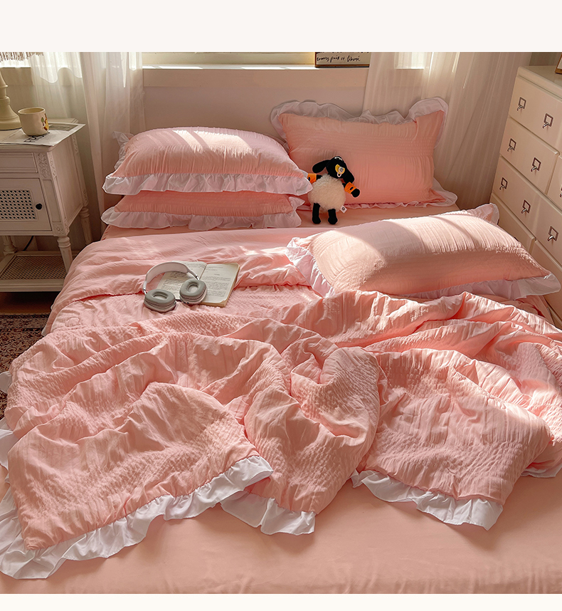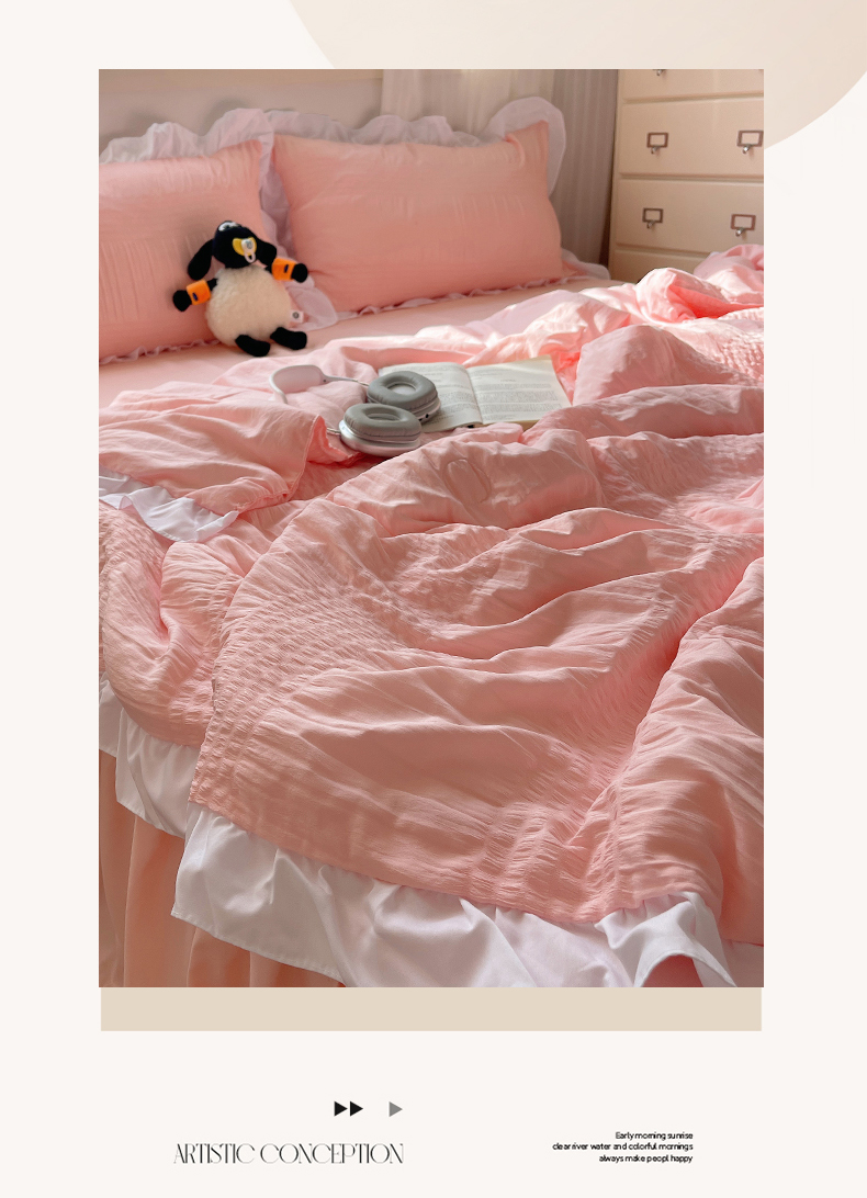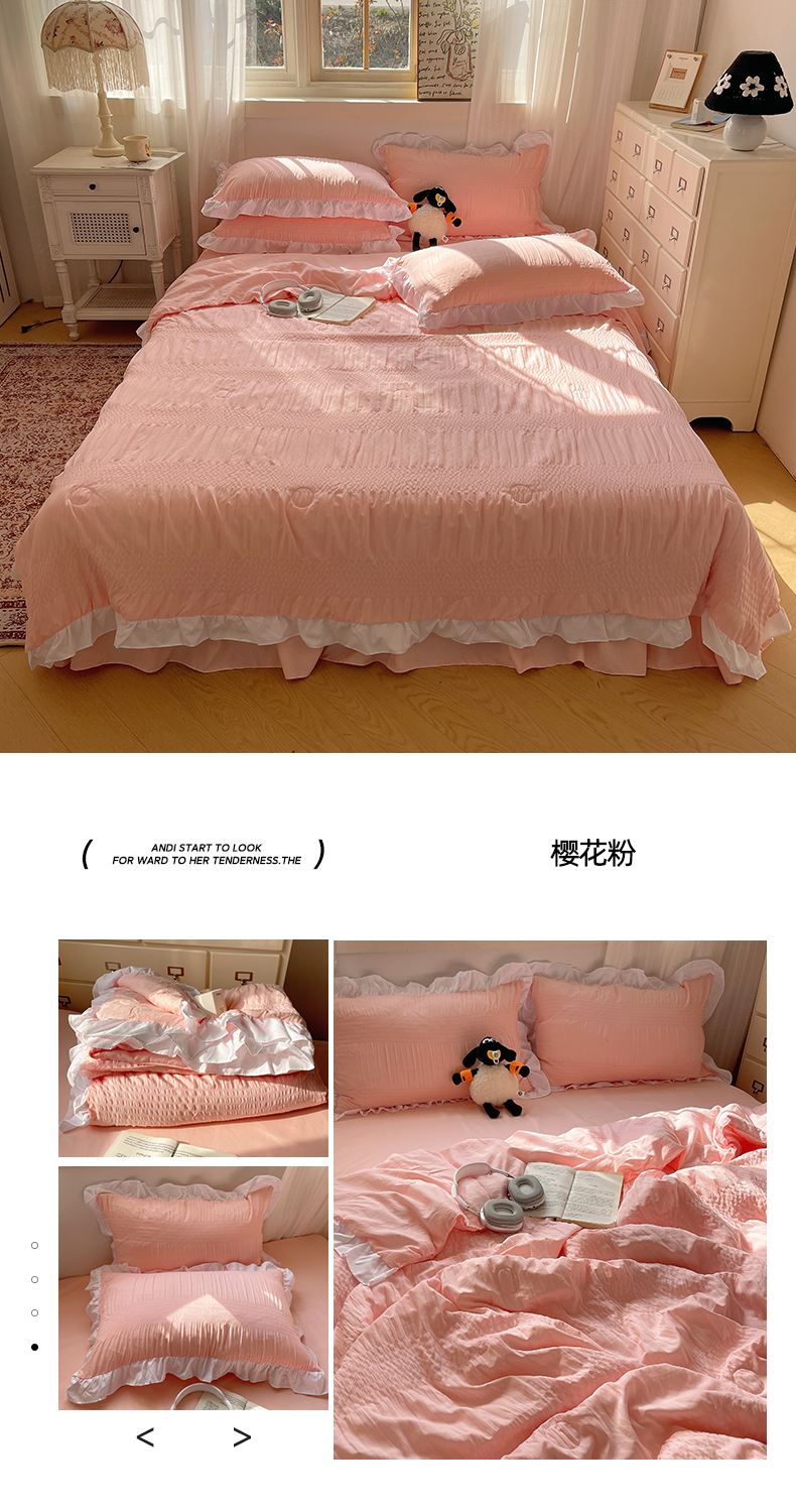 当前位置: 91家纺网 > 商品网购 > 床品套件 > 四件套 > 水洗棉四件套 > 十里居 2024新款泡泡纱韩版花边床裙款水洗棉夏被四件套 樱花粉