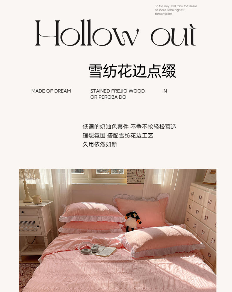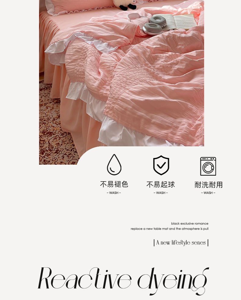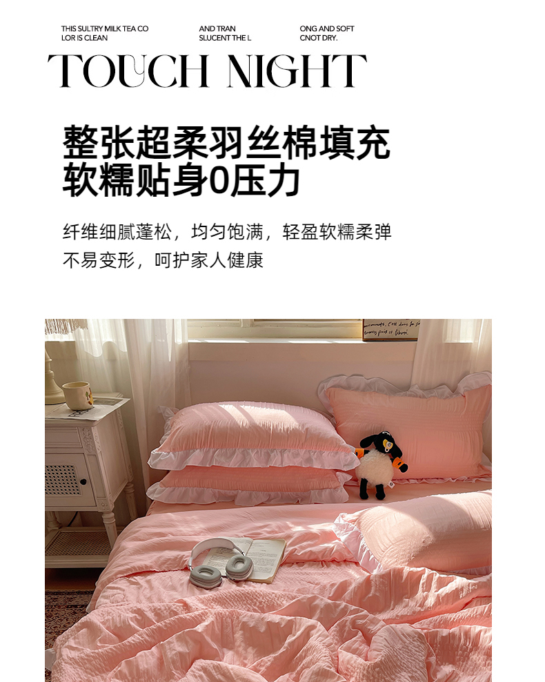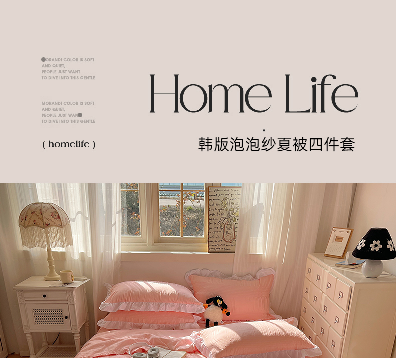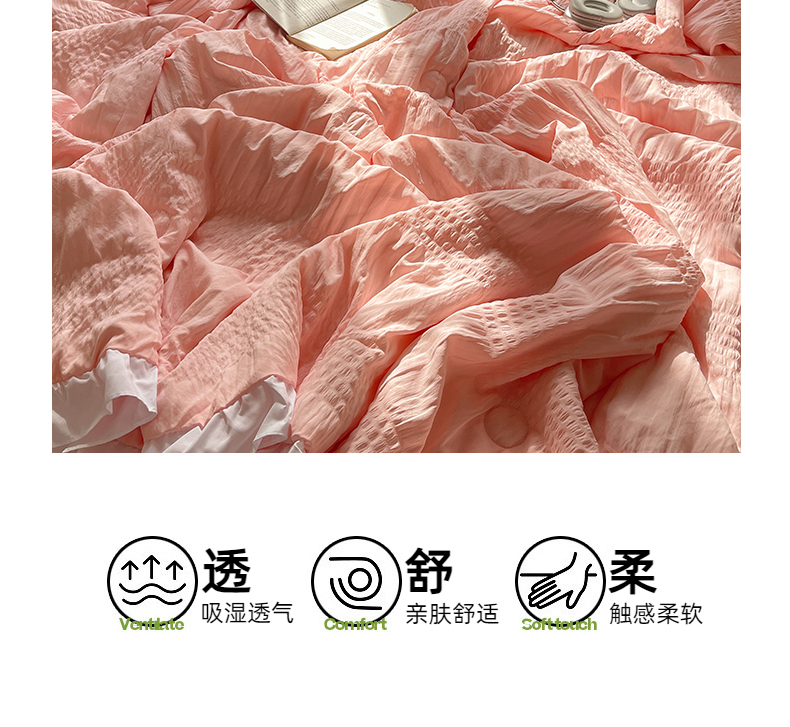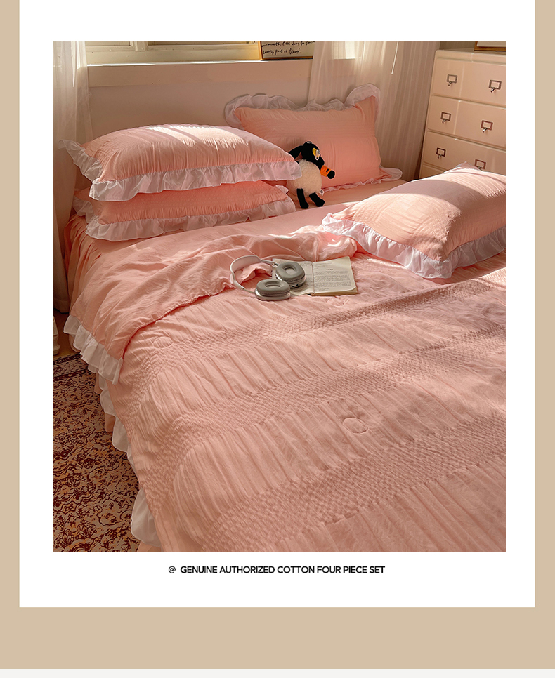当前位置: 91家纺网 > 商品网购 > 床品套件 > 四件套 > 水洗棉四件套 > 十里居 2024新款泡泡纱韩版花边床裙款水洗棉夏被四件套 樱花粉