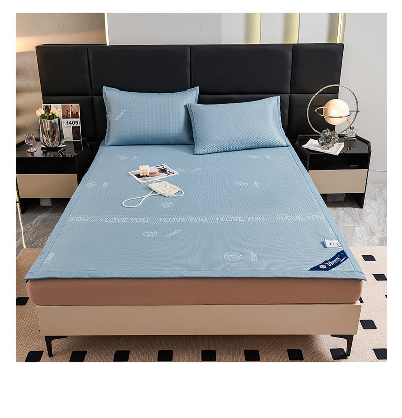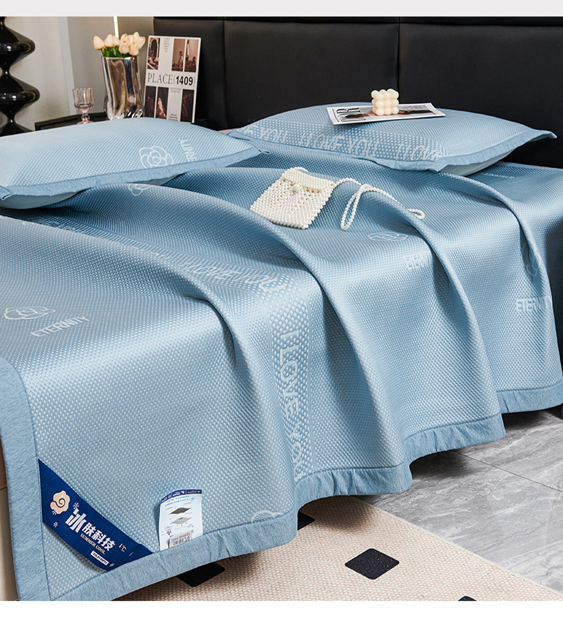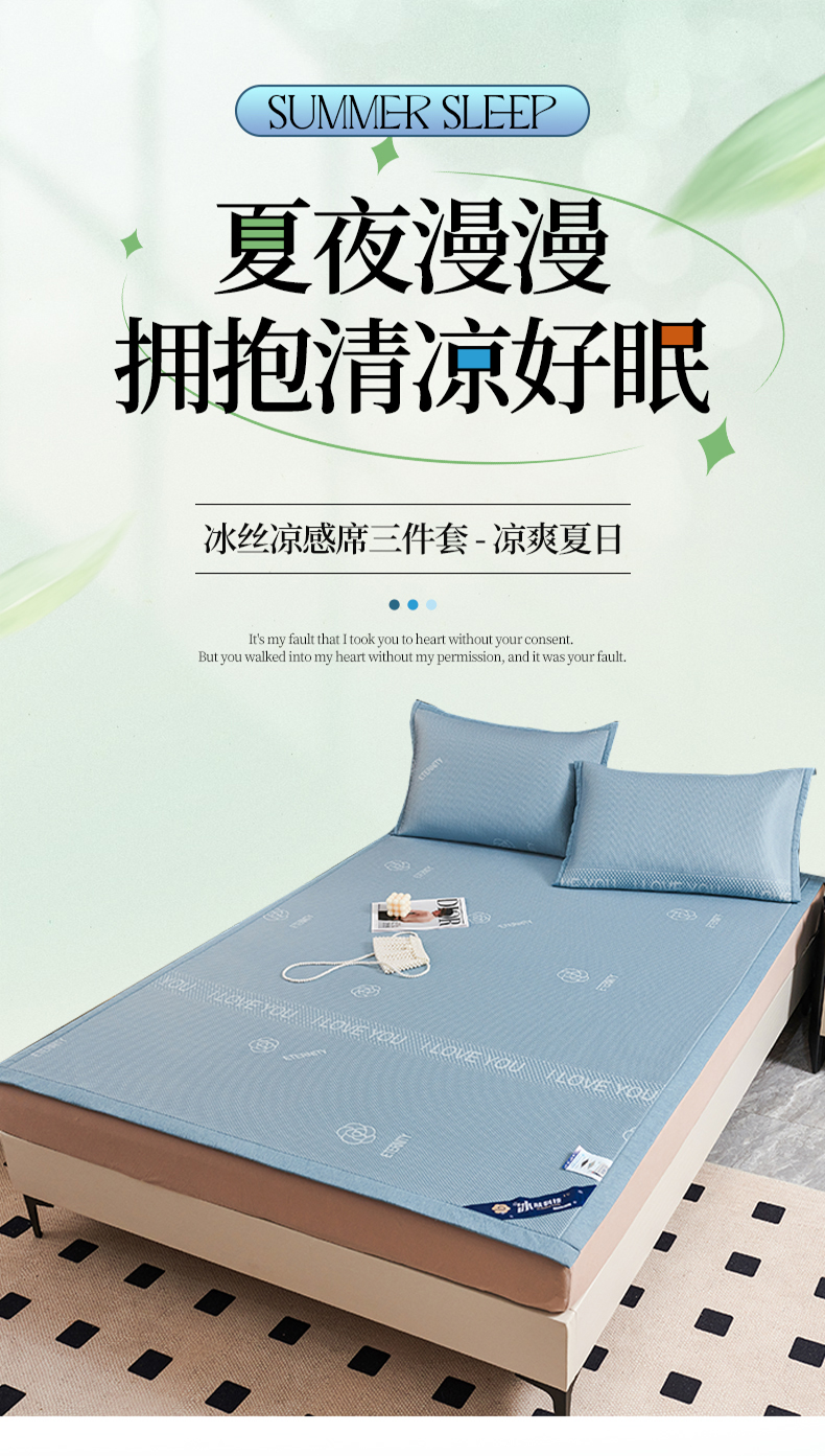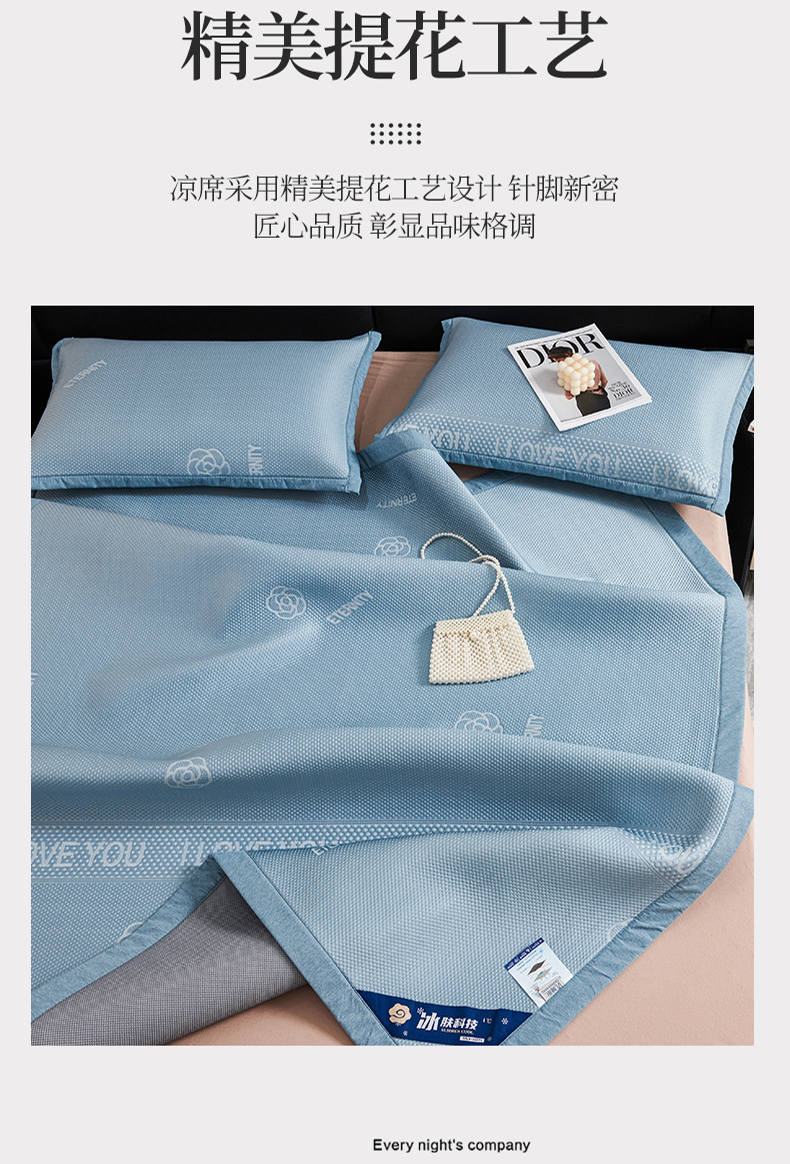 宜派家纺 2024新款凉感丝刺绣凉席三件套 小花-蓝-床笠