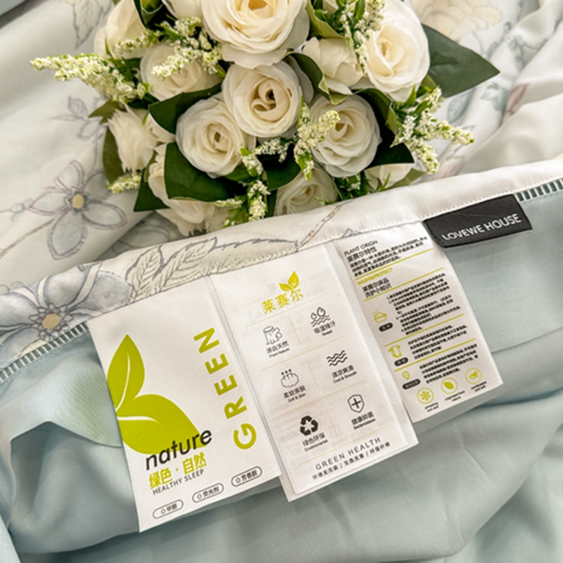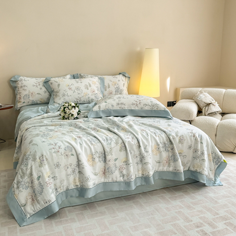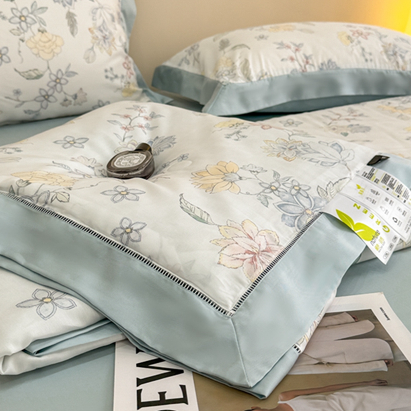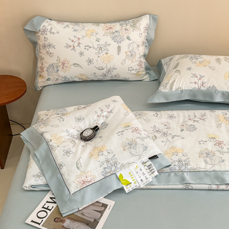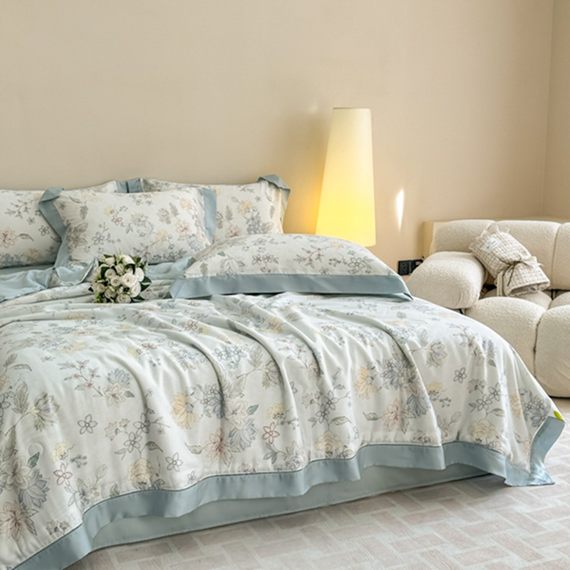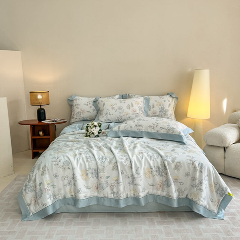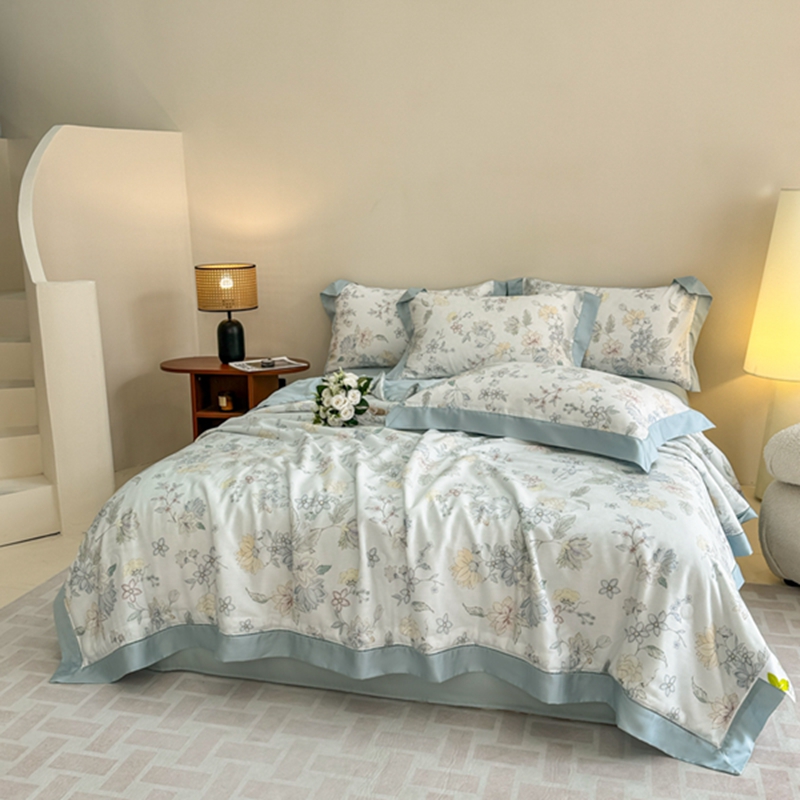 商品名称:若未2025新款法式莱赛尔天丝印花镂空夏被和夏被四件套 春日蜜糖(兰)